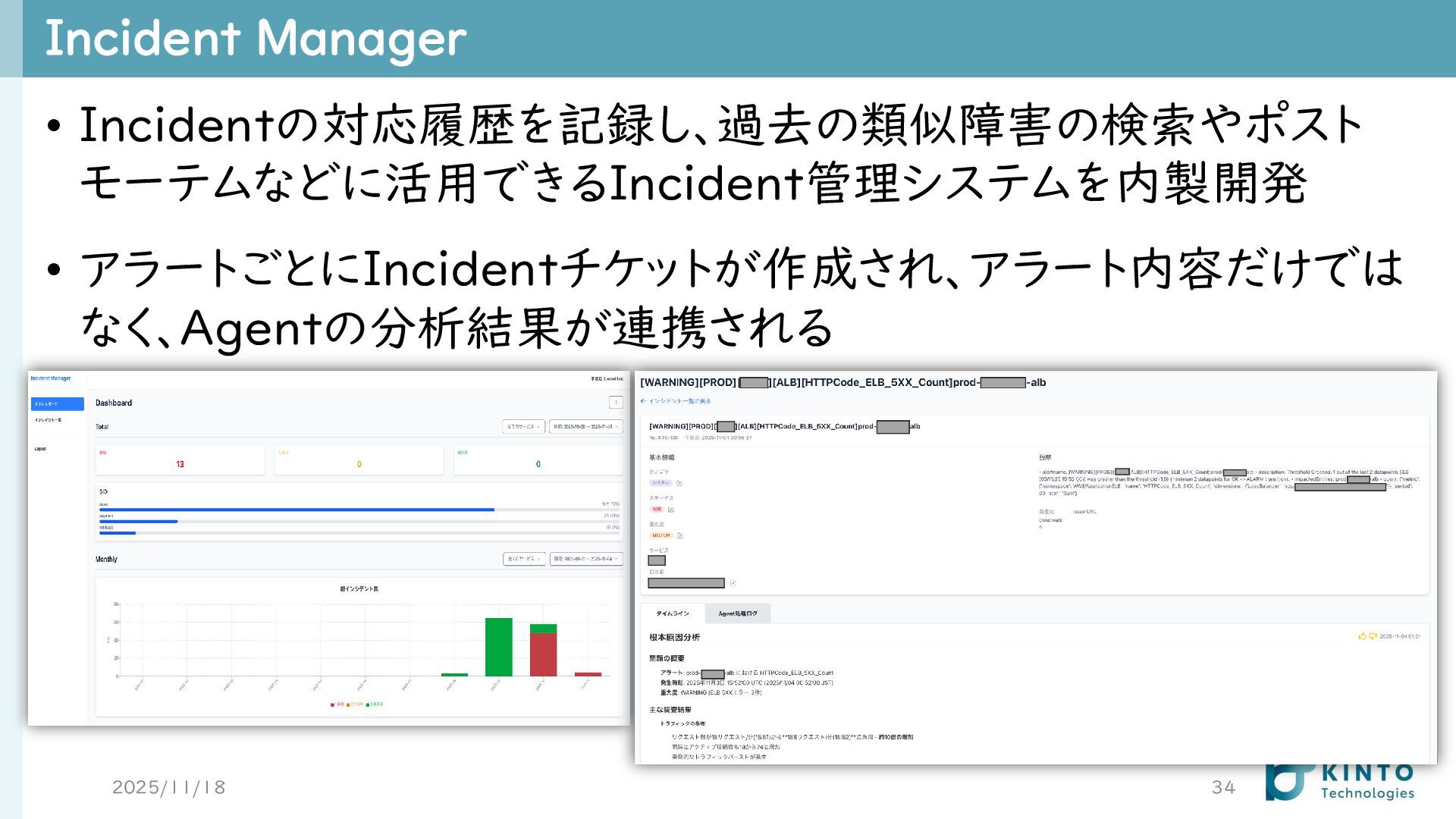Incident Manager 2025/11/18 34 • Incidentの対応履歴を記録し、過去の類似障害の検索やポスト モーテムなどに活用できるIncident管理システムを内製開発 • アラートごとにIncidentチケットが作成され、アラート内容だけでは なく、Agentの分析結果が連携される