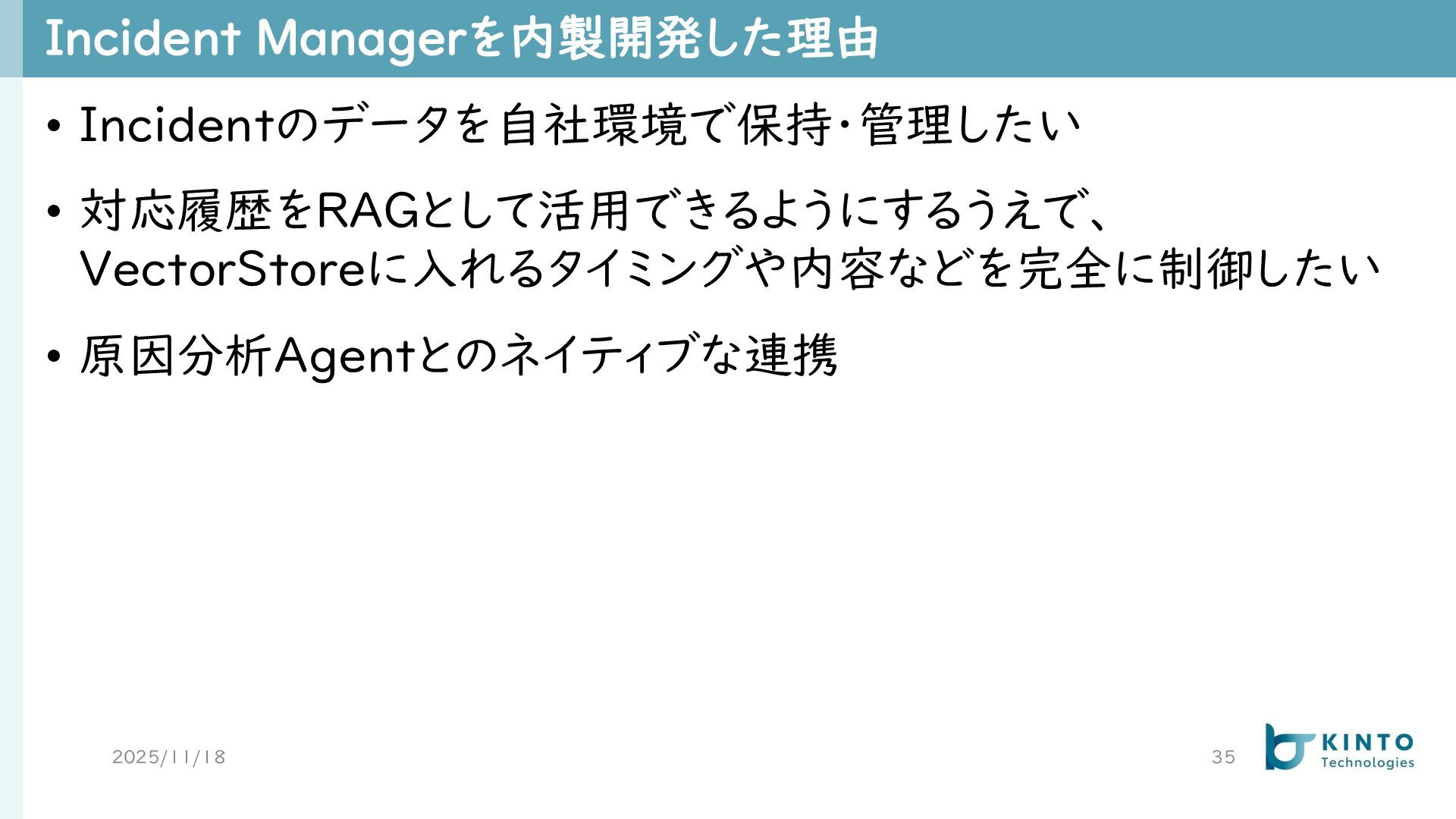 Incident Managerを内製開発した理由 2025/11/18 35 • Incidentのデータを自社環境で保持・管理したい • 対応履歴をRAGとして活用できるようにするうえで、 VectorStoreに入れるタイミングや内容などを完全に制御したい •