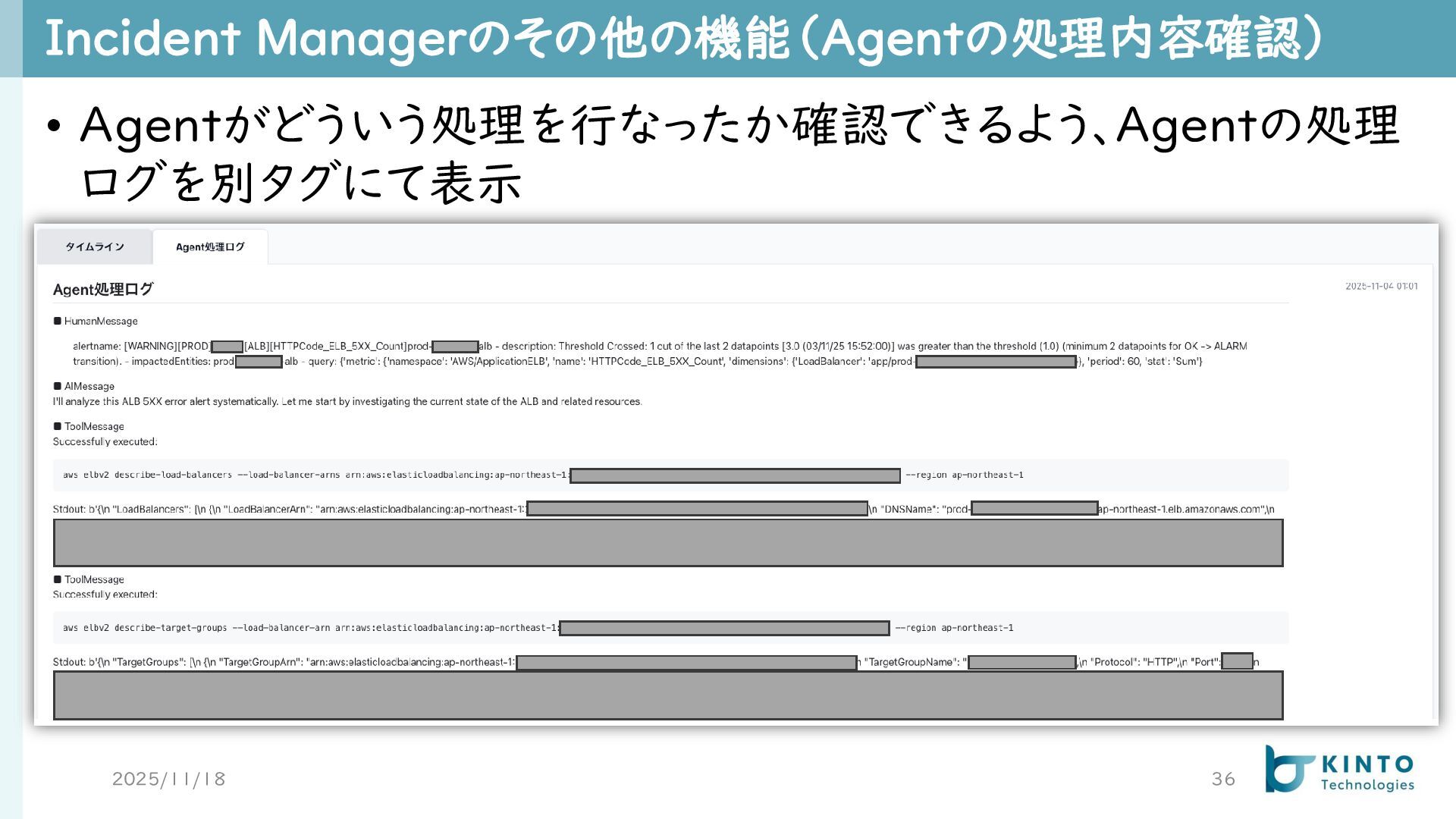 Incident Managerのその他の機能(Agentの処理内容確認) 2025/11/18 36 • Agentがどういう処理を行なったか確認できるよう、Agentの処理 ログを別タグにて表示