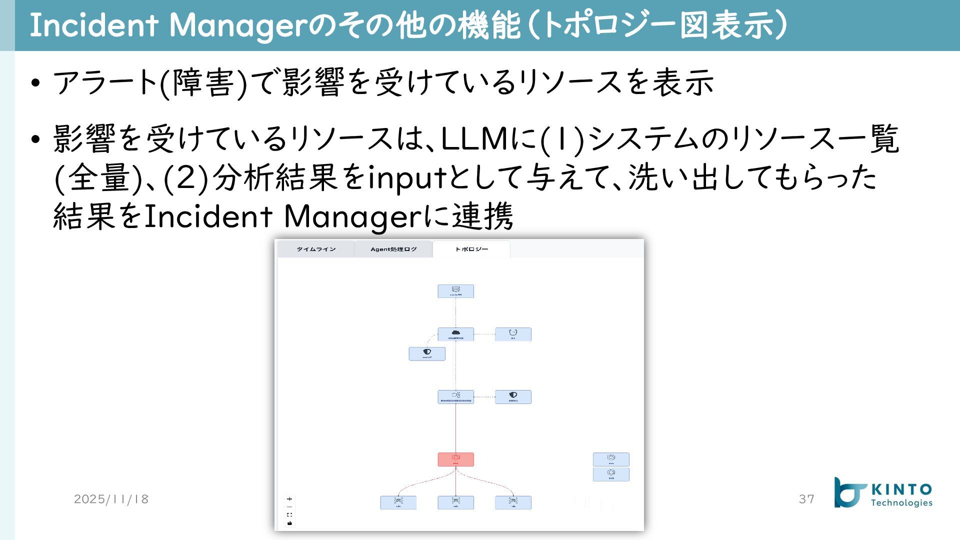 Incident Managerのその他の機能(トポロジー図表示) 2025/11/18 37 • アラート(障害)で影響を受けているリソースを表示 • 影響を受けているリソースは、LLMに(1)システムのリソース一覧 (全量)、(2)分析結果をinputとして与えて、洗い出してもらった 結果をIncident
