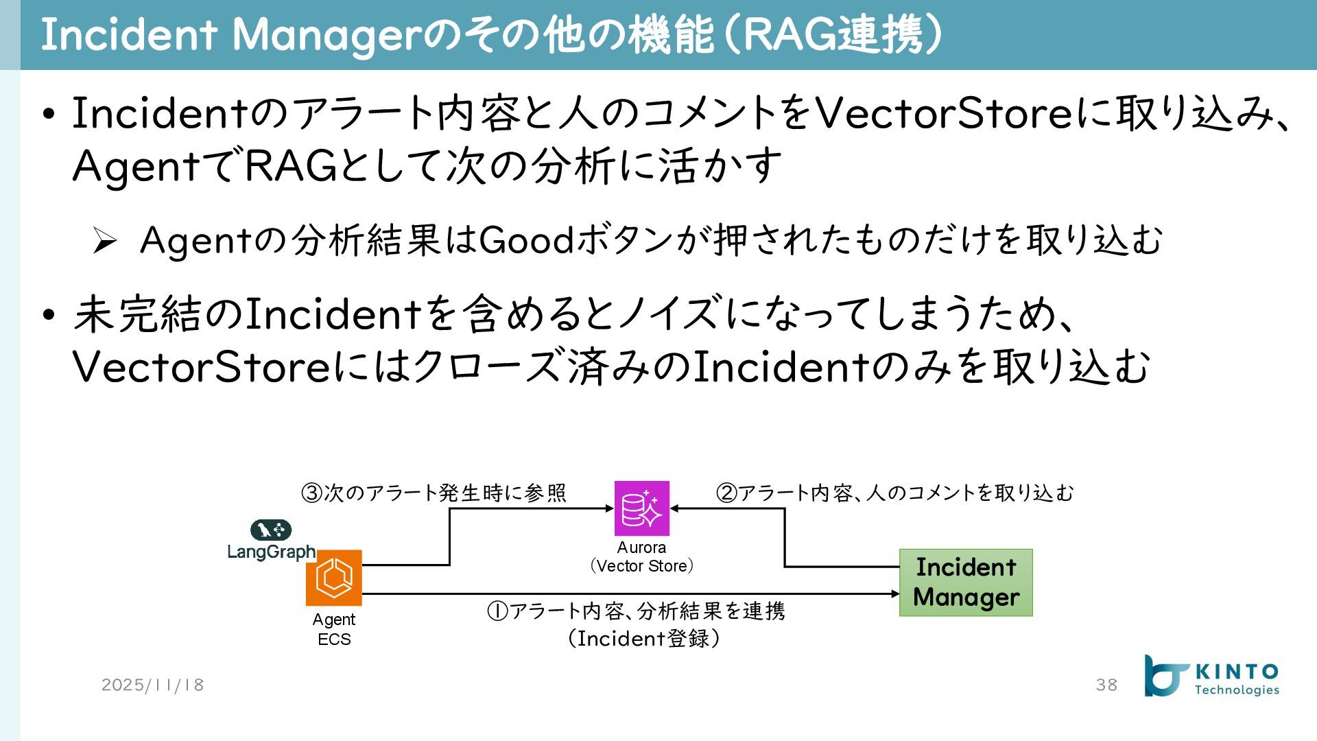 Incident Managerのその他の機能(RAG連携) 2025/11/18 38 • Incidentのアラート内容と人のコメントをVectorStoreに取り込み、 AgentでRAGとして次の分析に活かす ➢ Agentの分析結果はGoodボタンが押されたものだけを取り込む •
