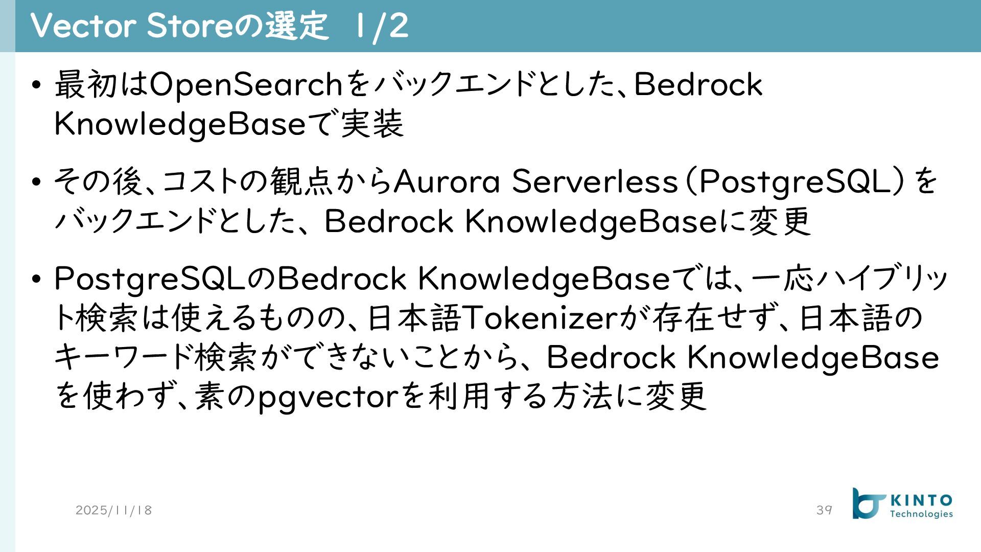 Vector Storeの選定 1/2 2025/11/18 39 • 最初はOpenSearchをバックエンドとした、Bedrock KnowledgeBaseで実装 • その後、コストの観点からAurora