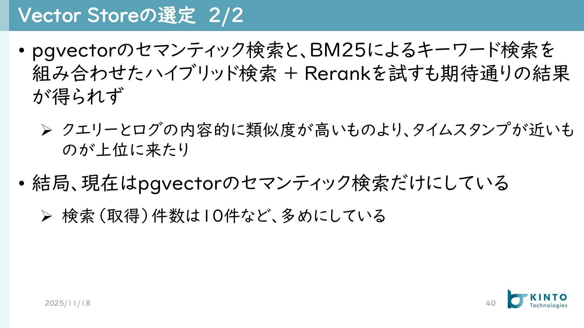 Vector Storeの選定 2/2 2025/11/18 40 • pgvectorのセマンティック検索と、BM25によるキーワード検索を 組み合わせたハイブリッド検索 + Rerankを試すも期待通りの結果