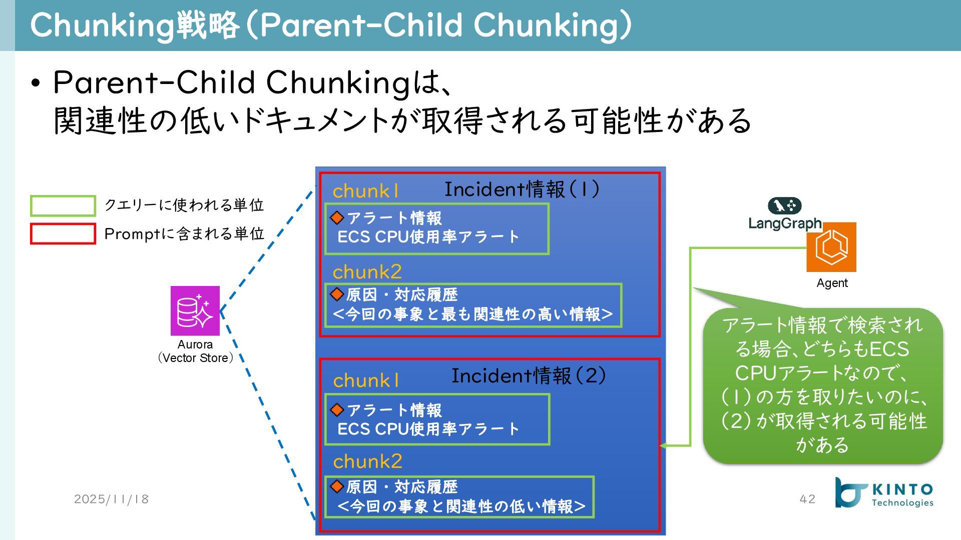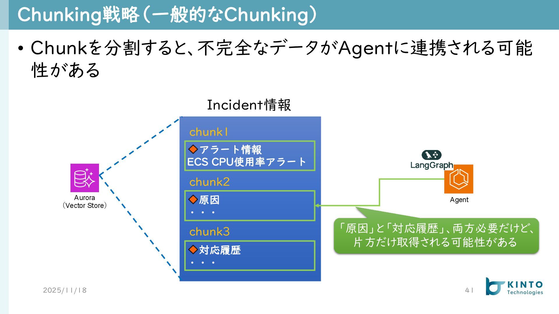 Chunking戦略(一般的なChunking) 2025/11/18 41 • Chunkを分割すると、不完全なデータがAgentに連携される可能 性がある Aurora (Vector Store) アラート情報