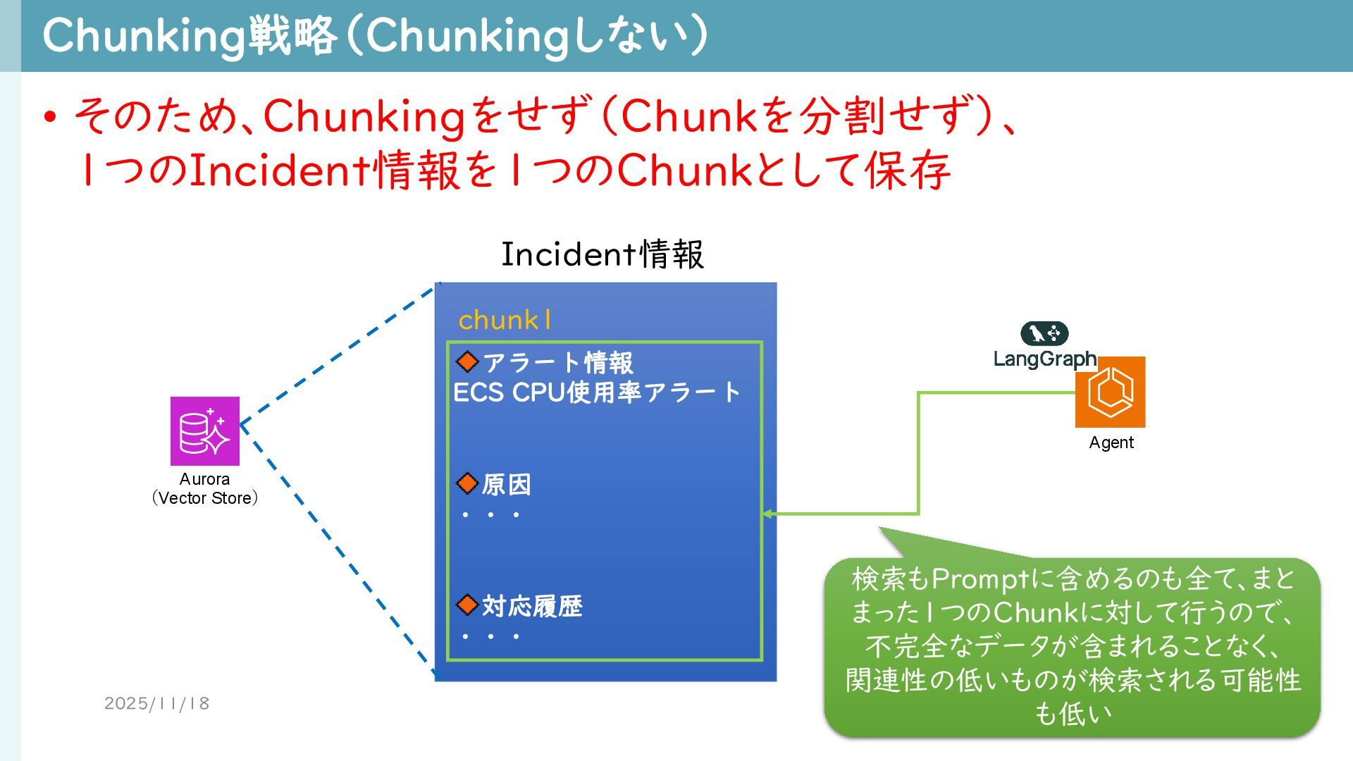 Chunking戦略(Chunkingしない) 2025/11/18 43 • そのため、Chunkingをせず(Chunkを分割せず)、 1つのIncident情報を1つのChunkとして保存 Aurora (Vector Store) アラート情報