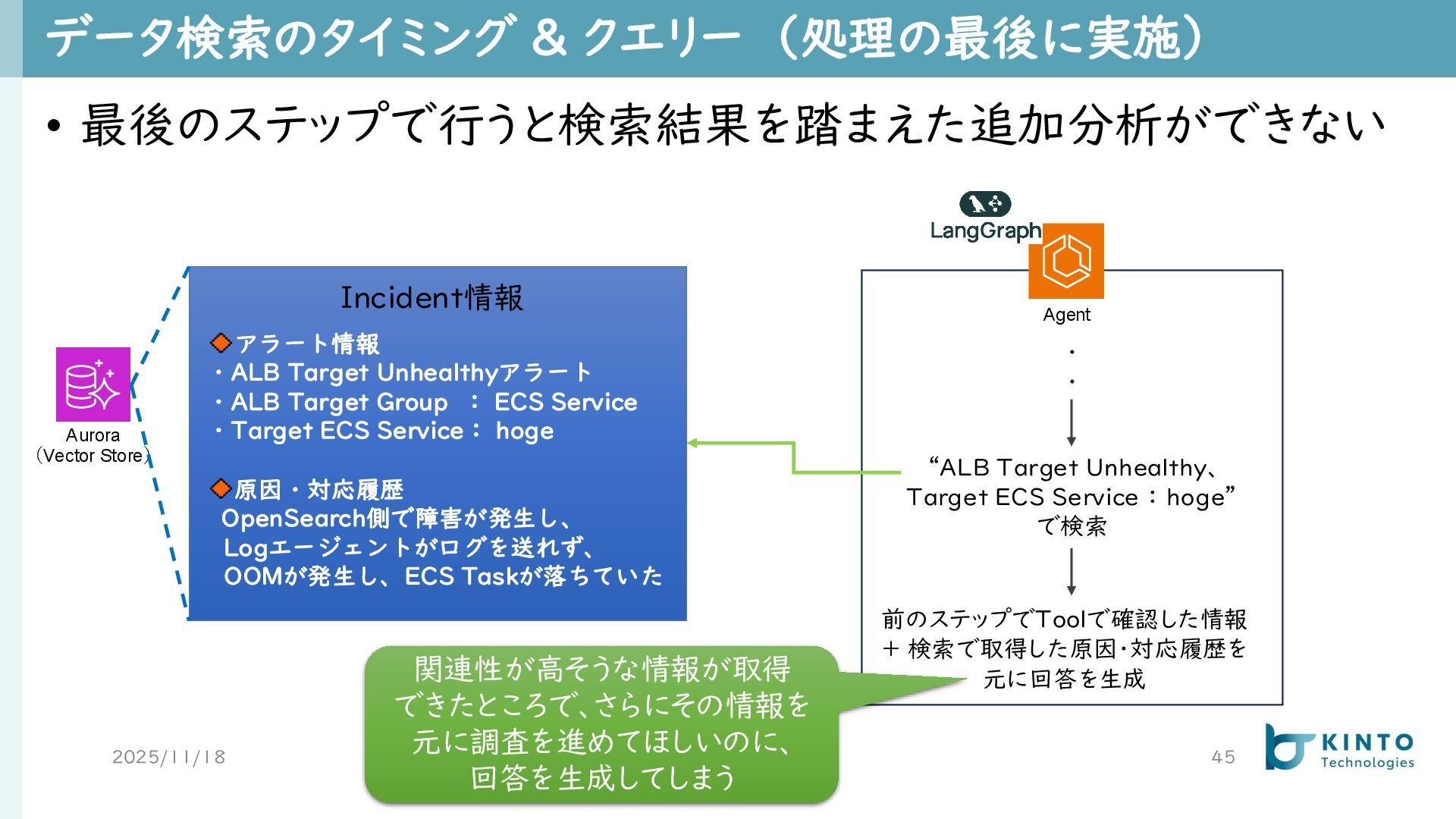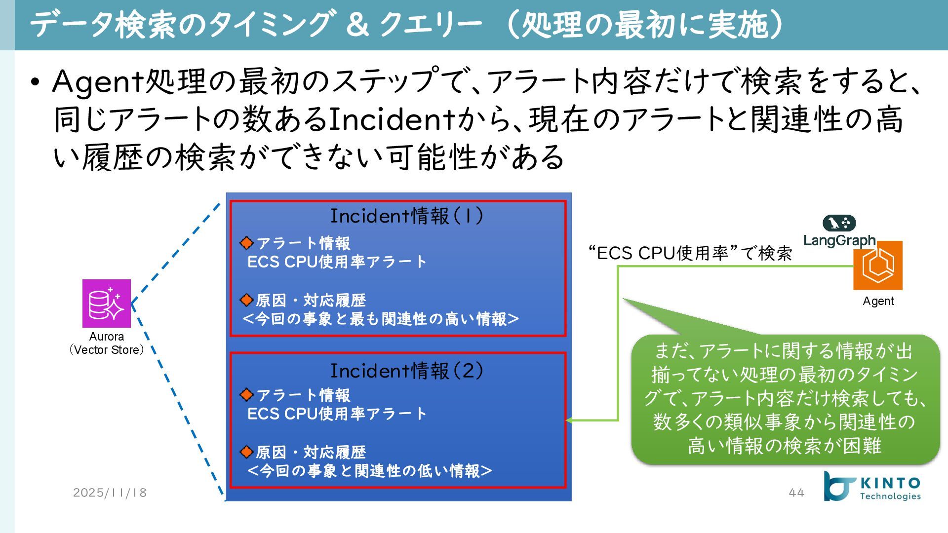 データ検索のタイミング & クエリー (処理の最初に実施) 2025/11/18 44 • Agent処理の最初のステップで、アラート内容だけで検索をすると、 同じアラートの数あるIncidentから、現在のアラートと関連性の高 い履歴の検索ができない可能性がある
