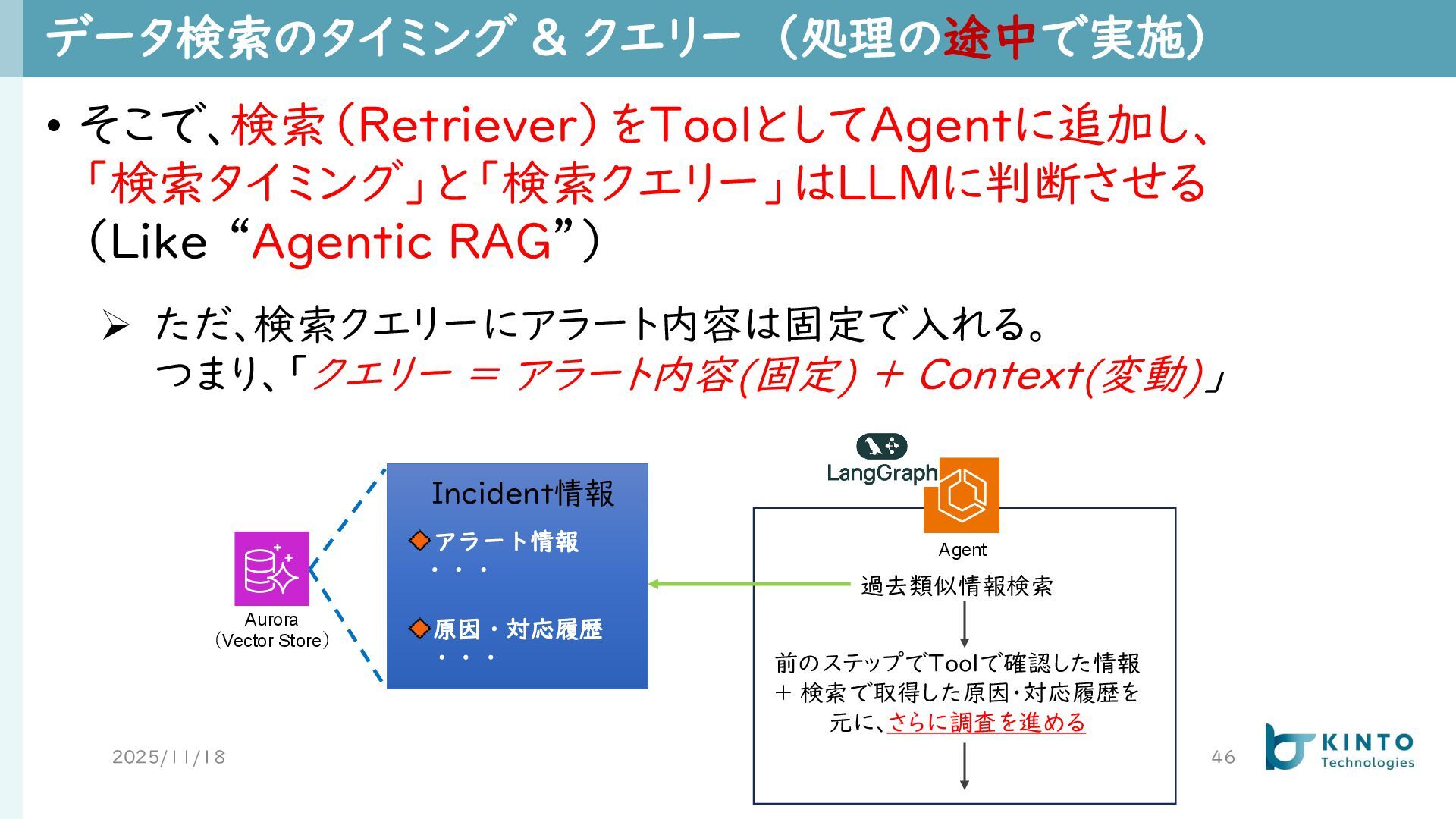 データ検索のタイミング & クエリー (処理の途中で実施) 2025/11/18 46 • そこで、検索(Retriever)をToolとしてAgentに追加し、 「検索タイミング」と「検索クエリー」はLLMに判断させる (Like