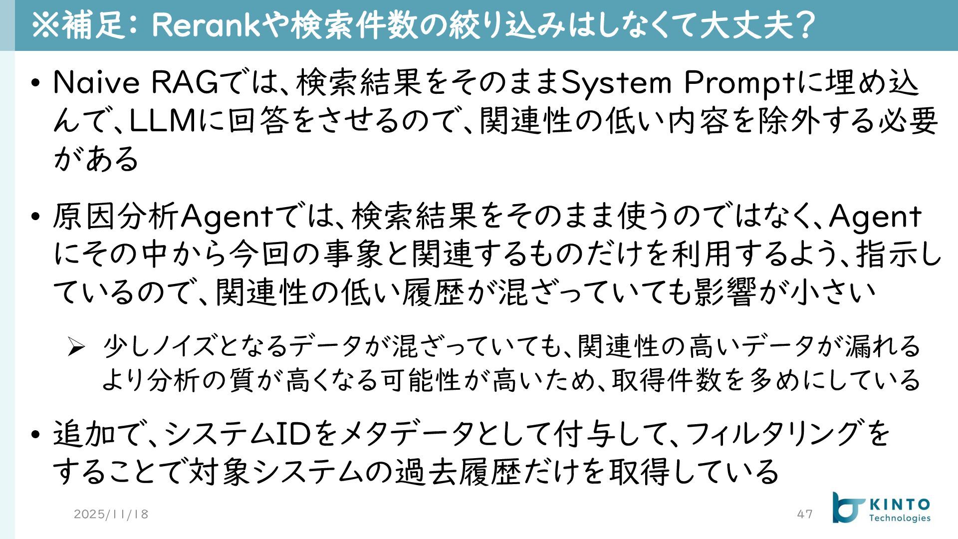 • 原因分析Agentでは、検索結果をそのまま使うのではなく、Agent にその中から今回の事象と関連するものだけを利用するよう、指示し ているので、関連性の低い履歴が混ざっていても影響が小さい ➢ 少しノイズとなるデータが混ざっていても、関連性の高いデータが漏れる より分析の質が高くなる可能性が高いため、取得件数を多めにしている • 追加で、システムIDをメタデータとして付与して、フィルタリングを することで対象システムの過去履歴だけを取得している
