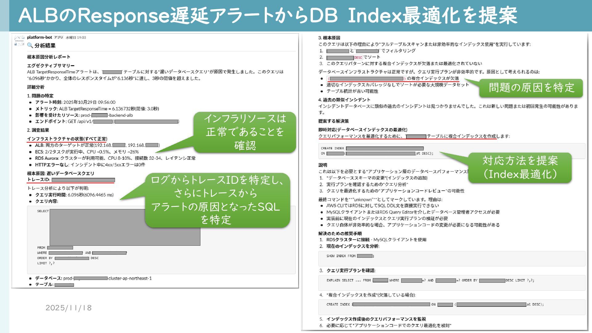 ALBのResponse遅延アラートからDB Index最適化を提案 2025/11/18 50 インフラリソースは 正常であることを 確認 ログからトレースIDを特定し、 さらにトレースから アラートの原因となったSQL