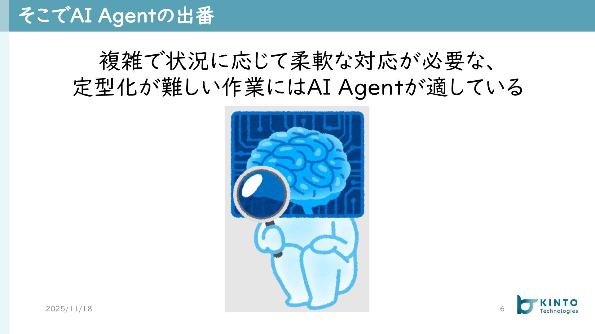 そこでAI Agentの出番 2025/11/18 6 複雑で状況に応じて柔軟な対応が必要な、 定型化が難しい作業にはAI Agentが適している