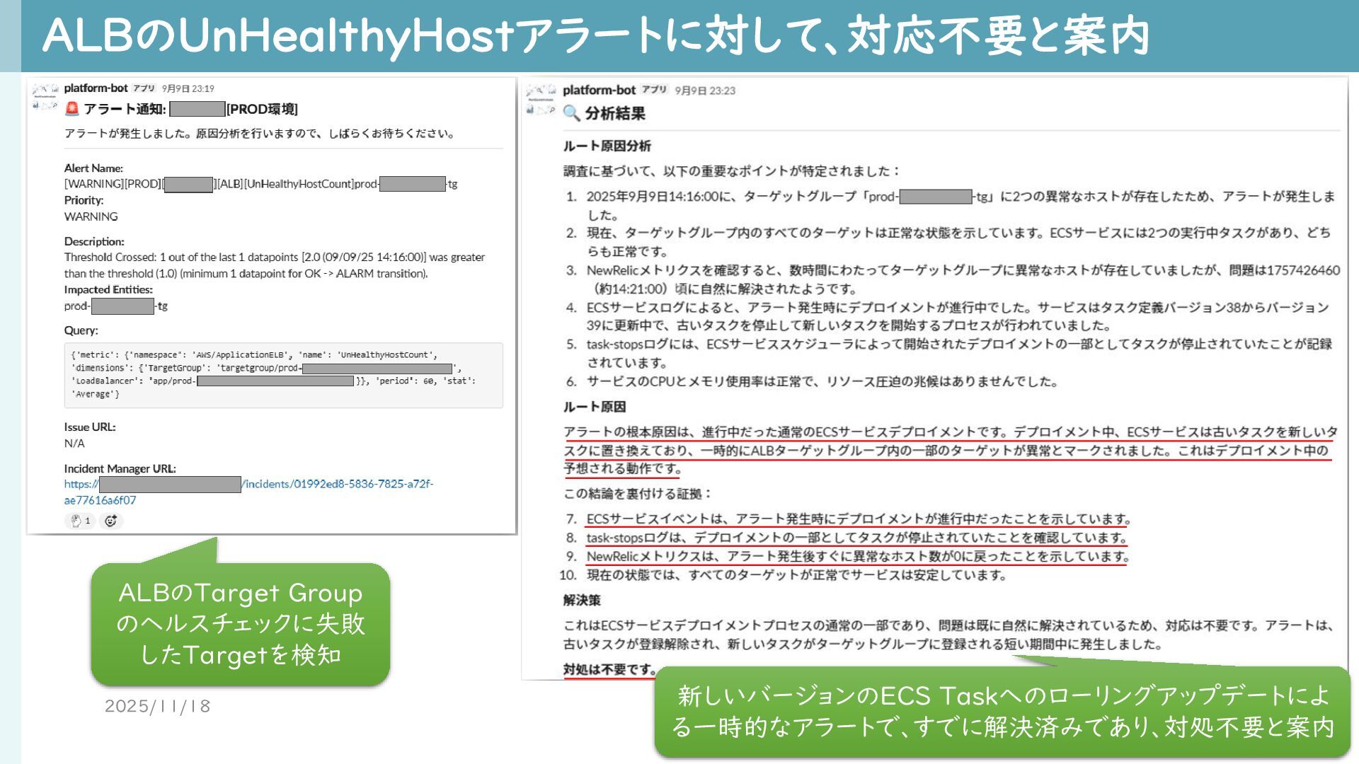 2025/11/18 51 ALBのUnHealthyHostアラートに対して、対応不要と案内 ALBのTarget Group のヘルスチェックに失敗 したTargetを検知 新しいバージョンのECS Taskへのローリングアップデートによ る一時的なアラートで、すでに解決済みであり、対処不要と案内