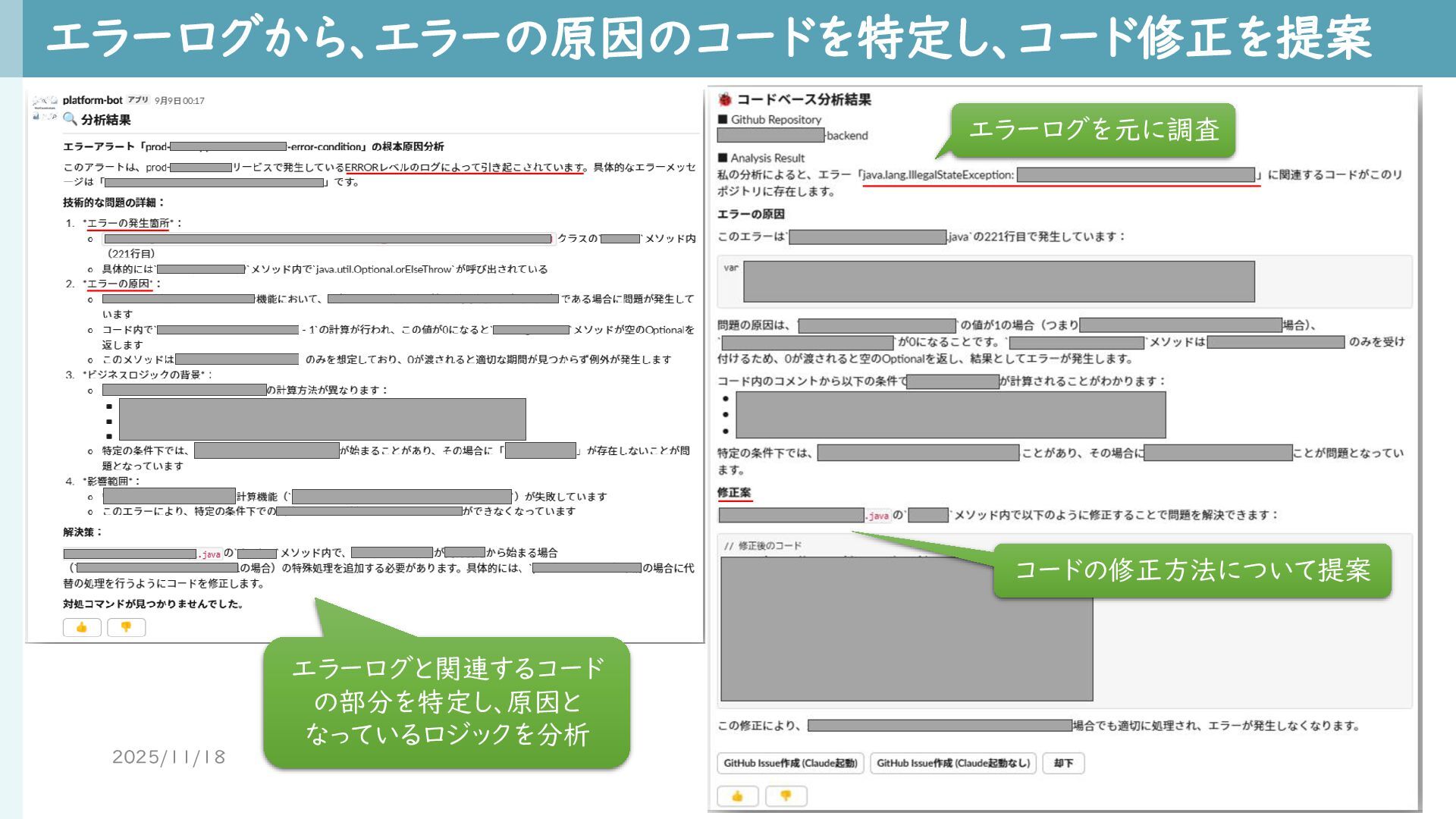 エラーログから、エラーの原因のコードを特定し、コード修正を提案 2025/11/18 52 エラーログと関連するコード の部分を特定し、原因と なっているロジックを分析 コードの修正方法について提案 エラーログを元に調査