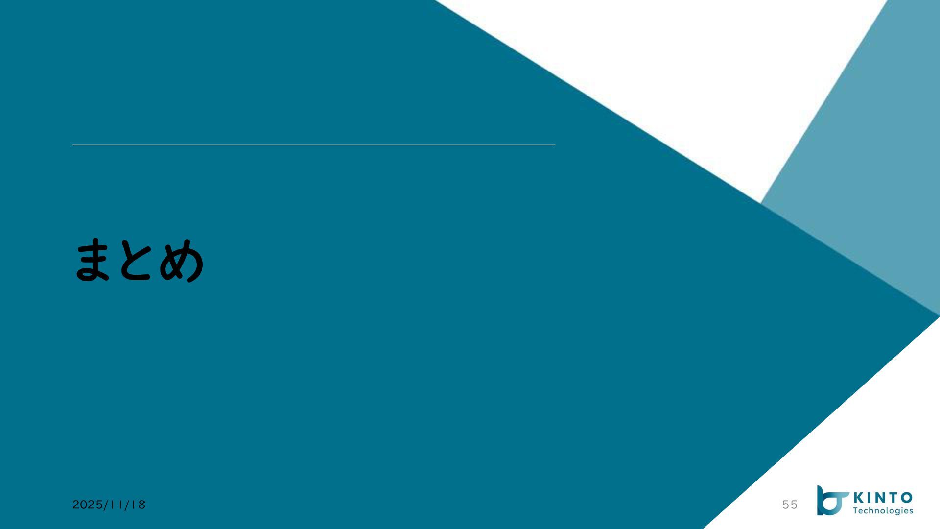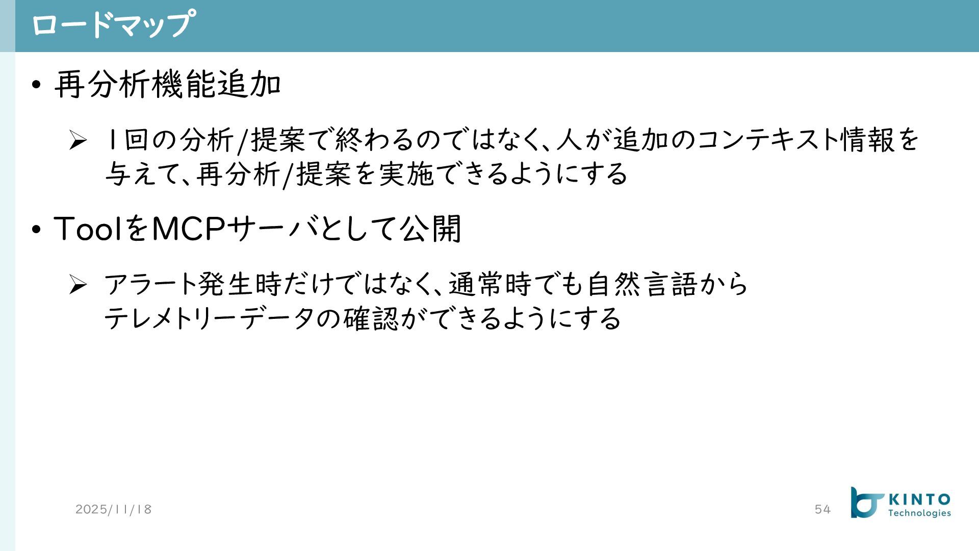 ロードマップ 2025/11/18 54 • 再分析機能追加 ➢ 1回の分析/提案で終わるのではなく、人が追加のコンテキスト情報を 与えて、再分析/提案を実施できるようにする • ToolをMCPサーバとして公開