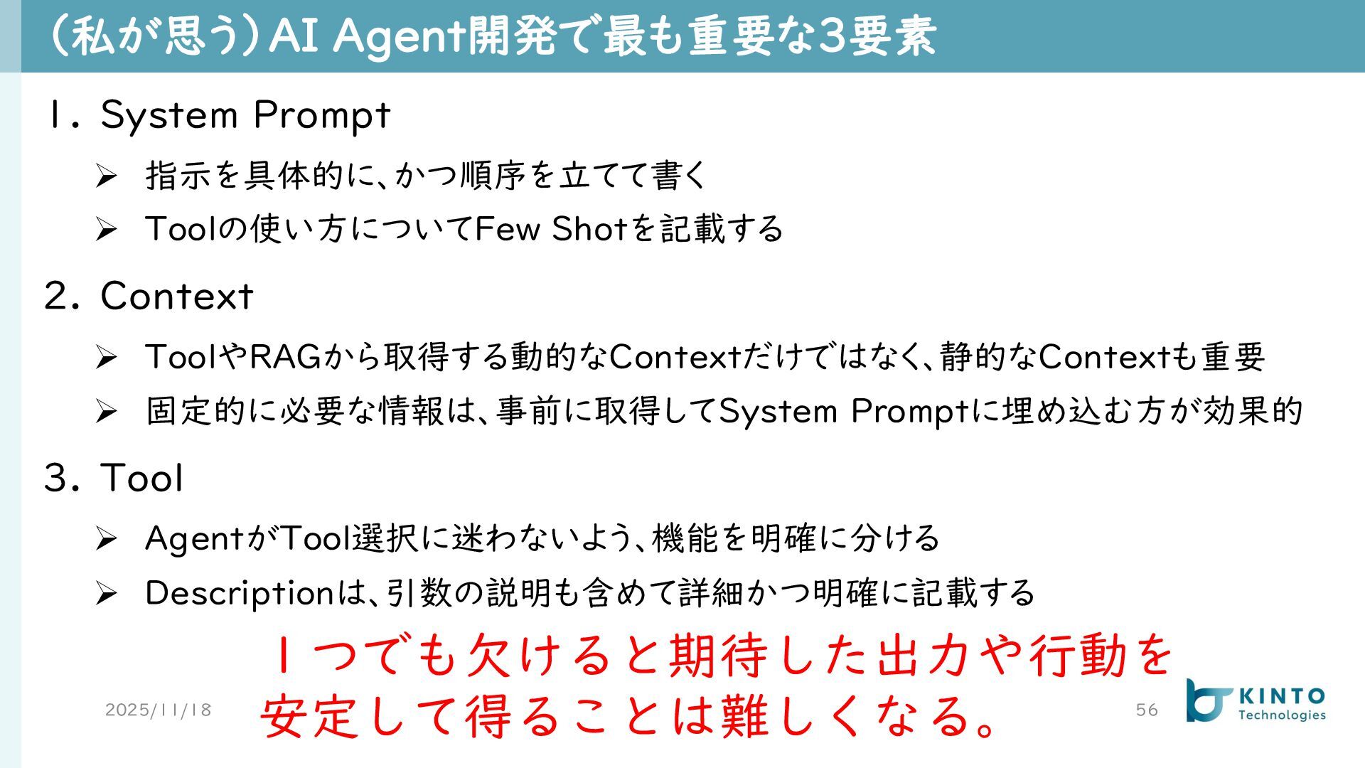 ➢ ToolやRAGから取得する動的なContextだけではなく、静的なContextも重要 ➢ 固定的に必要な情報は、事前に取得してSystem Promptに埋め込む方が効果的 3. Tool ➢ AgentがTool選択に迷わないよう、機能を明確に分ける ➢ Descriptionは、引数の説明も含めて詳細かつ明確に記載する (私が思う)AI Agent開発で最も重要な3要素 2025/11/18 56 1つでも欠けると期待した出力や行動を 安定して得ることは難しくなる。
