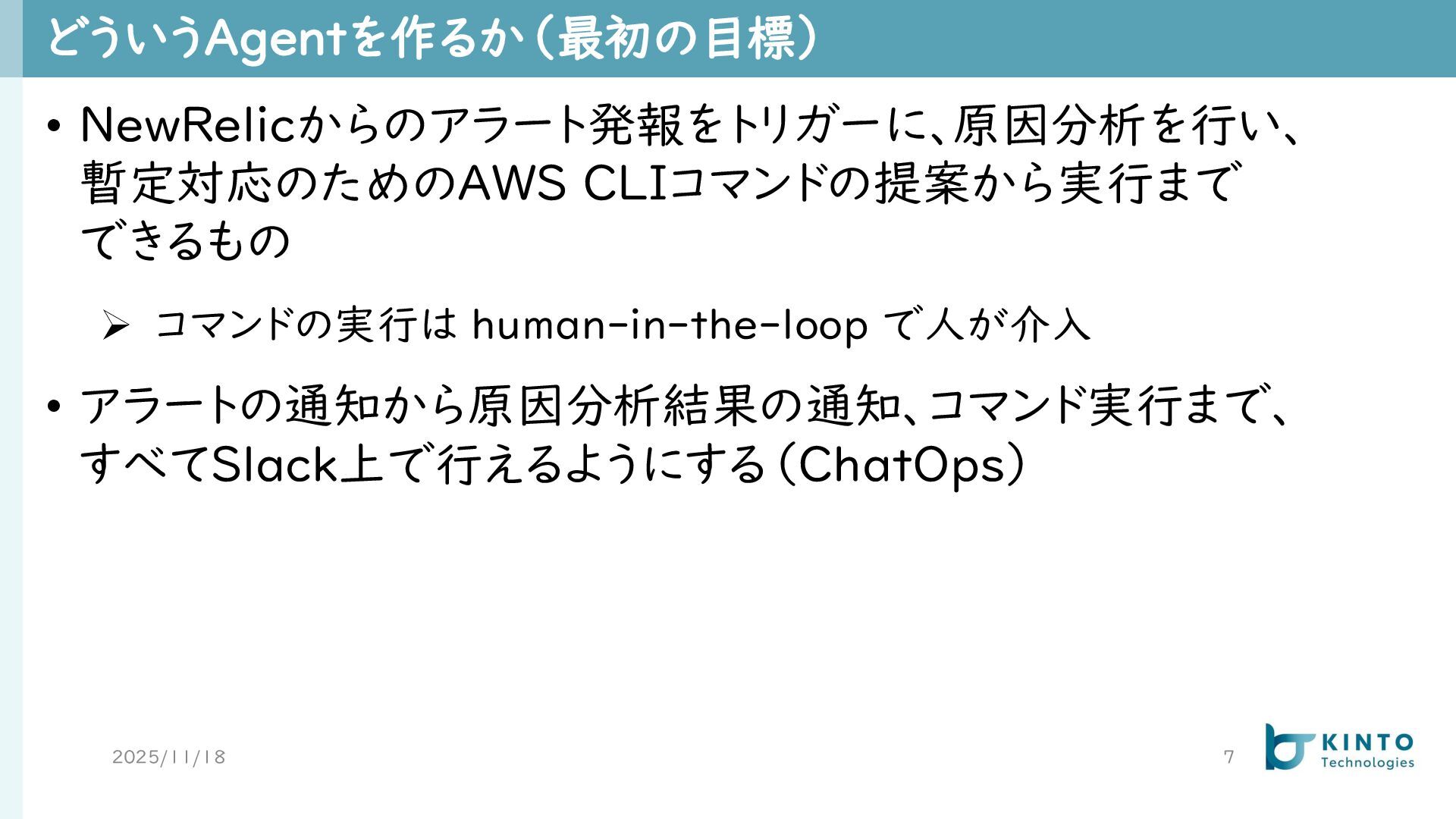 どういうAgentを作るか(最初の目標) 2025/11/18 7 • NewRelicからのアラート発報をトリガーに、原因分析を行い、 暫定対応のためのAWS CLIコマンドの提案から実行まで できるもの ➢ コマンドの実行は