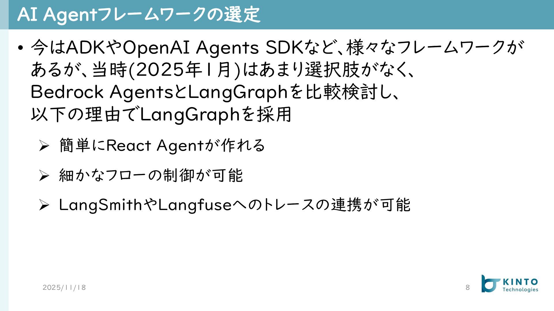 AI Agentフレームワークの選定 2025/11/18 8 • 今はADKやOpenAI Agents SDKなど、様々なフレームワークが あるが、当時(2025年1月)はあまり選択肢がなく、 Bedrock