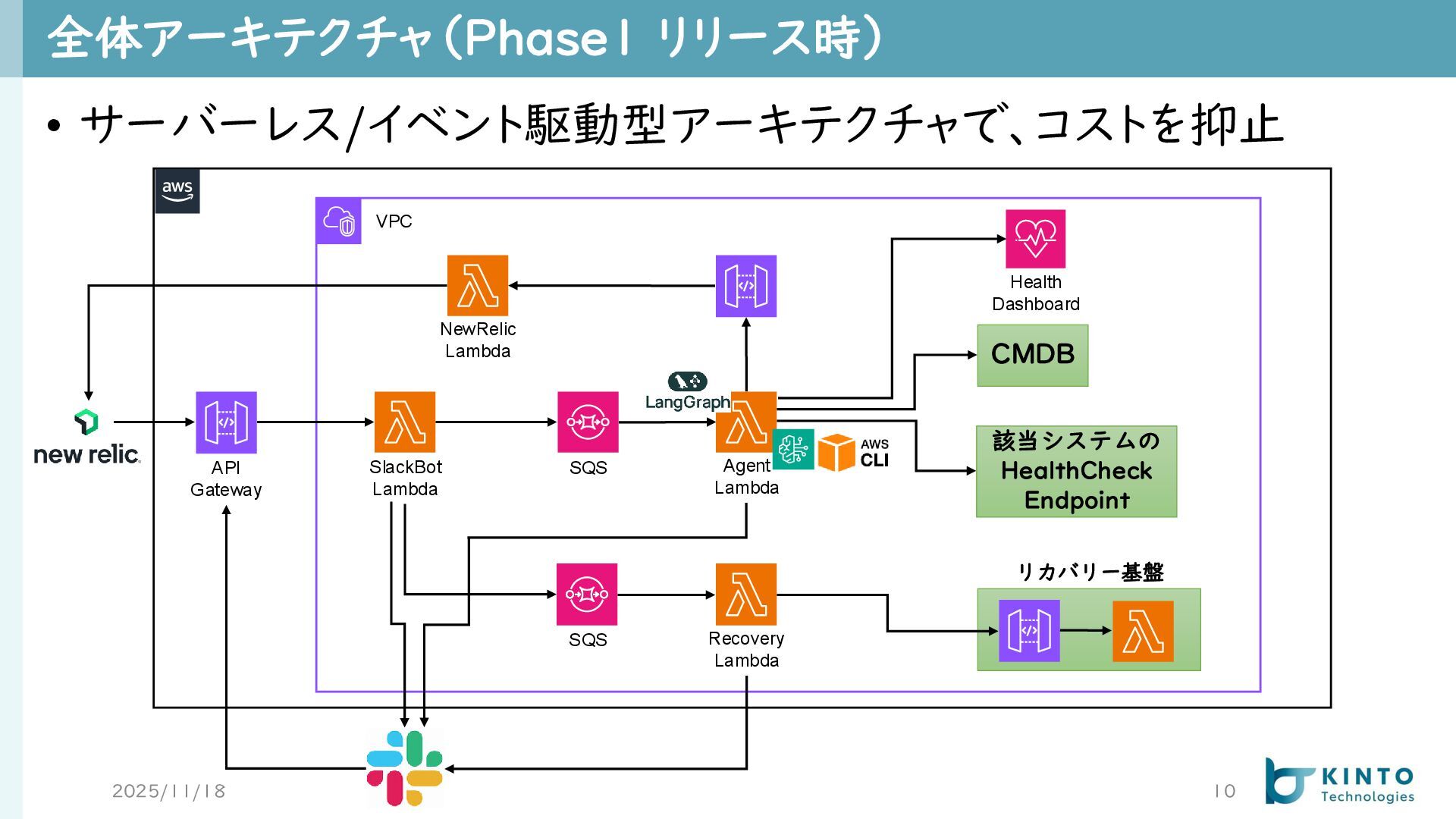 全体アーキテクチャ(Phase1 リリース時) 2025/11/18 10 • サーバーレス/イベント駆動型アーキテクチャで、コストを抑止 VPC API Gateway SlackBot