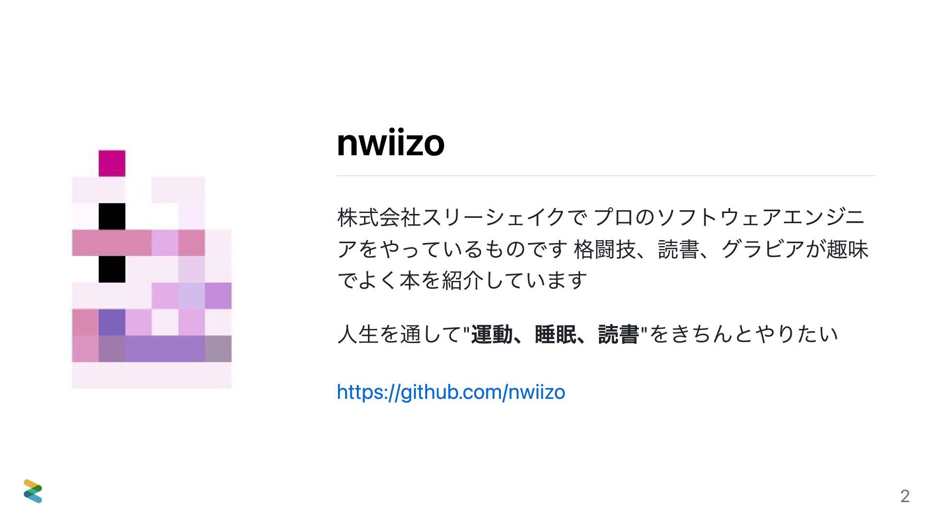 nwiizo 株式会社スリーシェイクで プロのソフトウェアエンジニ アをやっているものです 格闘技、読書、グラビアが趣味 でよく本を紹介しています 人生を通して"運動、睡眠、読書"をきちんとやりたい https://github.com/nwiizo 2