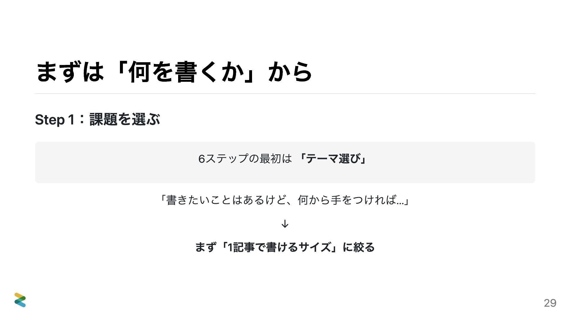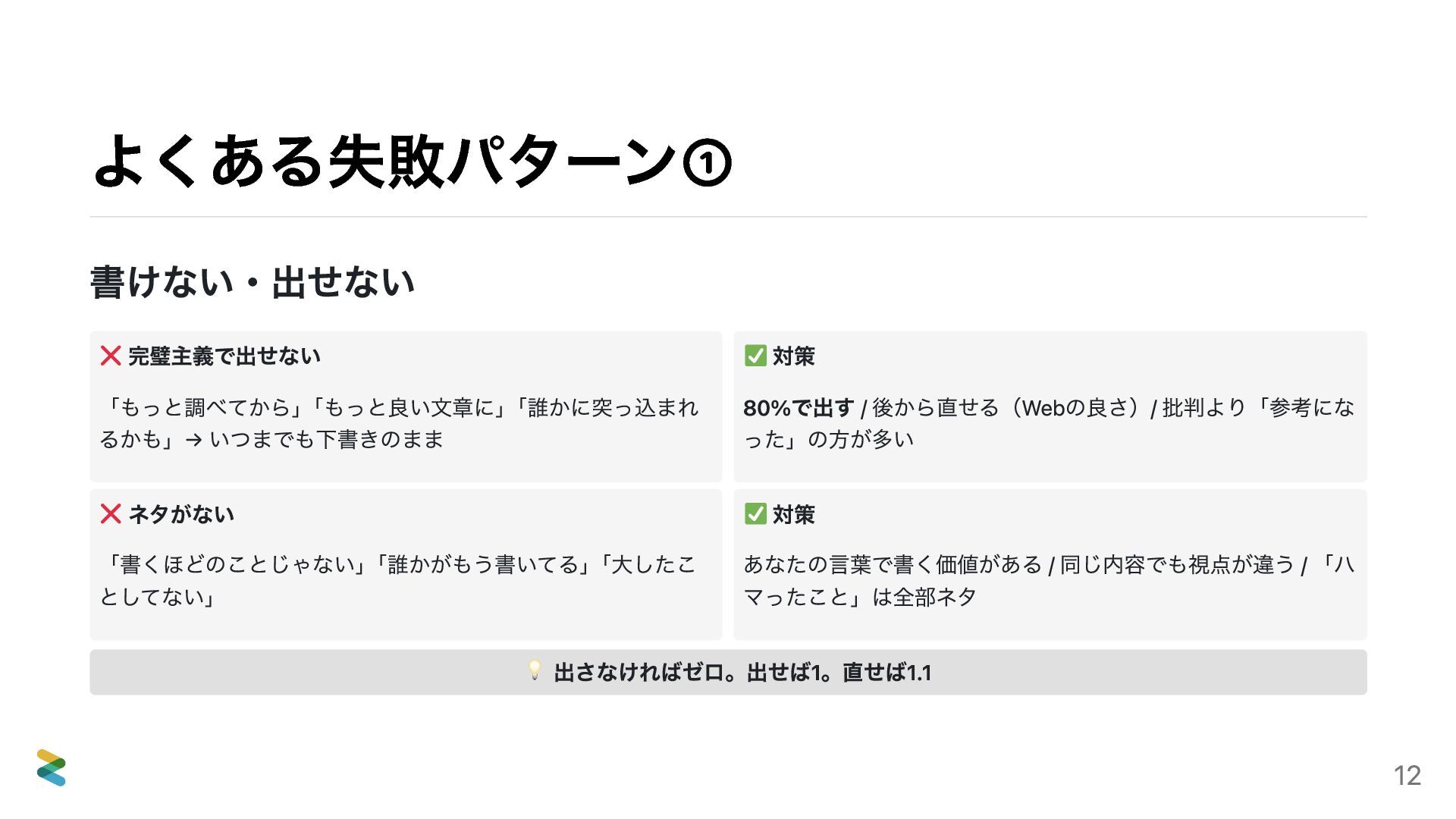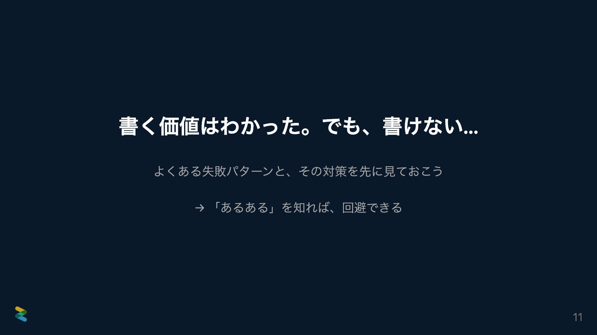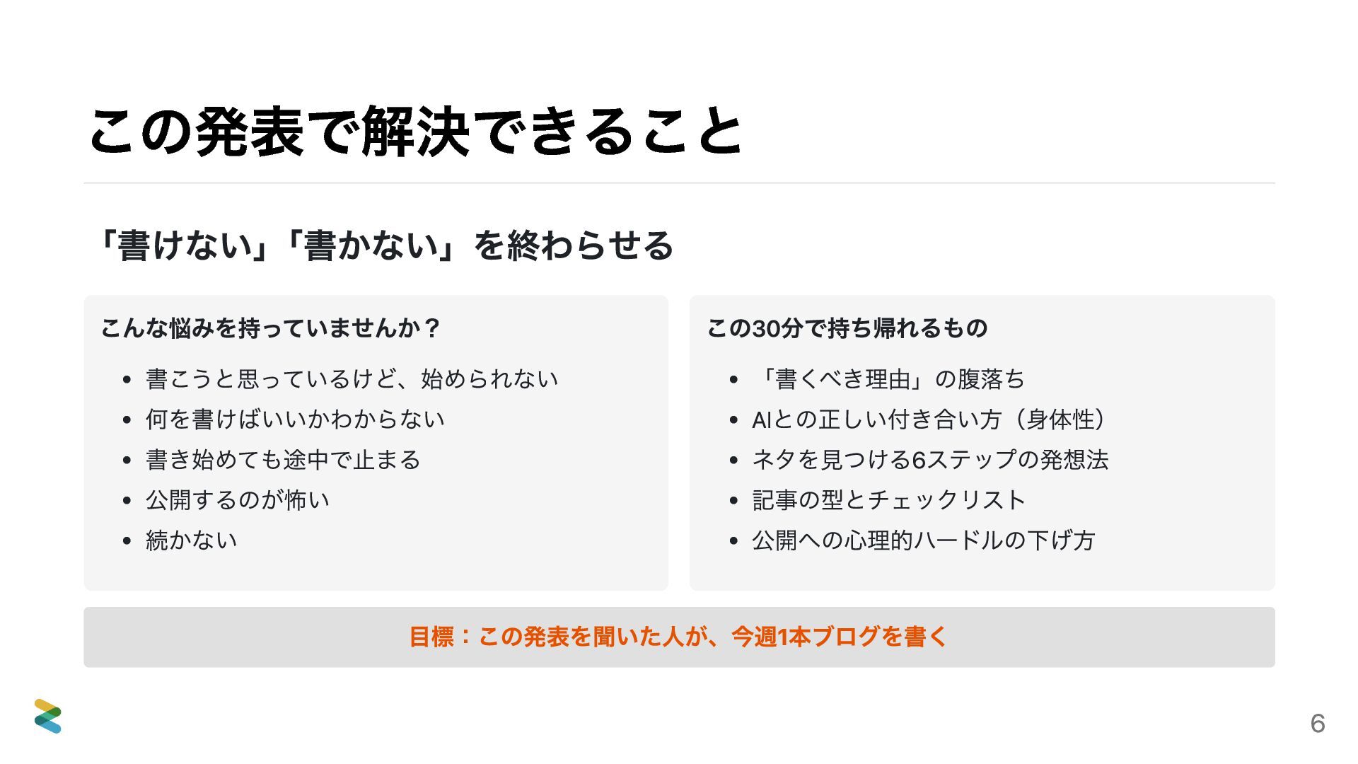 この発表で解決できること 「書けない」 「書かない」を終わらせる こんな悩みを持っていませんか? 書こうと思っているけど、始められない 何を書けばいいかわからない 書き始めても途中で止まる 公開するのが怖い 続かない この30分で持ち帰れるもの