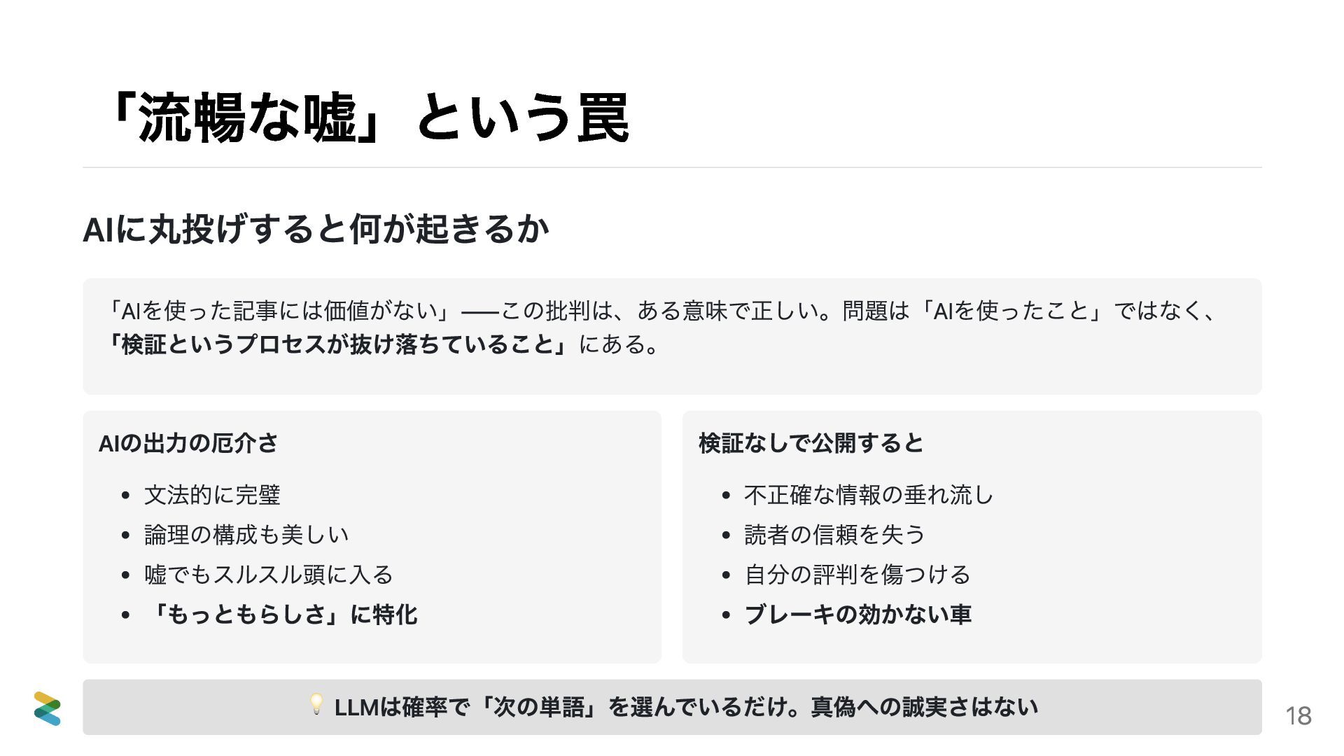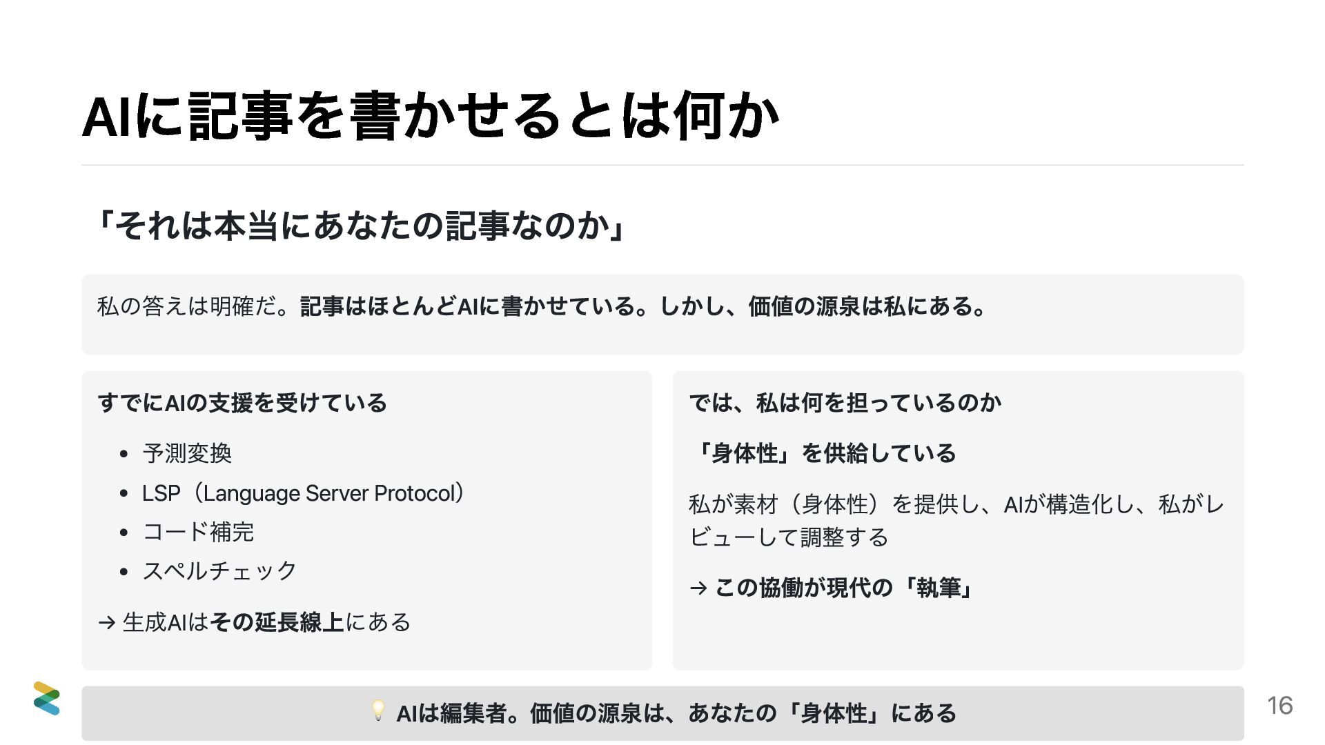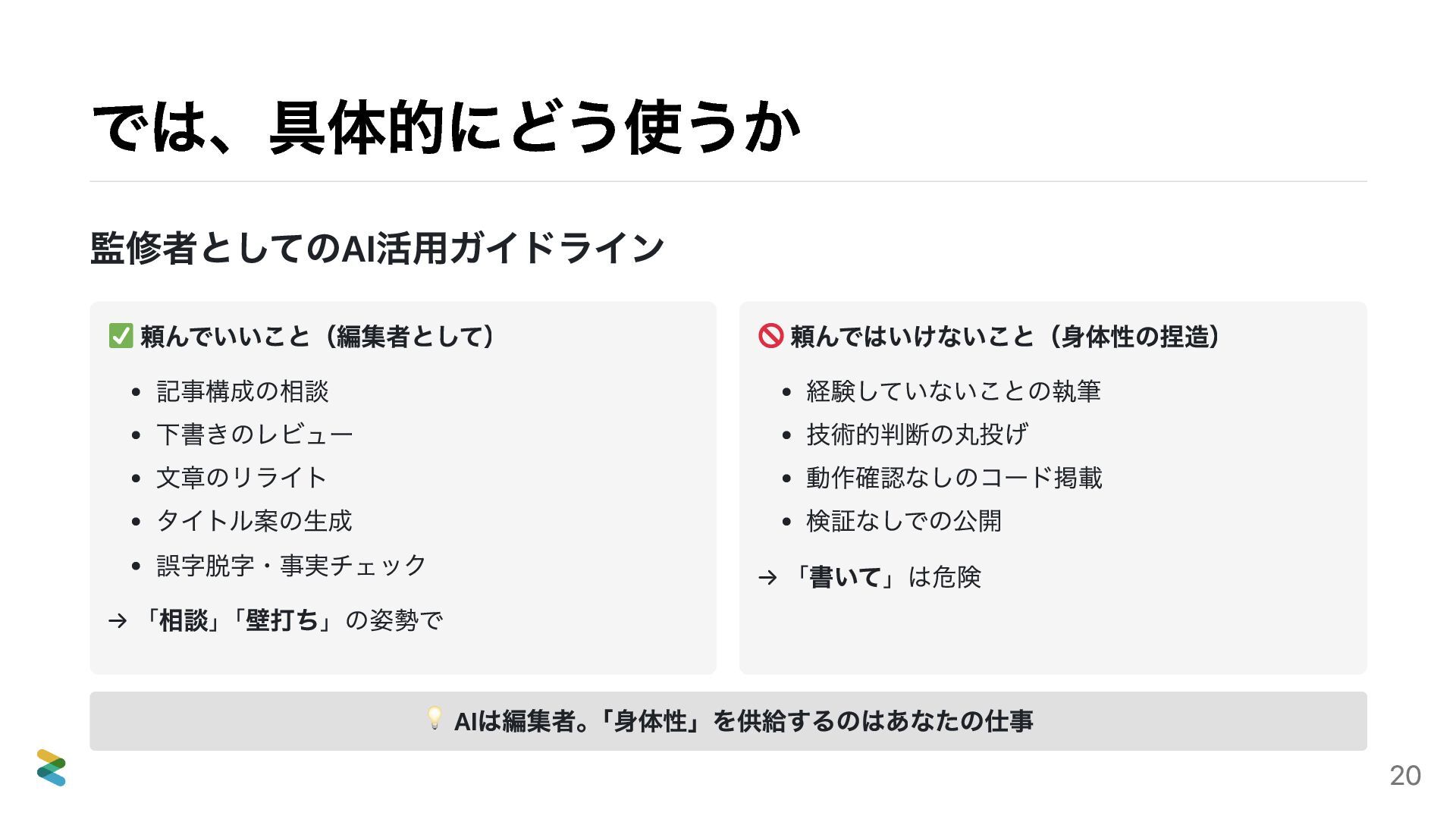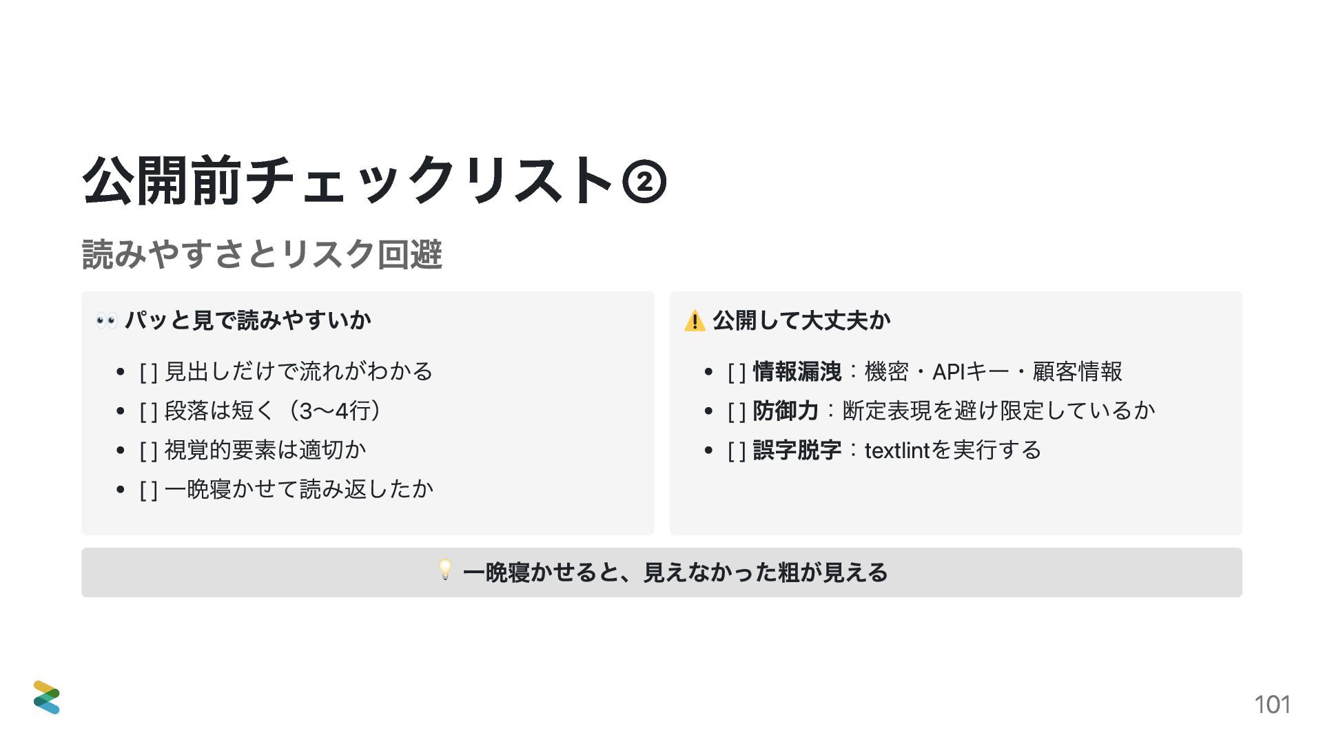 ] 視覚的要素は適切か [ ] 一晩寝かせて読み返したか 公開して大丈夫か [ ] 情報漏洩:機密・APIキー・顧客情報 [ ] 防御力:断定表現を避け限定しているか [ ] 誤字脱字:textlintを実行する 💡 一晩寝かせると、見えなかった粗が見える 101