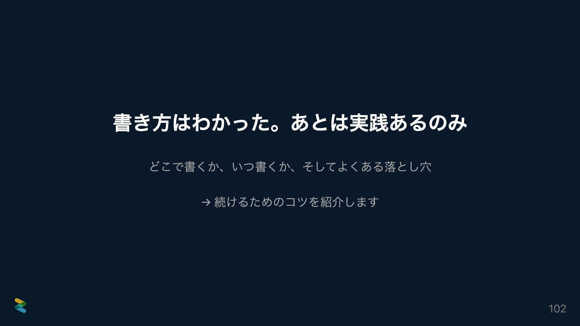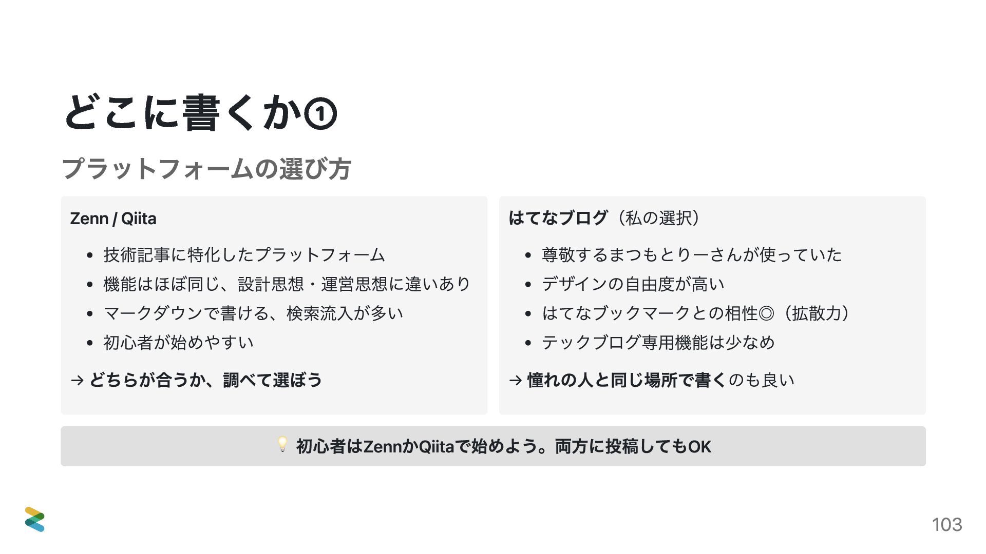 どちらが合うか、調べて選ぼう はてなブログ(私の選択) 尊敬するまつもとりーさんが使っていた デザインの自由度が高い はてなブックマークとの相性◎(拡散力) テックブログ専用機能は少なめ → 憧れの人と同じ場所で書くのも良い 💡 初心者はZennかQiitaで始めよう。両方に投稿してもOK 103