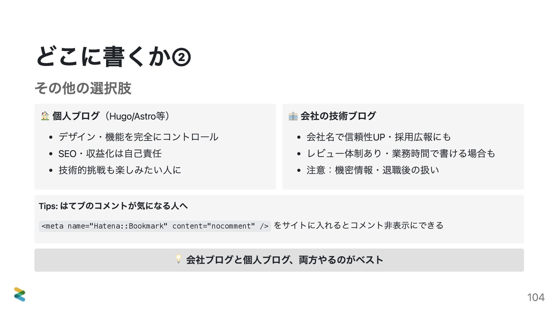 Tips: はてブのコメントが気になる人へ <meta name="Hatena::Bookmark" content="nocomment" /> をサイトに入れるとコメント非表示にできる 💡 会社ブログと個人ブログ、両方やるのがベスト 104