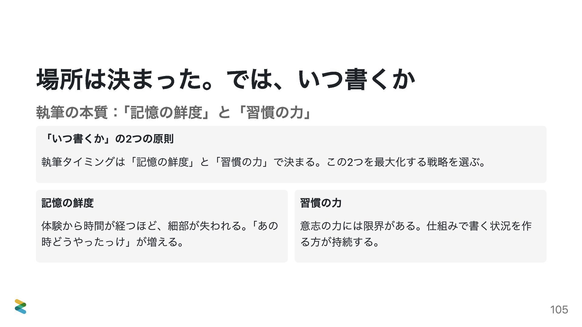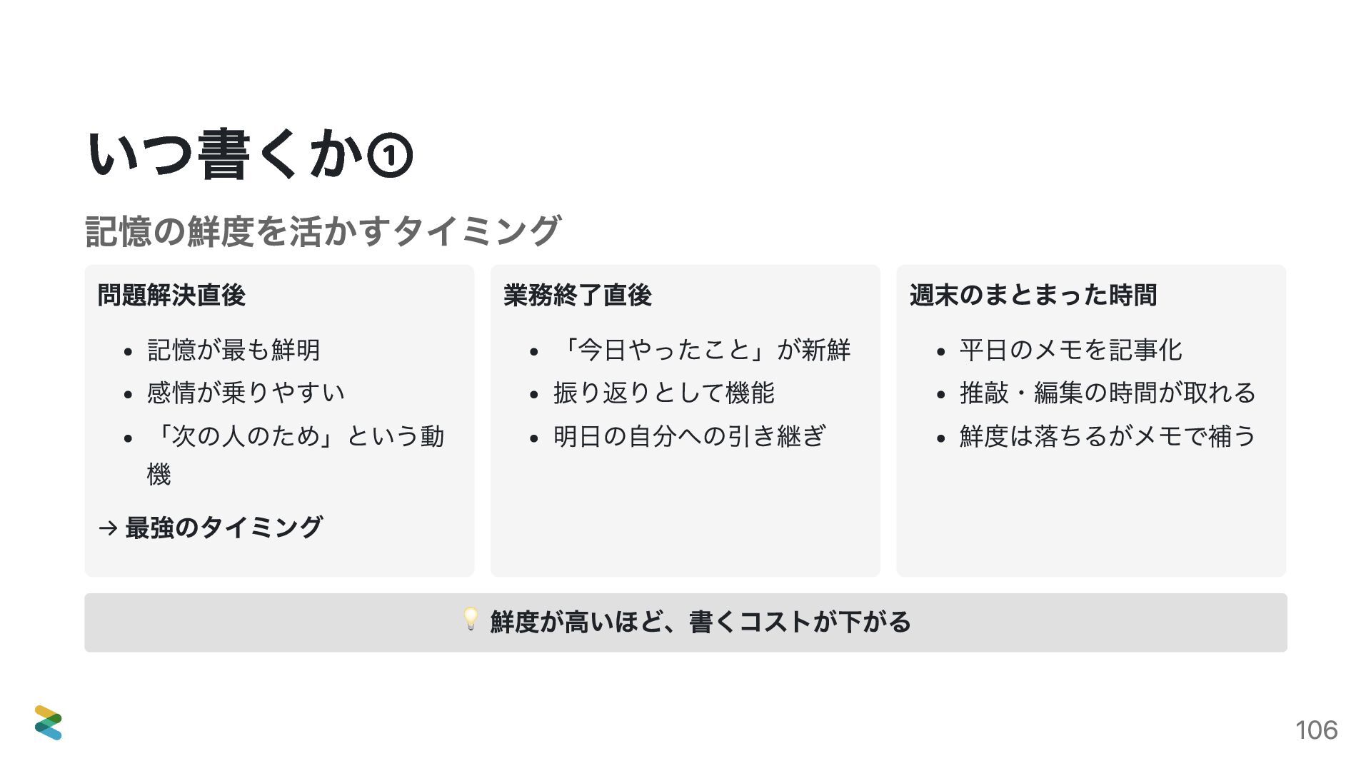 「今日やったこと」が新鮮 振り返りとして機能 明日の自分への引き継ぎ 週末のまとまった時間 平日のメモを記事化 推敲・編集の時間が取れる 鮮度は落ちるがメモで補う 💡 鮮度が高いほど、書くコストが下がる 106