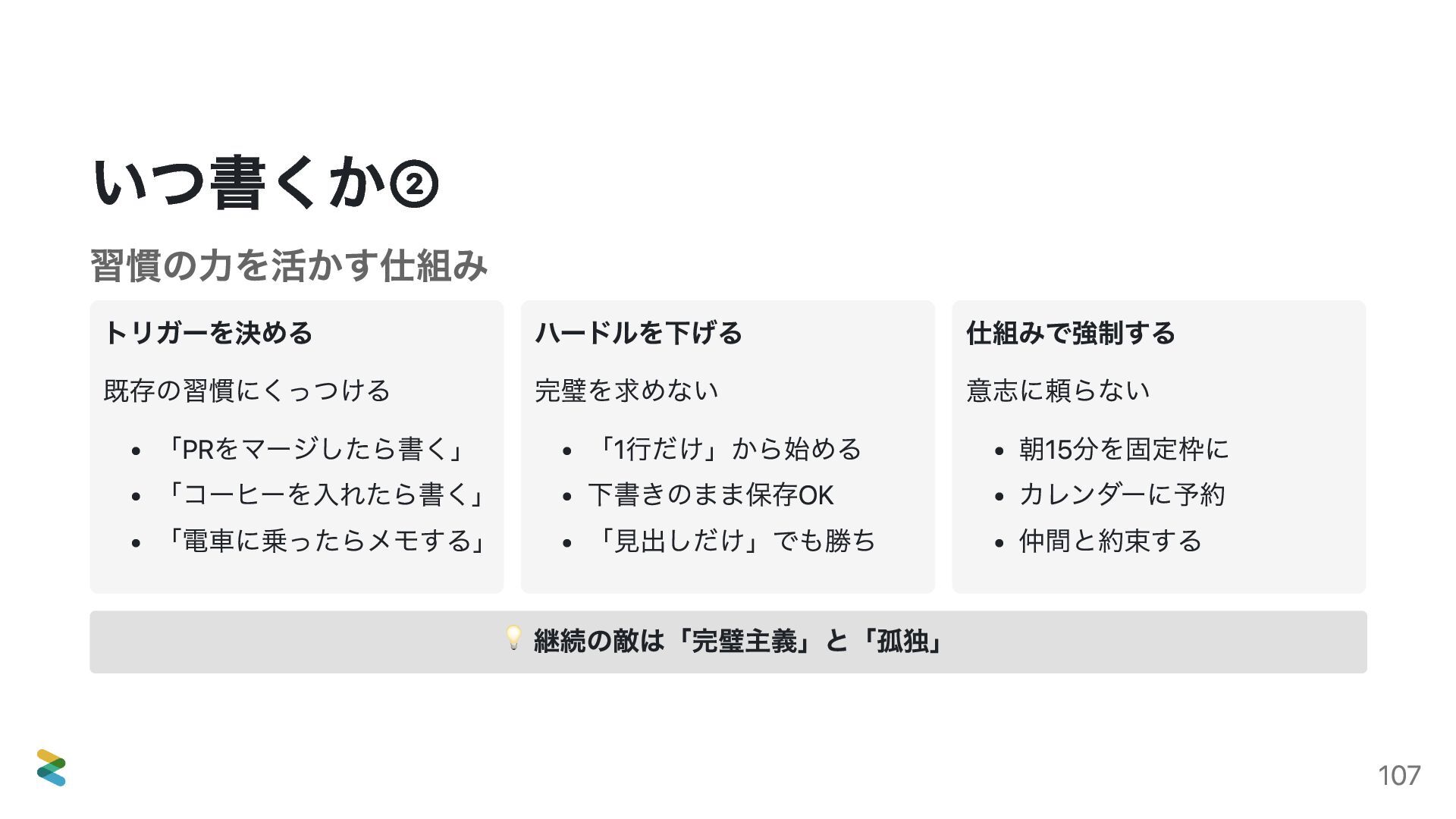 いつ書くか② 習慣の力を活かす仕組み トリガーを決める 既存の習慣にくっつける 「PRをマージしたら書く」 「コーヒーを入れたら書く」 「電車に乗ったらメモする」 ハードルを下げる 完璧を求めない 「1行だけ」から始める