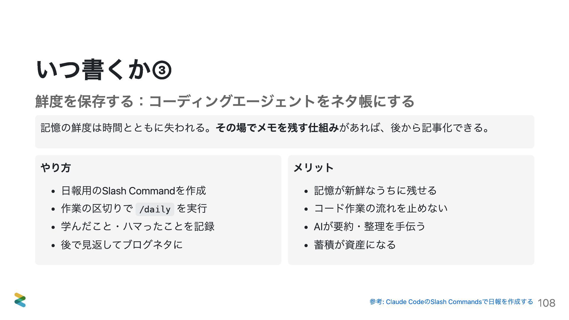 後で見返してブログネタに メリット 記憶が新鮮なうちに残せる コード作業の流れを止めない AIが要約・整理を手伝う 蓄積が資産になる 参考: Claude CodeのSlash Commandsで日報を作成する 108