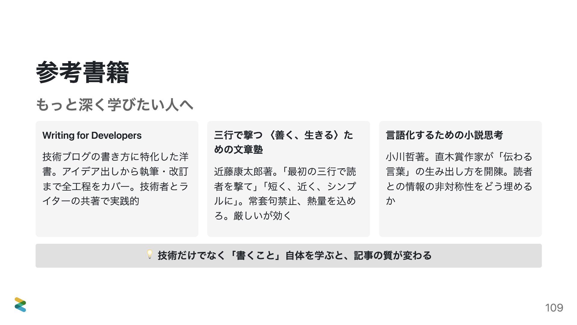 参考書籍 もっと深く学びたい人へ Writing for Developers 技術ブログの書き方に特化した洋 書。アイデア出しから執筆・改訂 まで全工程をカバー。技術者とラ イターの共著で実践的 三行で撃つ