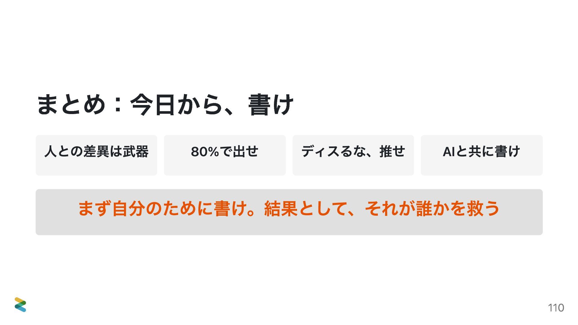 まとめ:今日から、書け 人との差異は武器 80%で出せ ディスるな、推せ AIと共に書け まず自分のために書け。結果として、それが誰かを救う 110