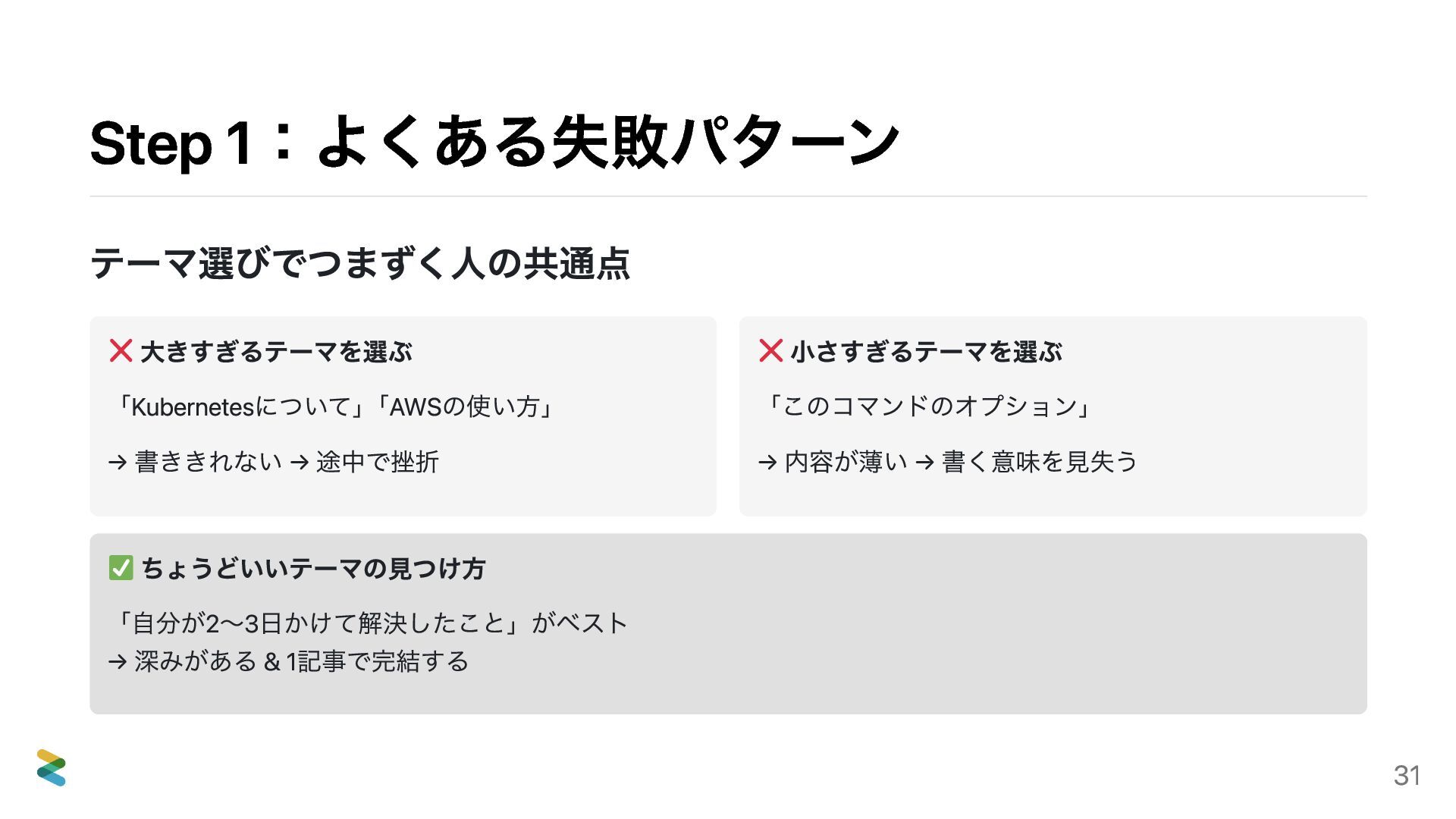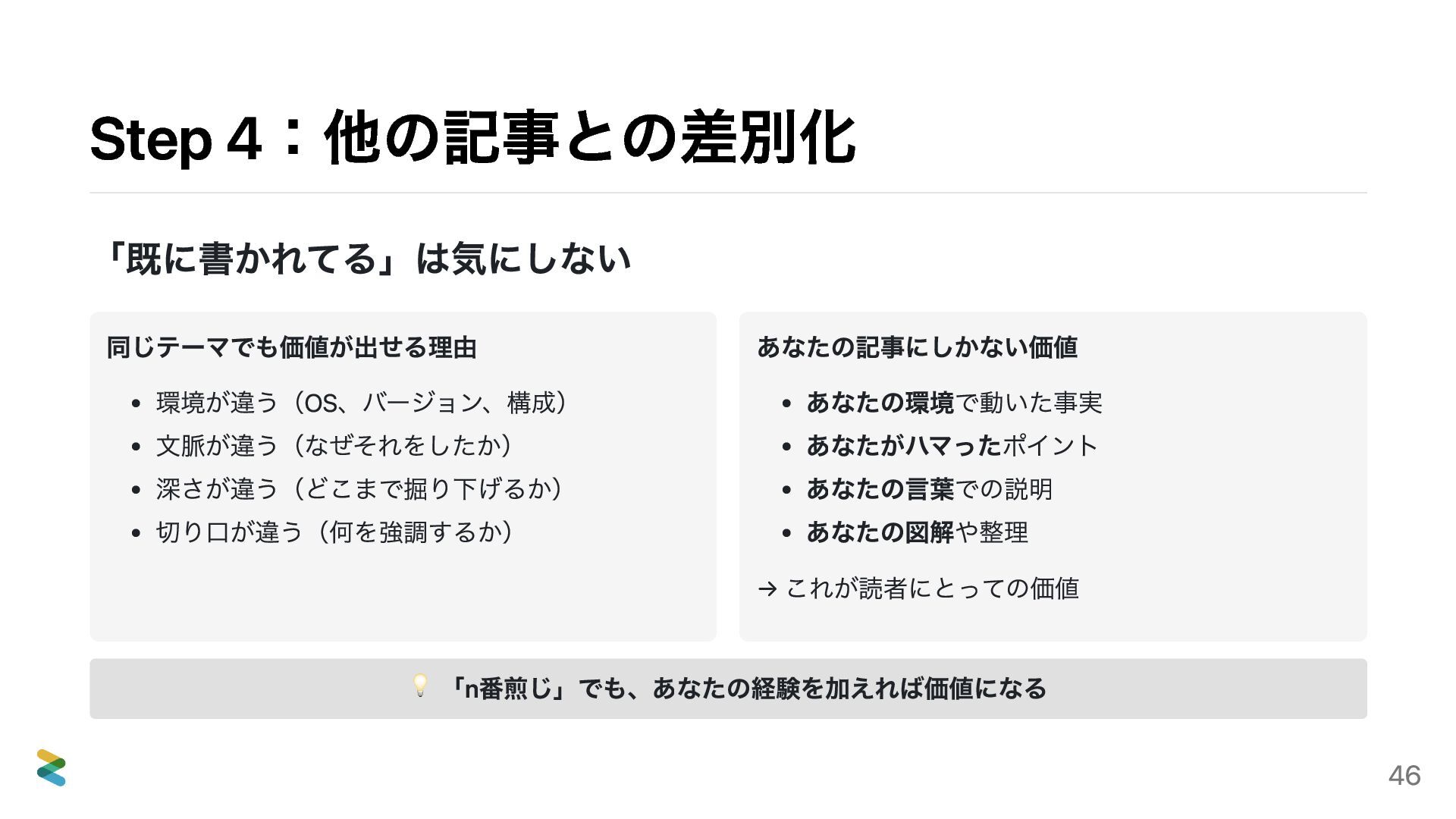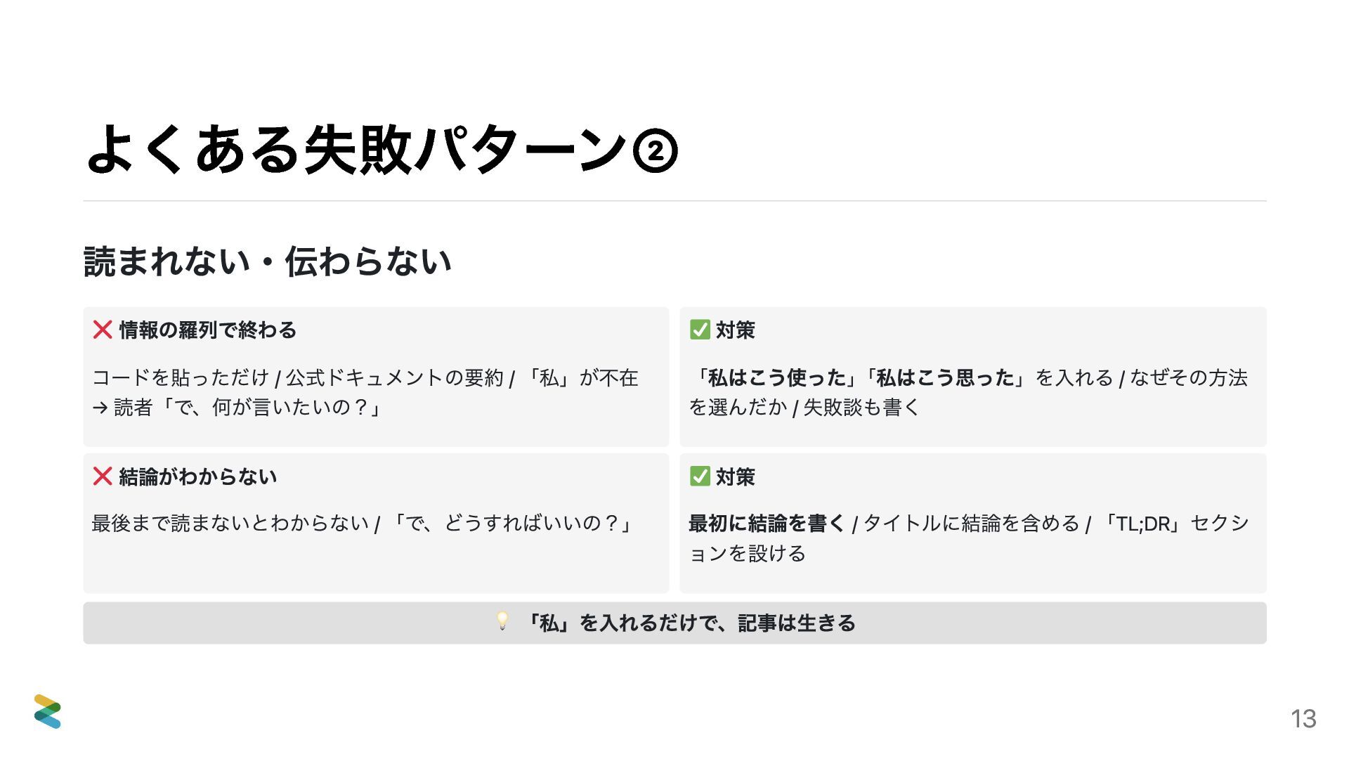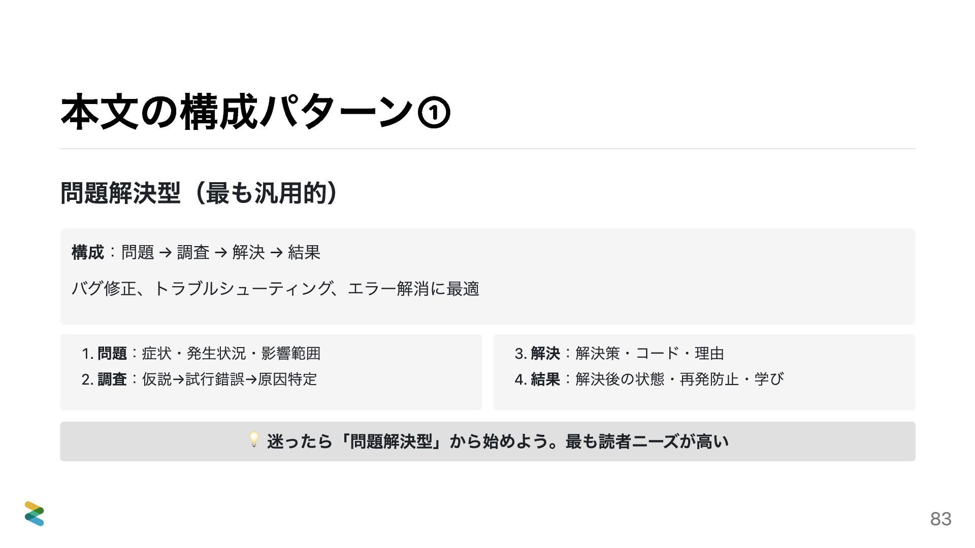 1. 問題:症状・発生状況・影響範囲 2. 調査:仮説→試行錯誤→原因特定 3. 解決:解決策・コード・理由 4. 結果:解決後の状態・再発防止・学び 💡 迷ったら「問題解決型」から始めよう。最も読者ニーズが高い 85
