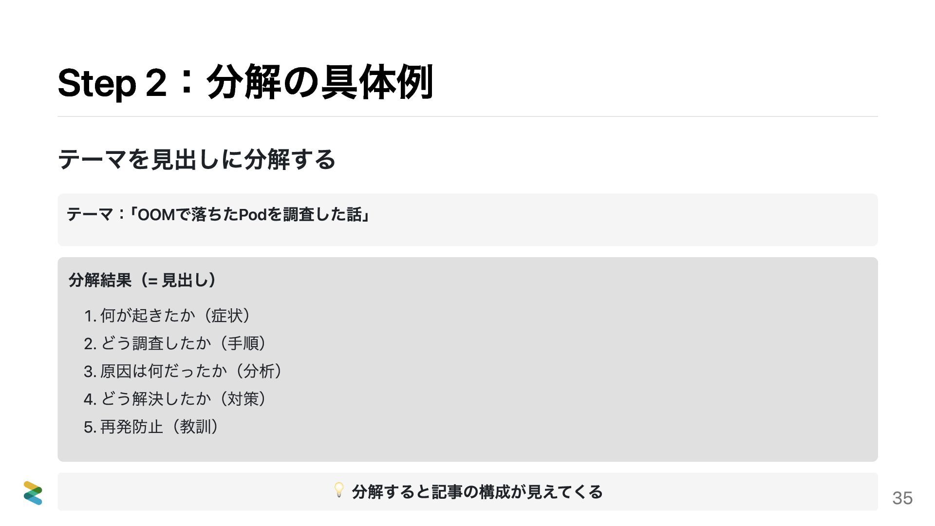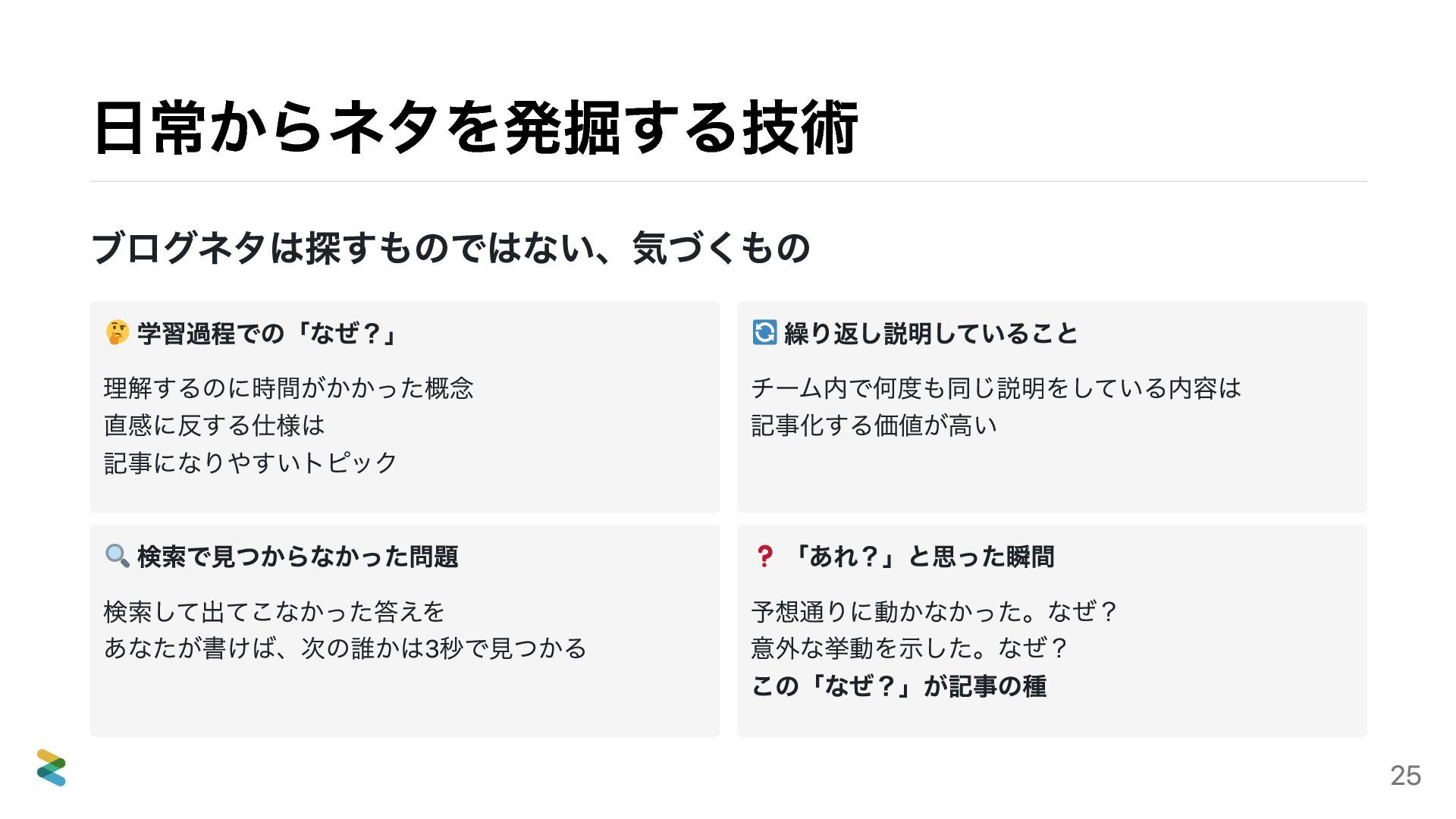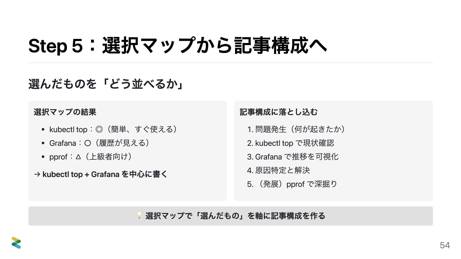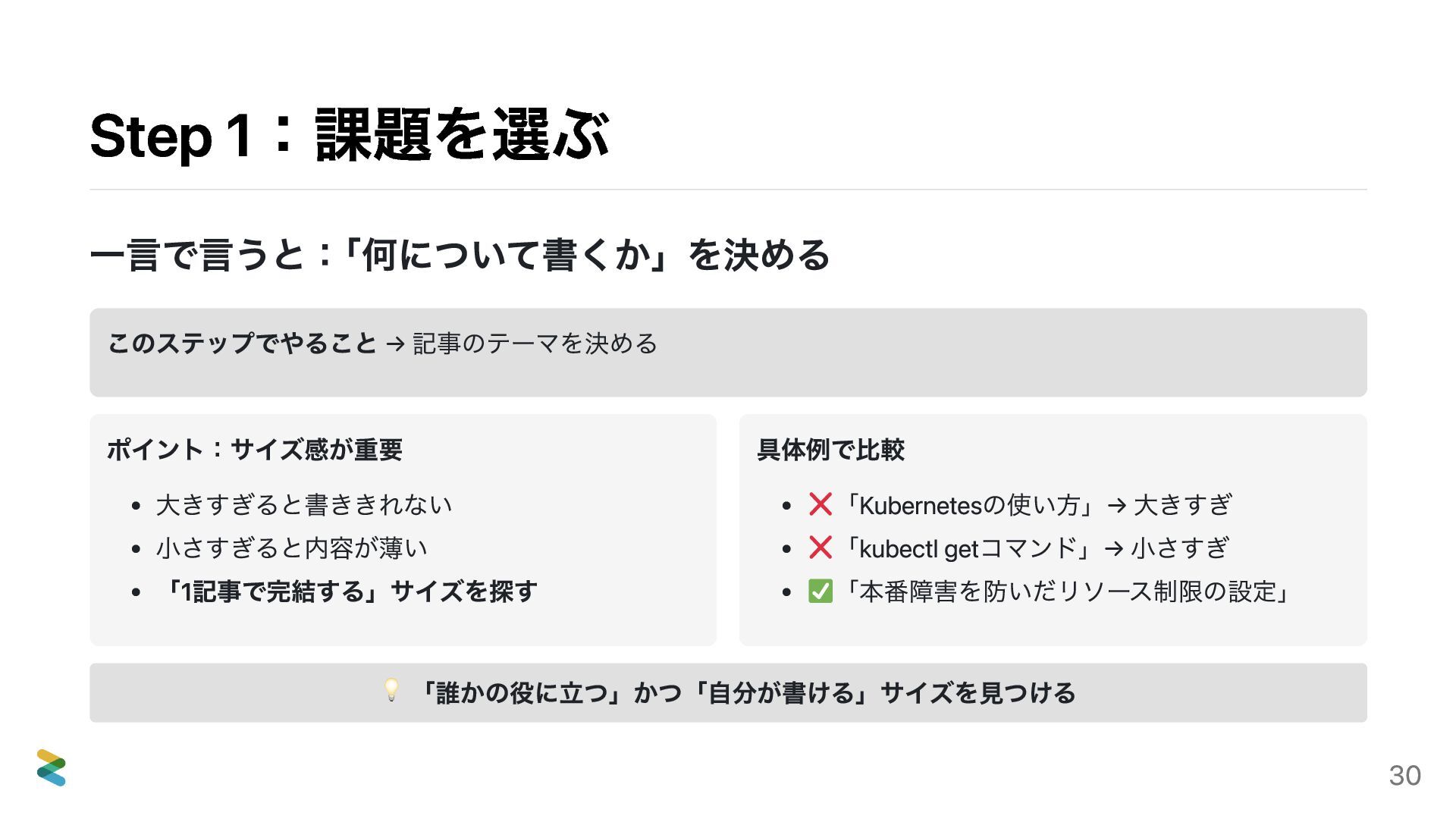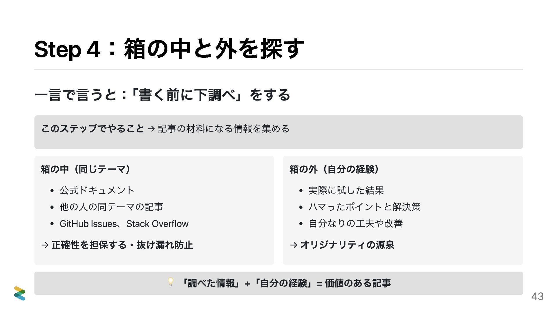 1. 問題:症状・発生状況・影響範囲 2. 調査:仮説→試行錯誤→原因特定 3. 解決:解決策・コード・理由 4. 結果:解決後の状態・再発防止・学び 💡 迷ったら「問題解決型」から始めよう。最も読者ニーズが高い 85