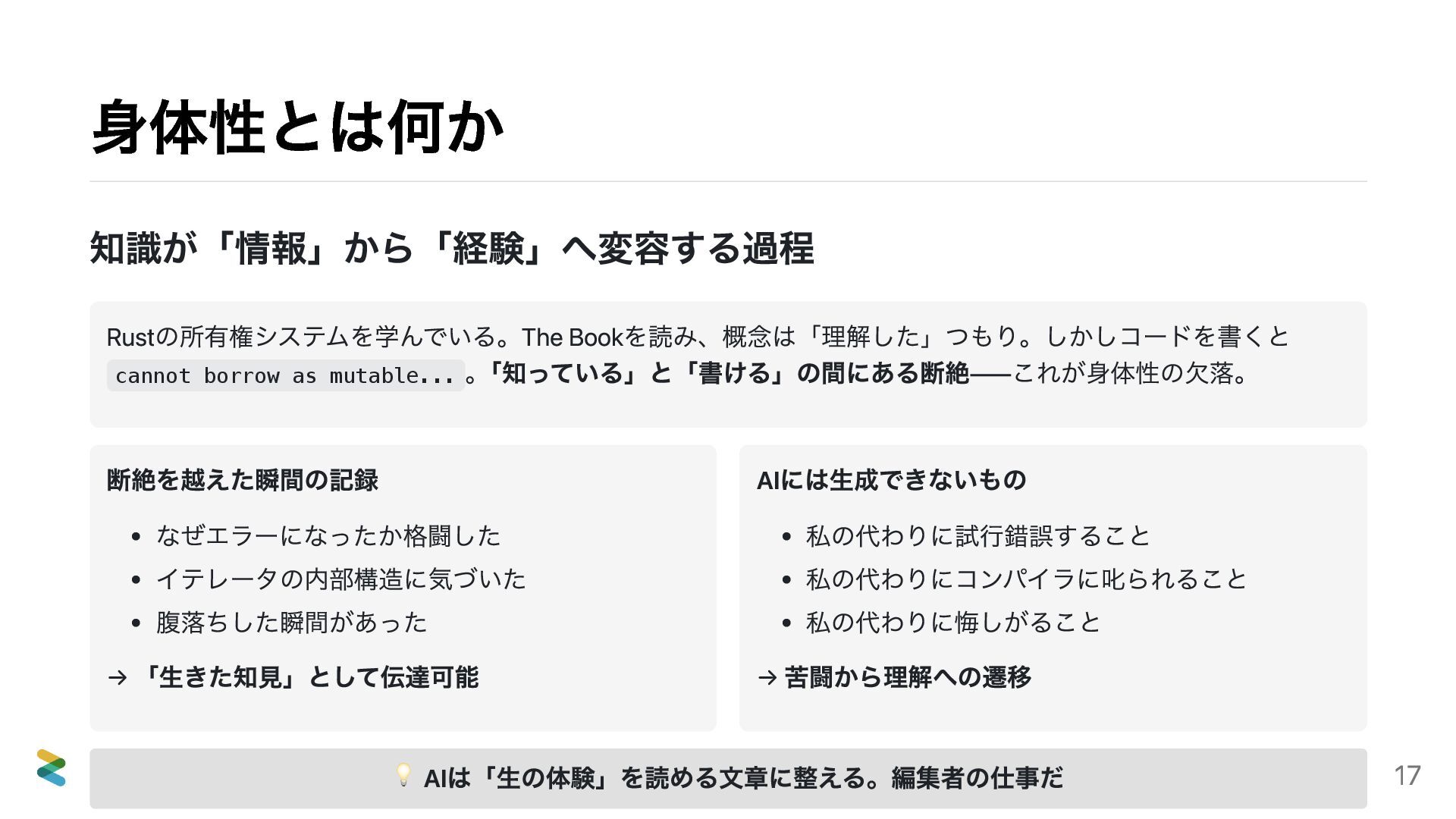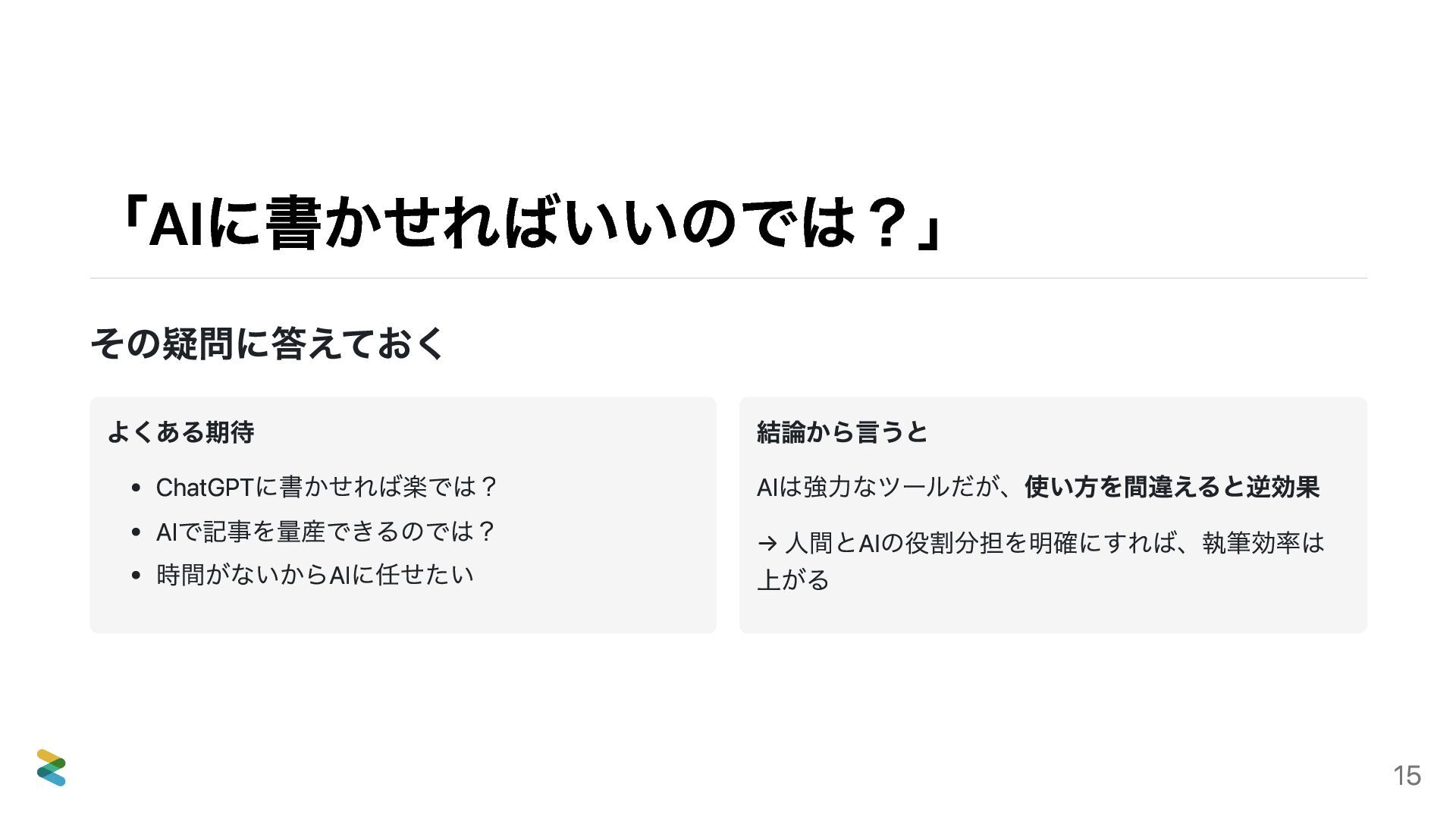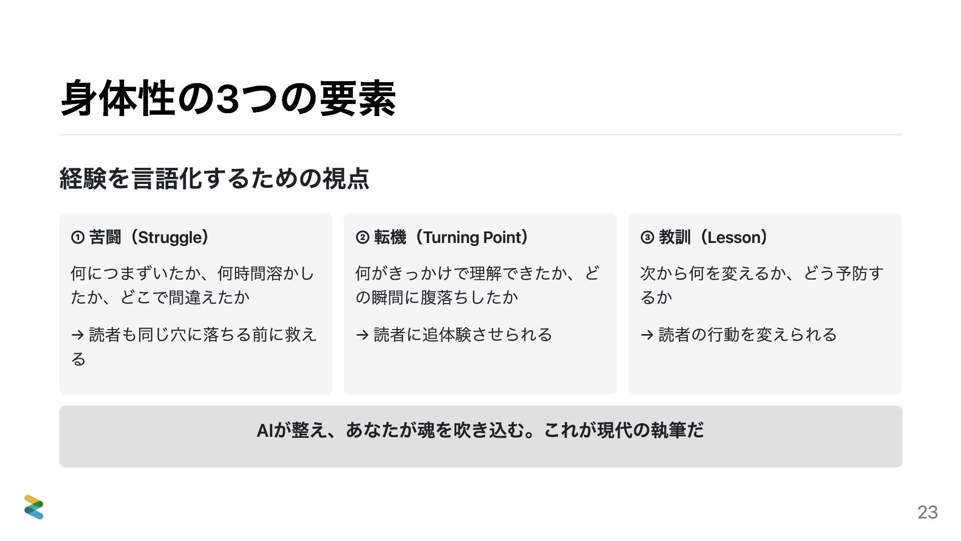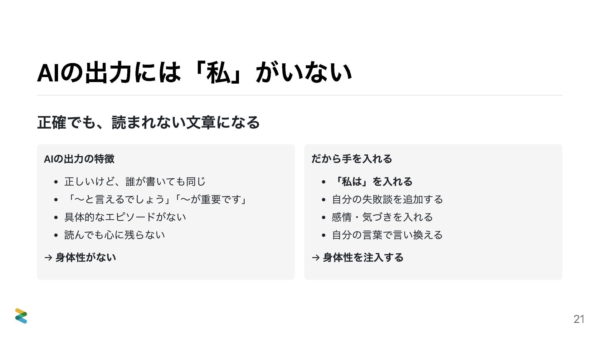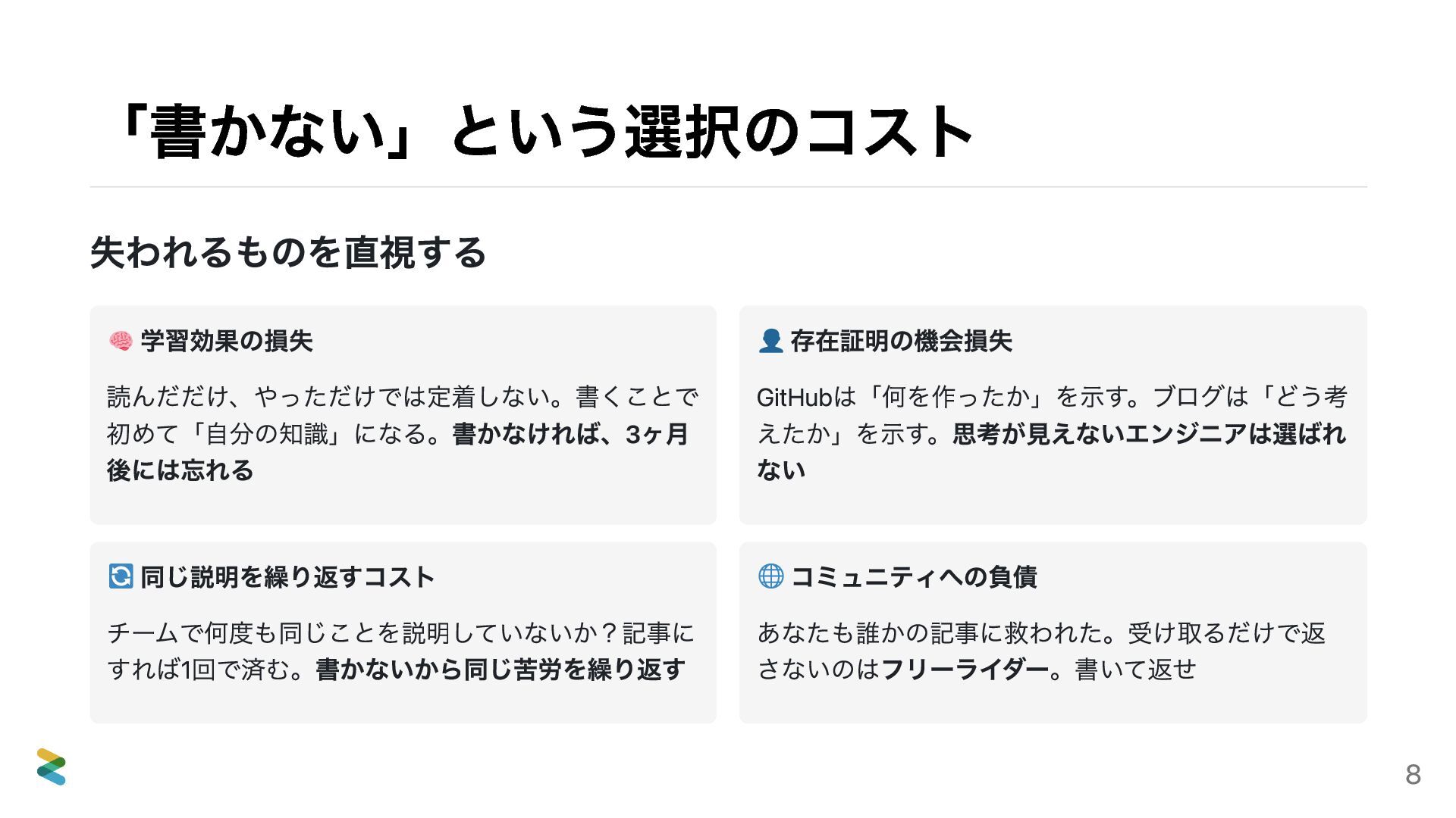 今日お話しすること 1. なぜ書くべきなのか 「書かない理由」を潰す 書かないコストを直視する 2. よくある失敗とAI活用 書けない・出せない・読まれない AIとの正しい付き合い方:身体性 3.