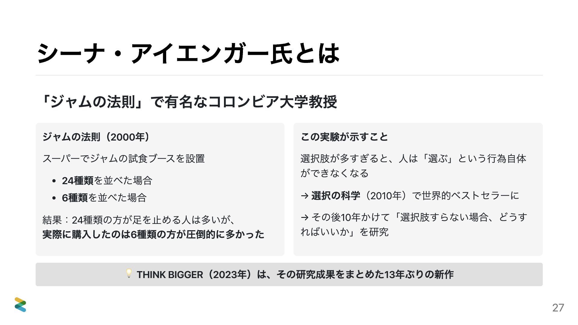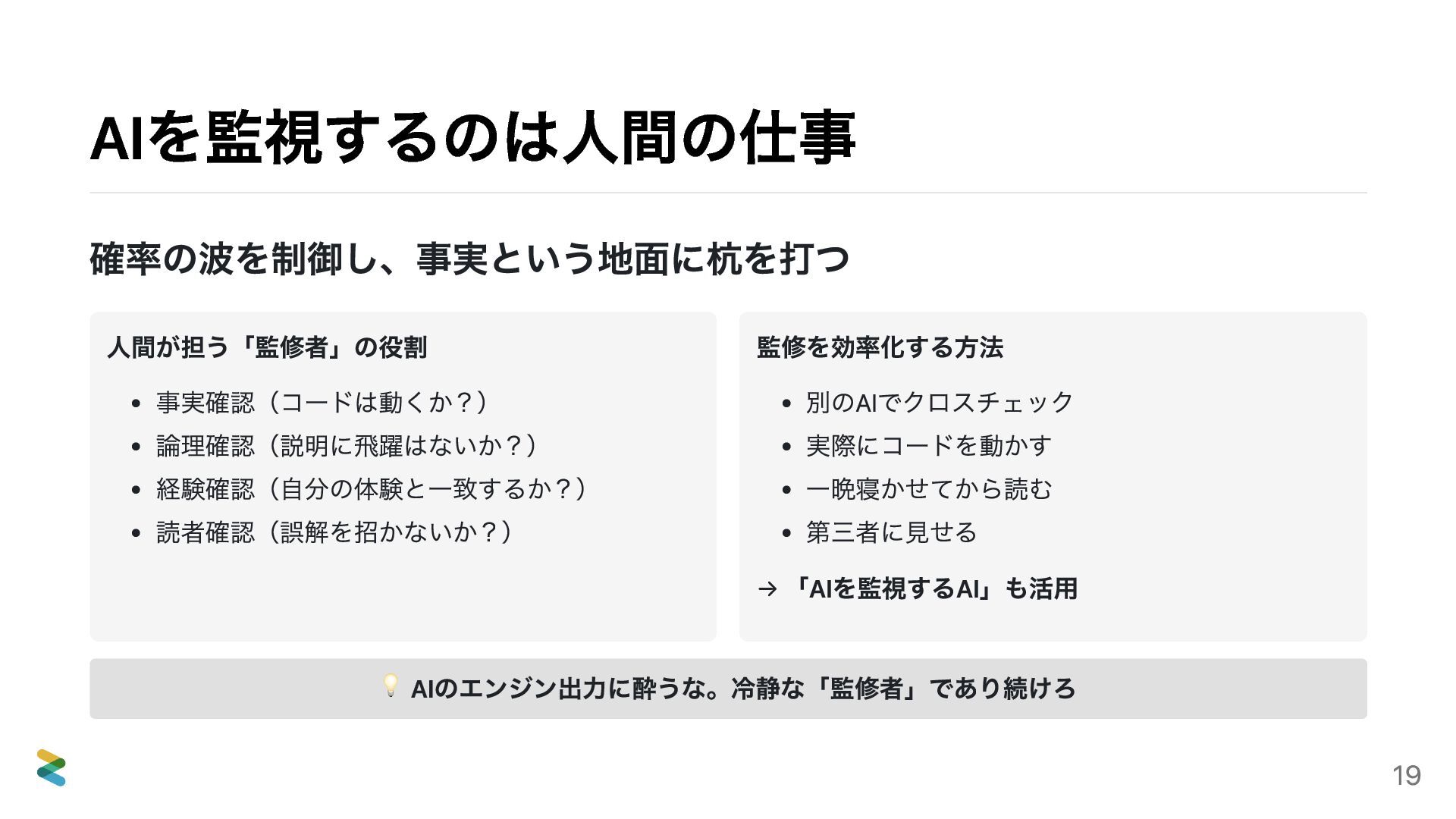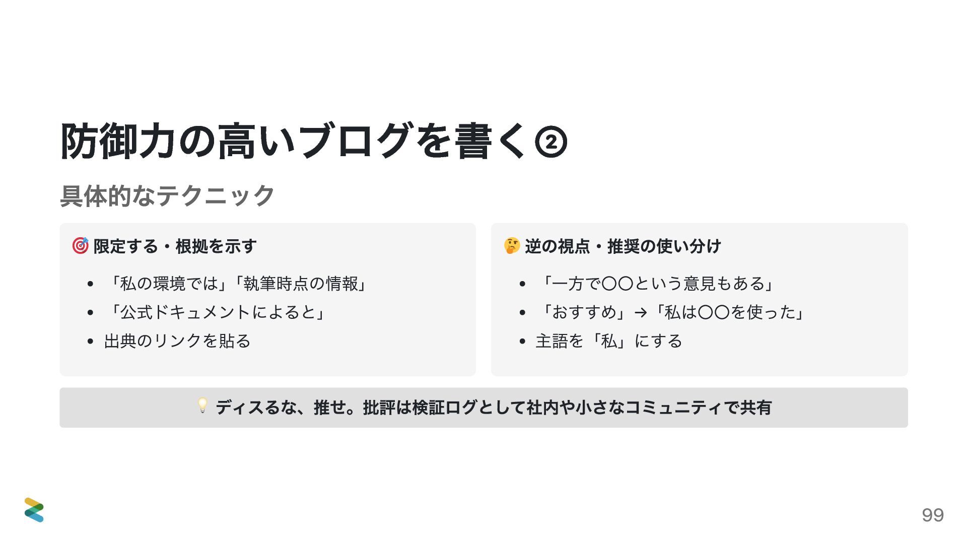 「〇〇の条件下では」 「2025年12月時点では」 → 経験の共有は反論しにくい 💡 断言は反発を招く。経験の共有は対話を生む 98