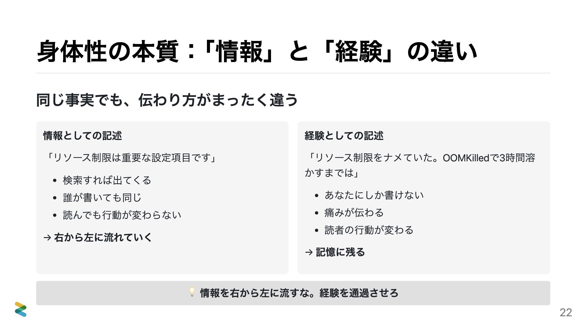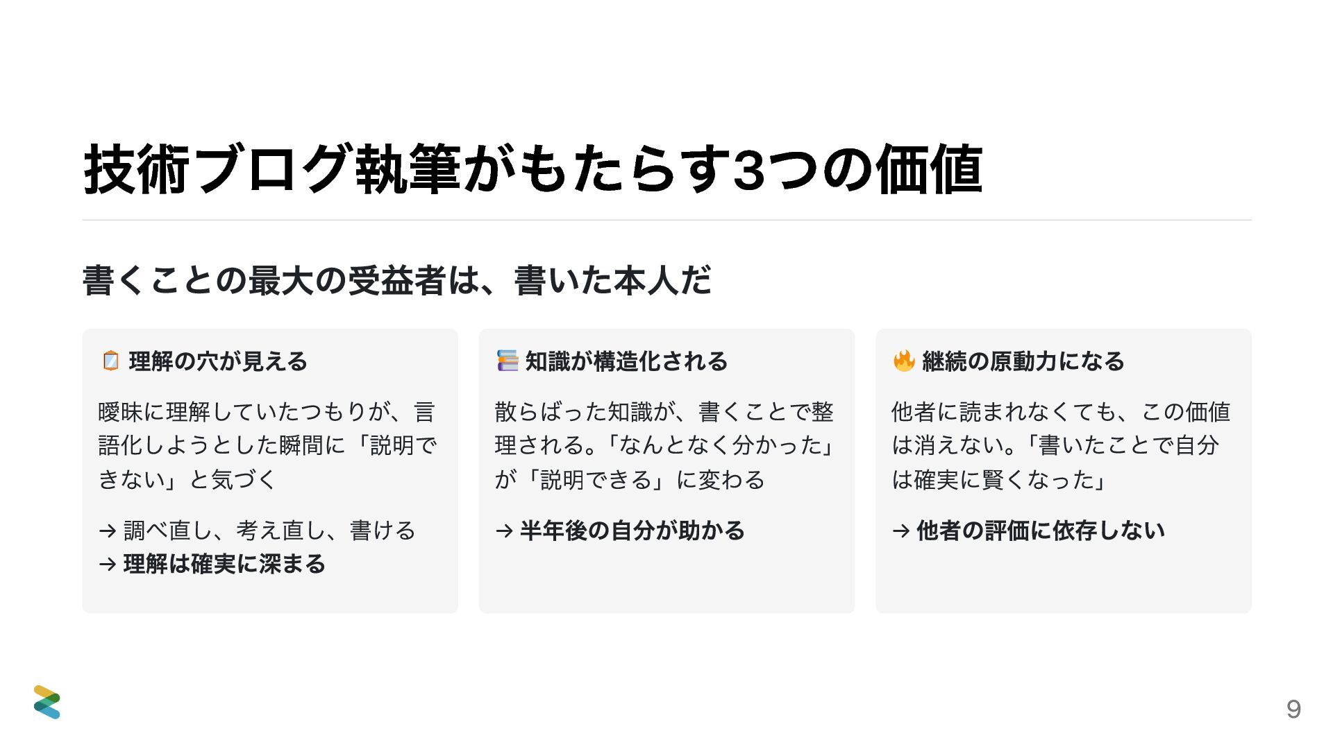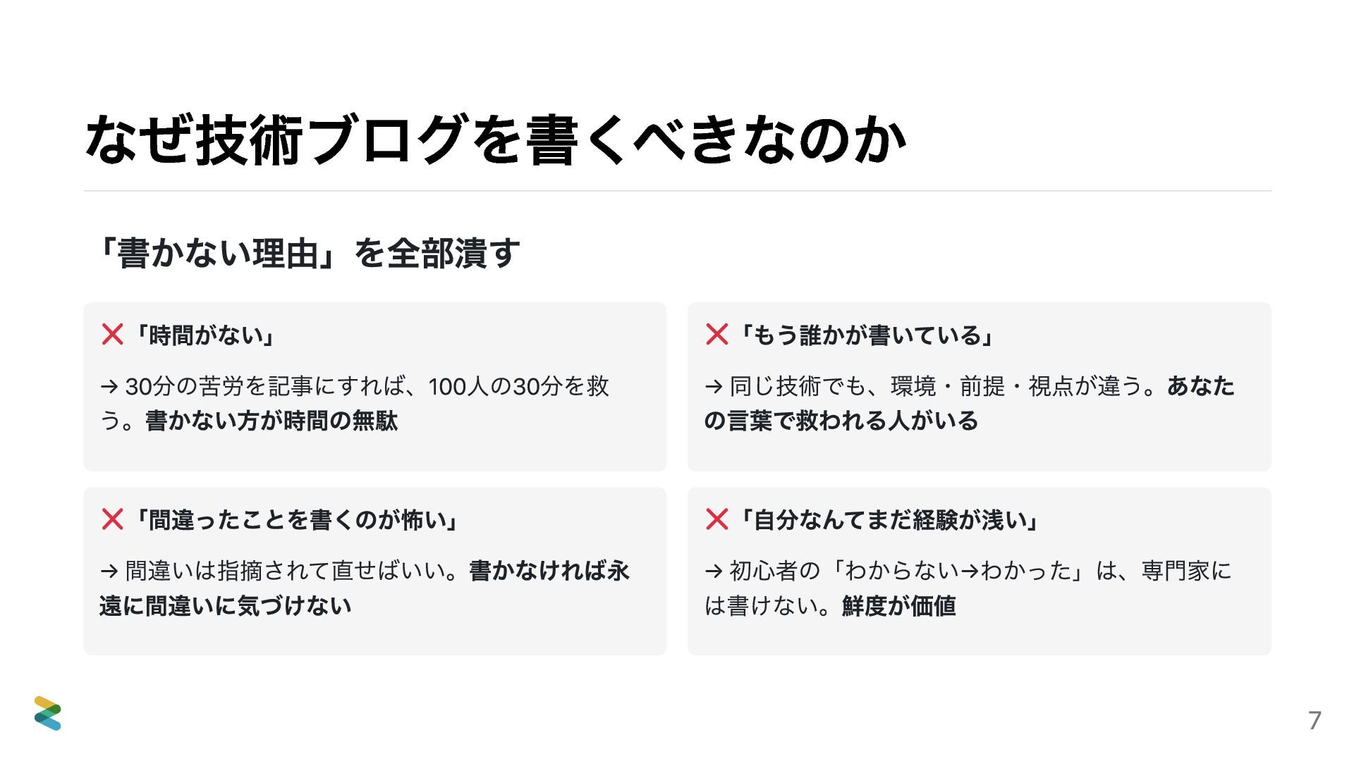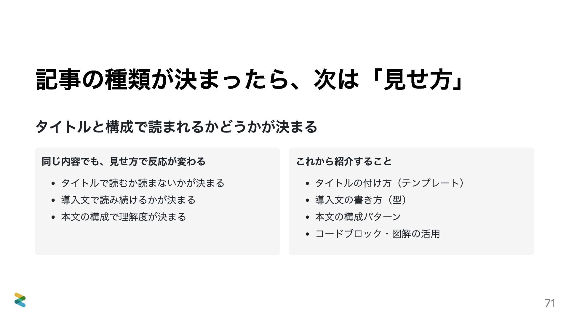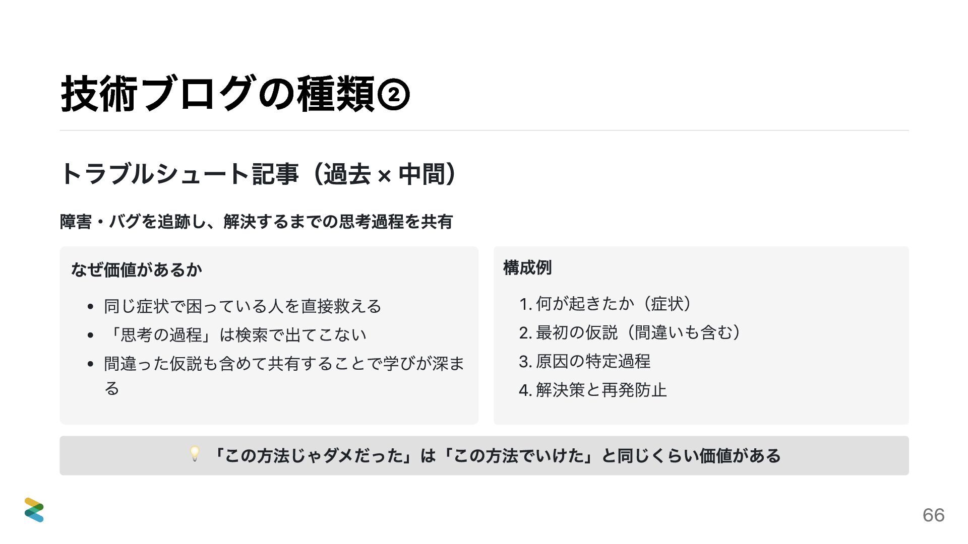 技術ブログの種類② トラブルシュート記事(過去 × 中間) 障害・バグを追跡し、解決するまでの思考過程を共有 なぜ価値があるか 同じ症状で困っている人を直接救える 「思考の過程」は検索で出てこない 間違った仮説も含めて共有することで学びが深ま る