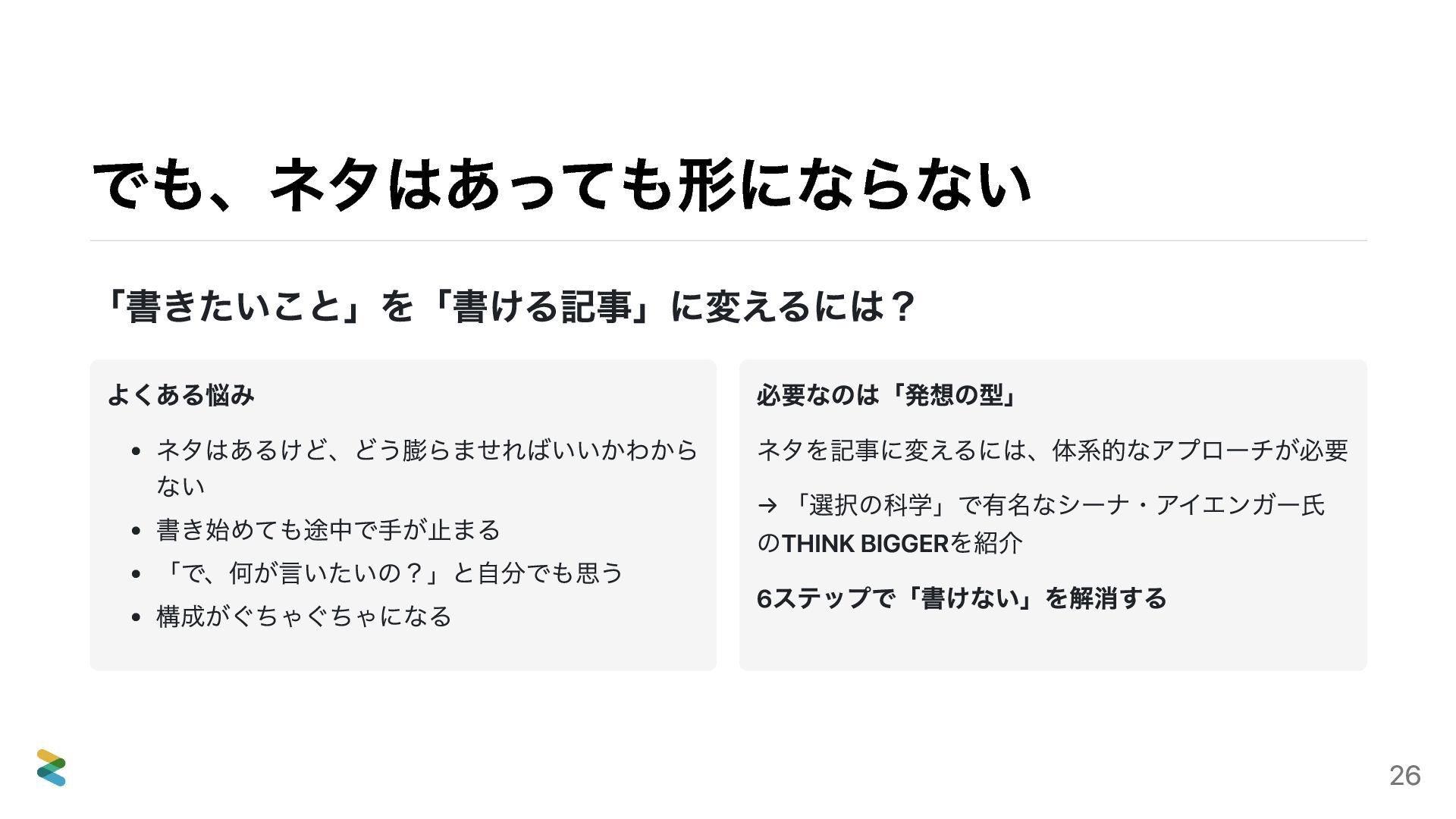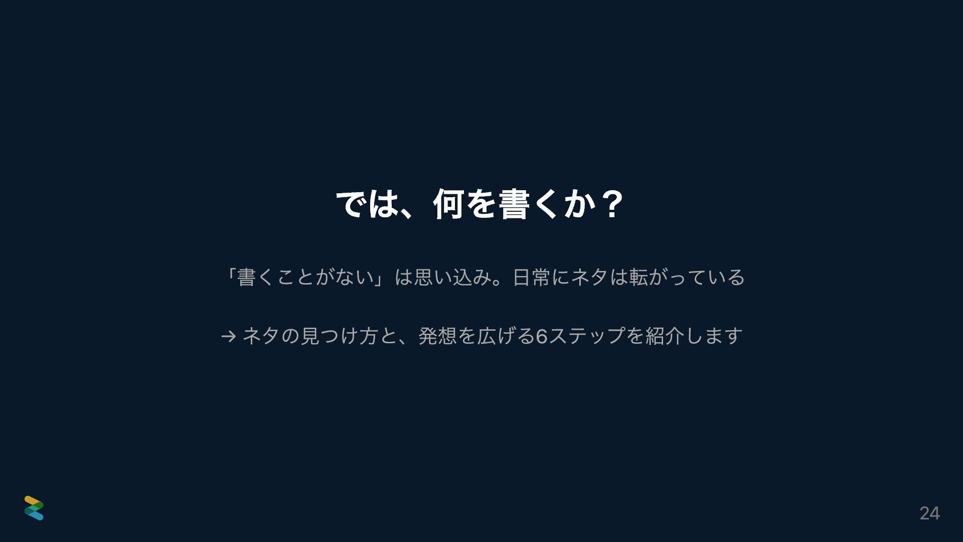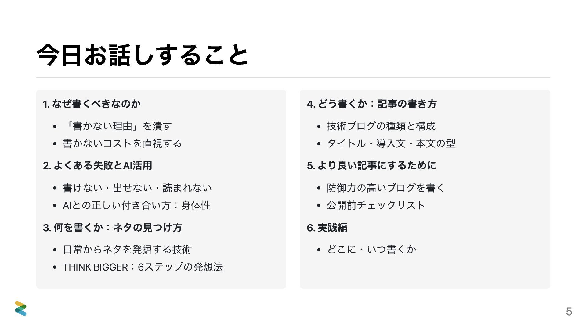 何を書くか:ネタの見つけ方 日常からネタを発掘する技術 THINK BIGGER:6ステップの発想法 4. どう書くか:記事の書き方 技術ブログの種類と構成 タイトル・導入文・本文の型 5. より良い記事にするために 防御力の高いブログを書く 公開前チェックリスト 6. 実践編 どこに・いつ書くか 5