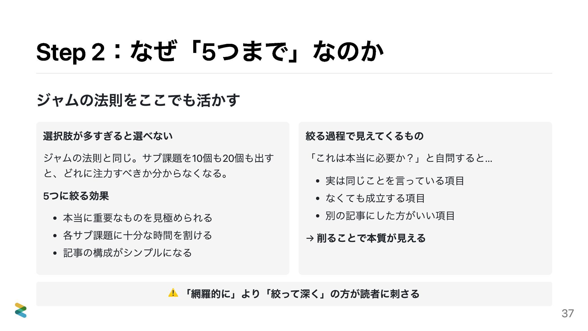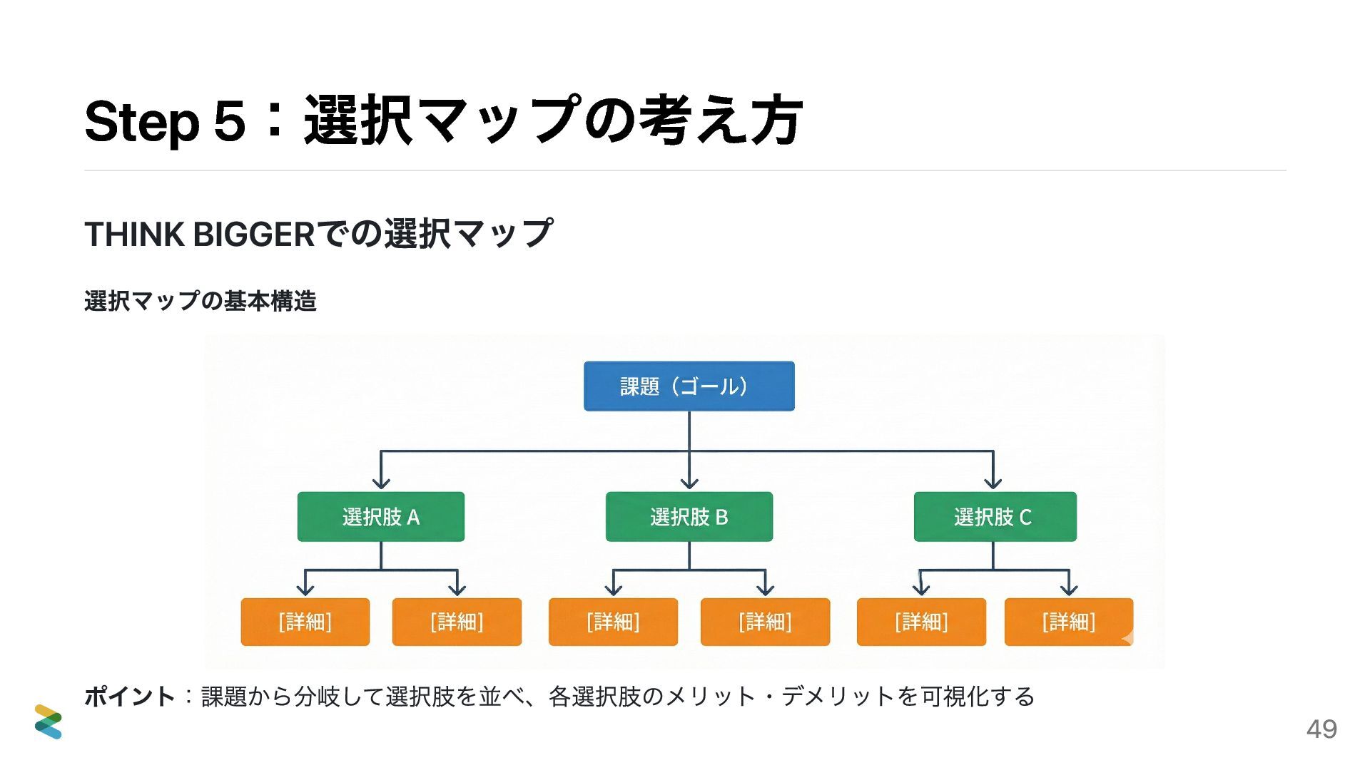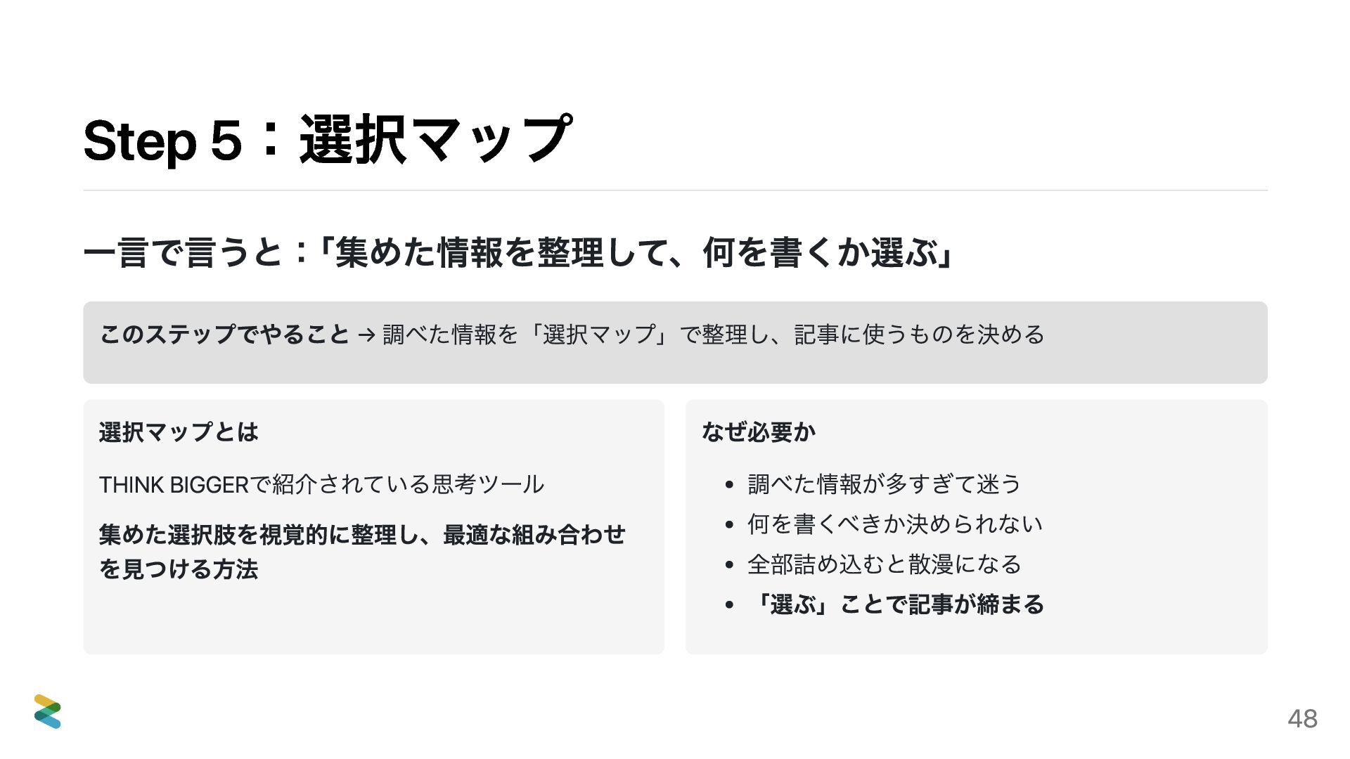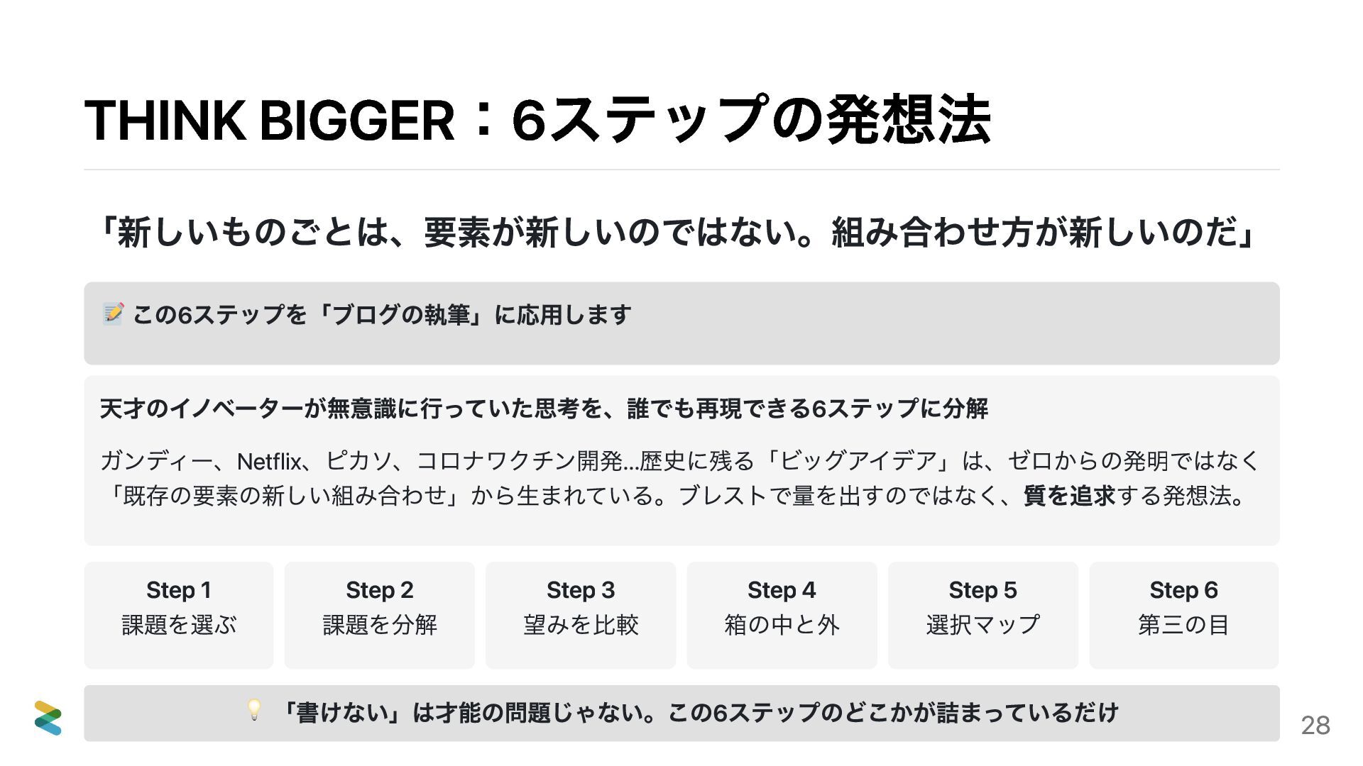 6ステップのまとめ② 選択の連続で記事は生まれる THINK BIGGERの本質: 「選ぶ」ことの連続 課題を選ぶ → サブ課題を選ぶ → 望みを選ぶ