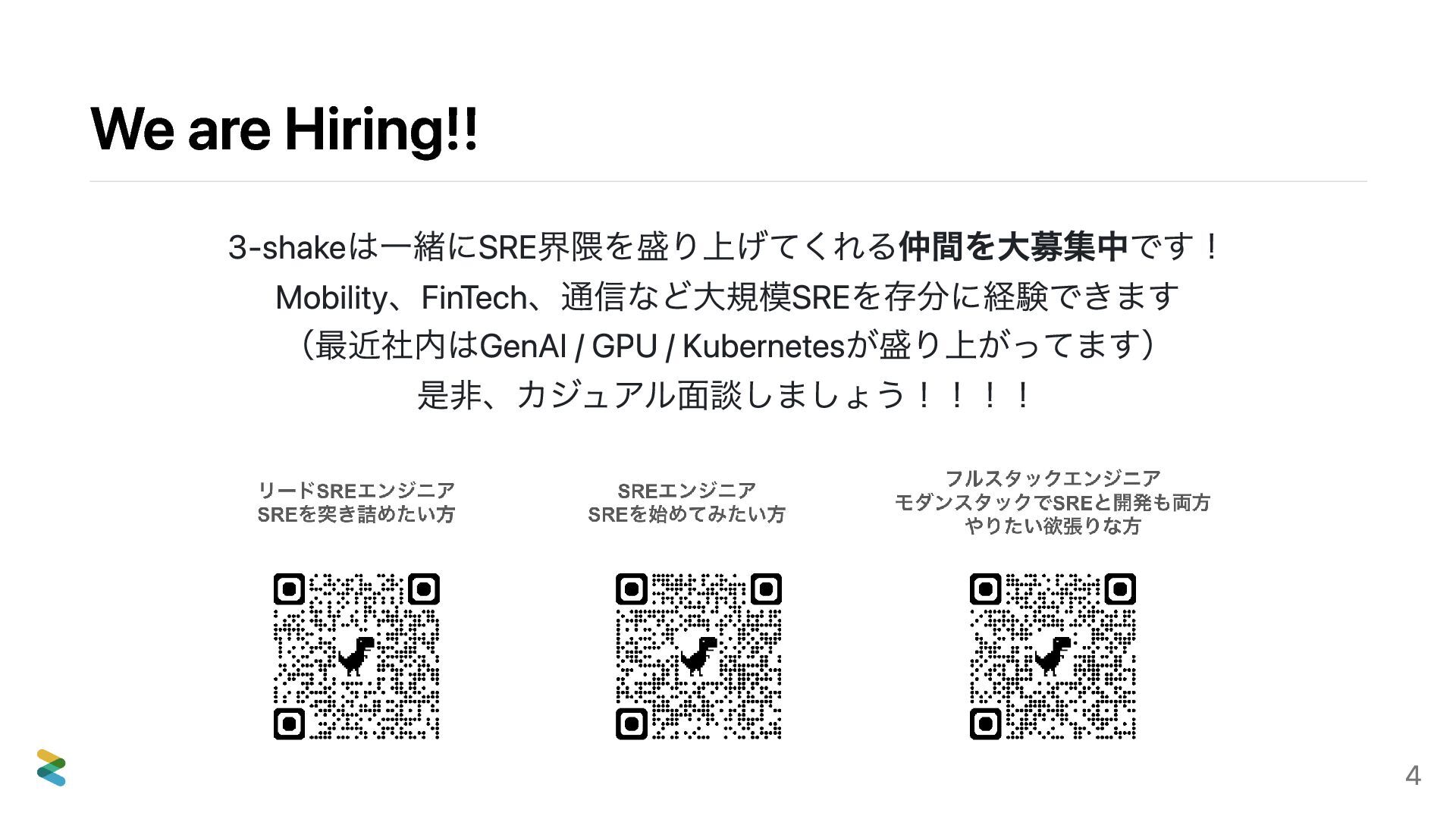 We are Hiring!! 3-shakeは一緒にSRE界隈を盛り上げてくれる仲間を大募集中です! Mobility、FinTech、通信など大規模SREを存分に経験できます (最近社内はGenAI / GPU / Kubernetesが盛り上がってます)