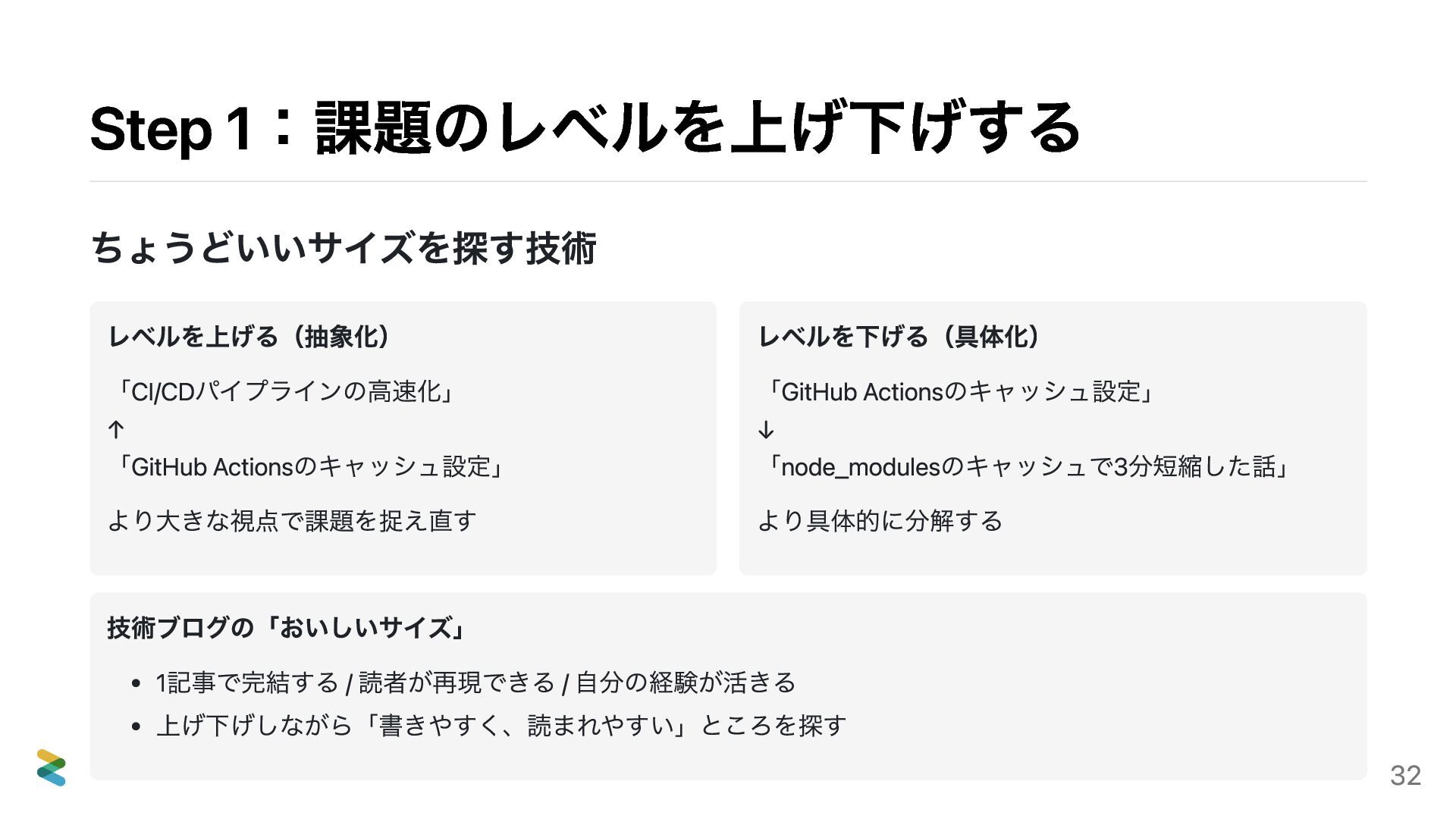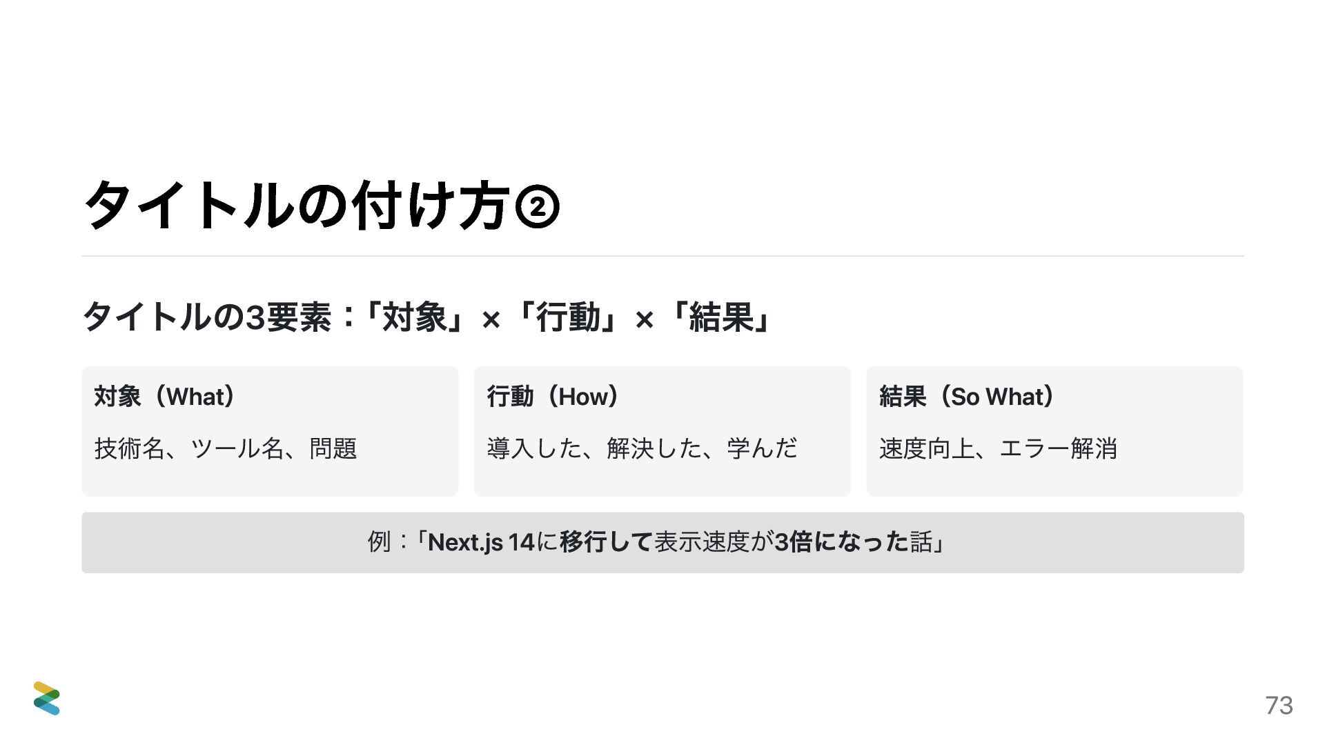 タイトルの付け方② タイトルの3要素: 「対象」×「行動」×「結果」 対象(What) 技術名、ツール名、問題 行動(How) 導入した、解決した、学んだ 結果(So What) 速度向上、エラー解消
