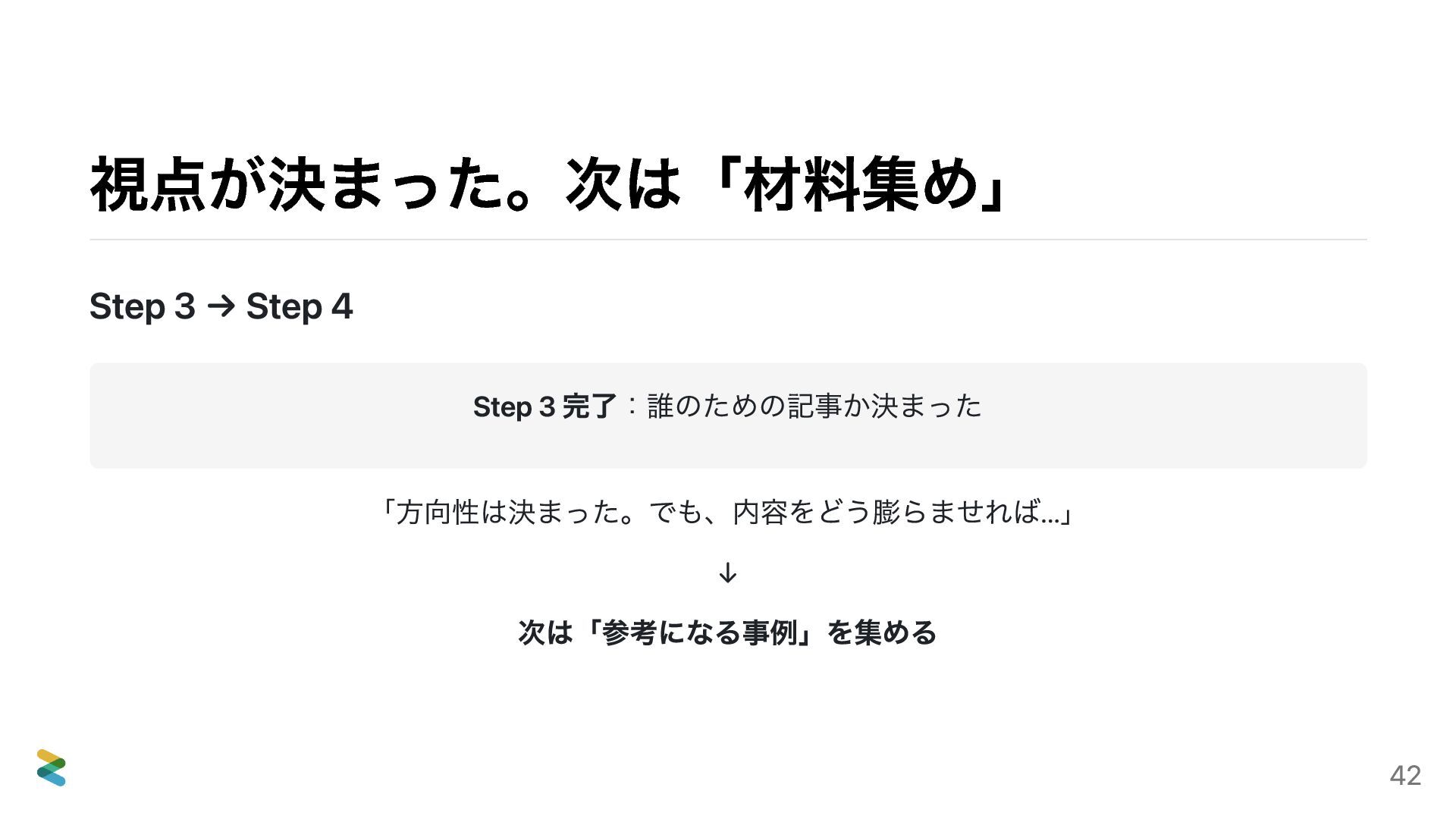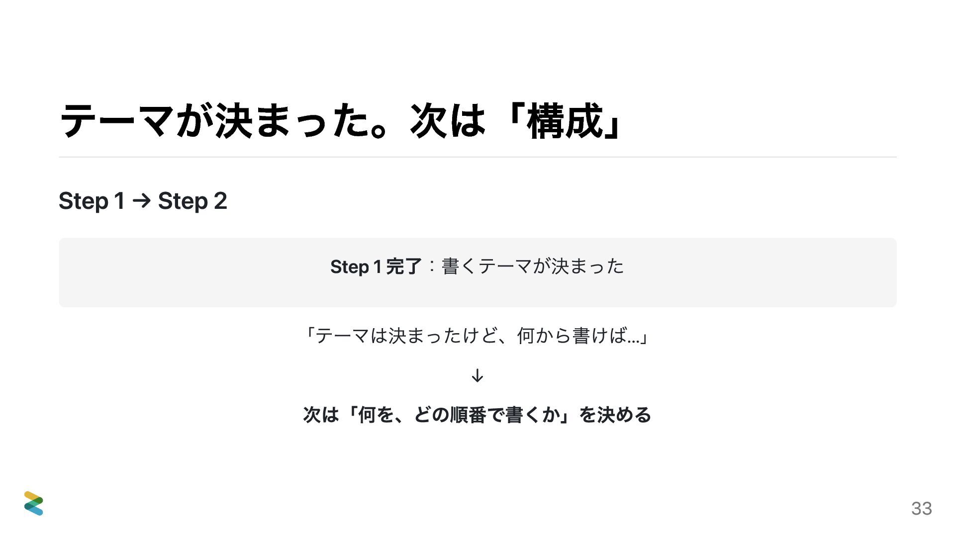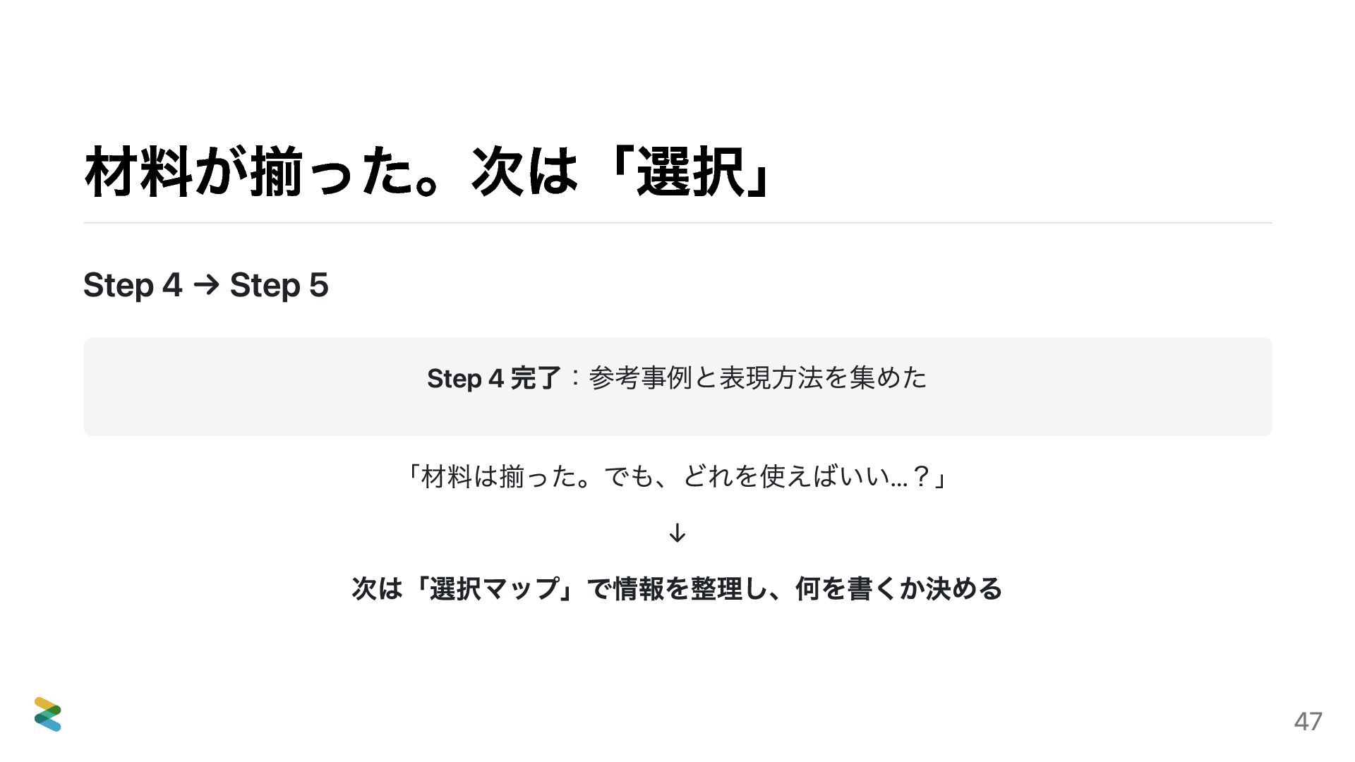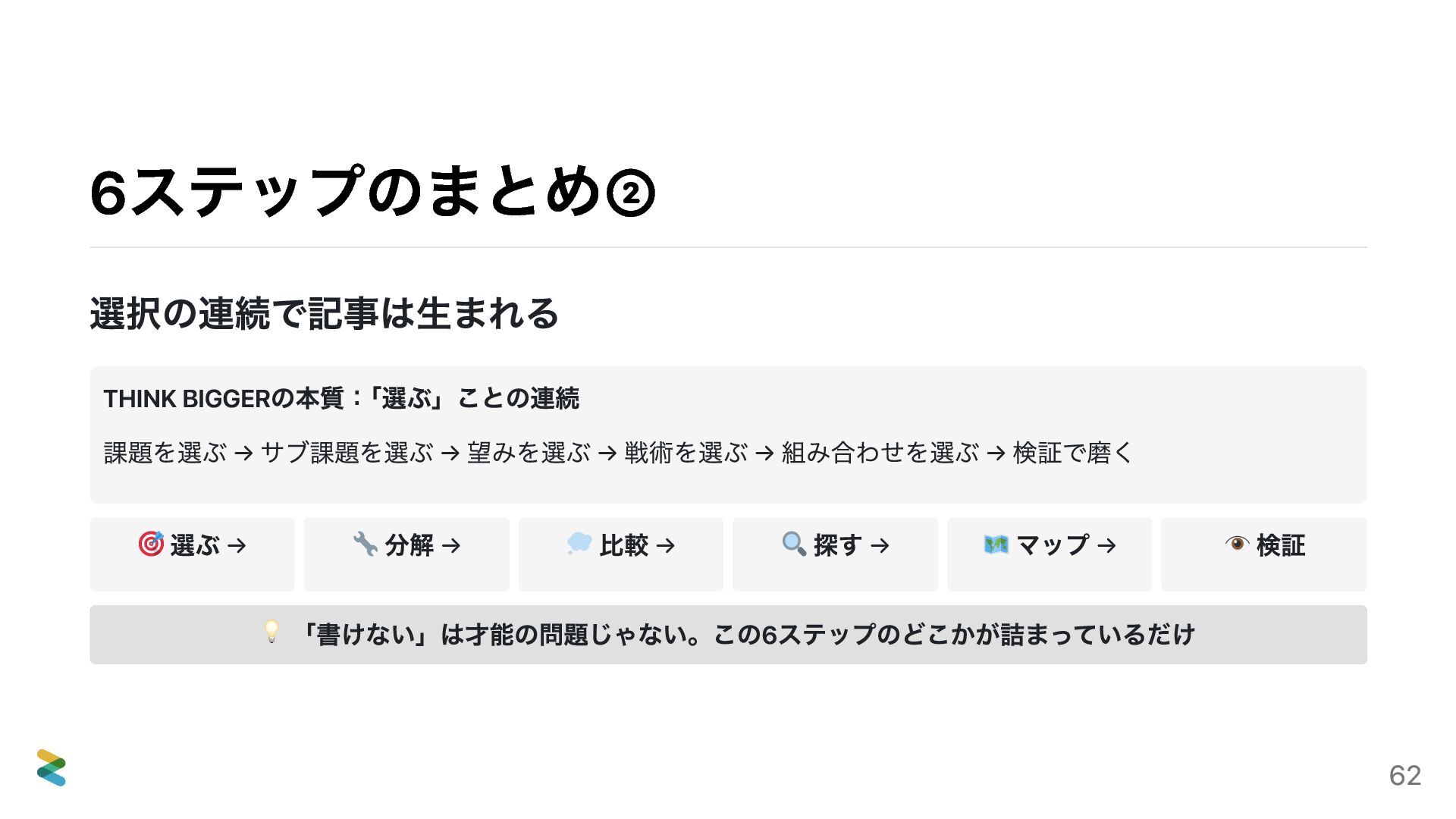 → 戦術を選ぶ → 組み合わせを選ぶ → 検証で磨く 選ぶ → 分解 → 比較 → 探す → マップ → 検証 💡 「書けない」は才能の問題じゃない。この6ステップのどこかが詰まっているだけ 63