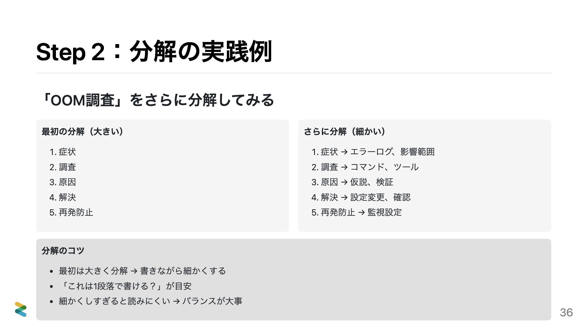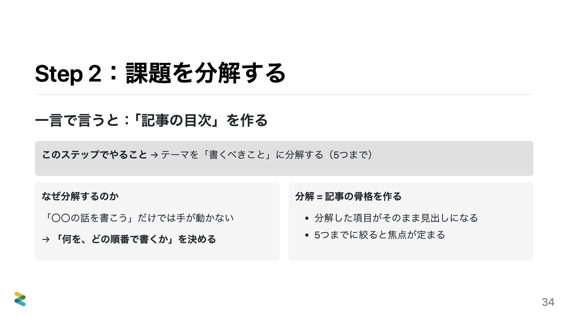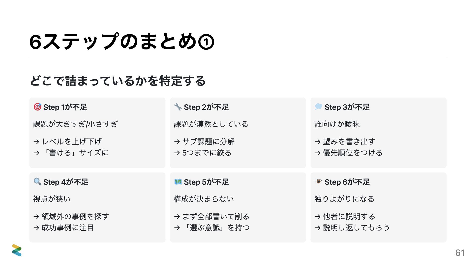 6ステップのまとめ① どこで詰まっているかを特定する Step 1が不足 課題が大きすぎ/小さすぎ → レベルを上げ下げ → 「書ける」サイズに Step