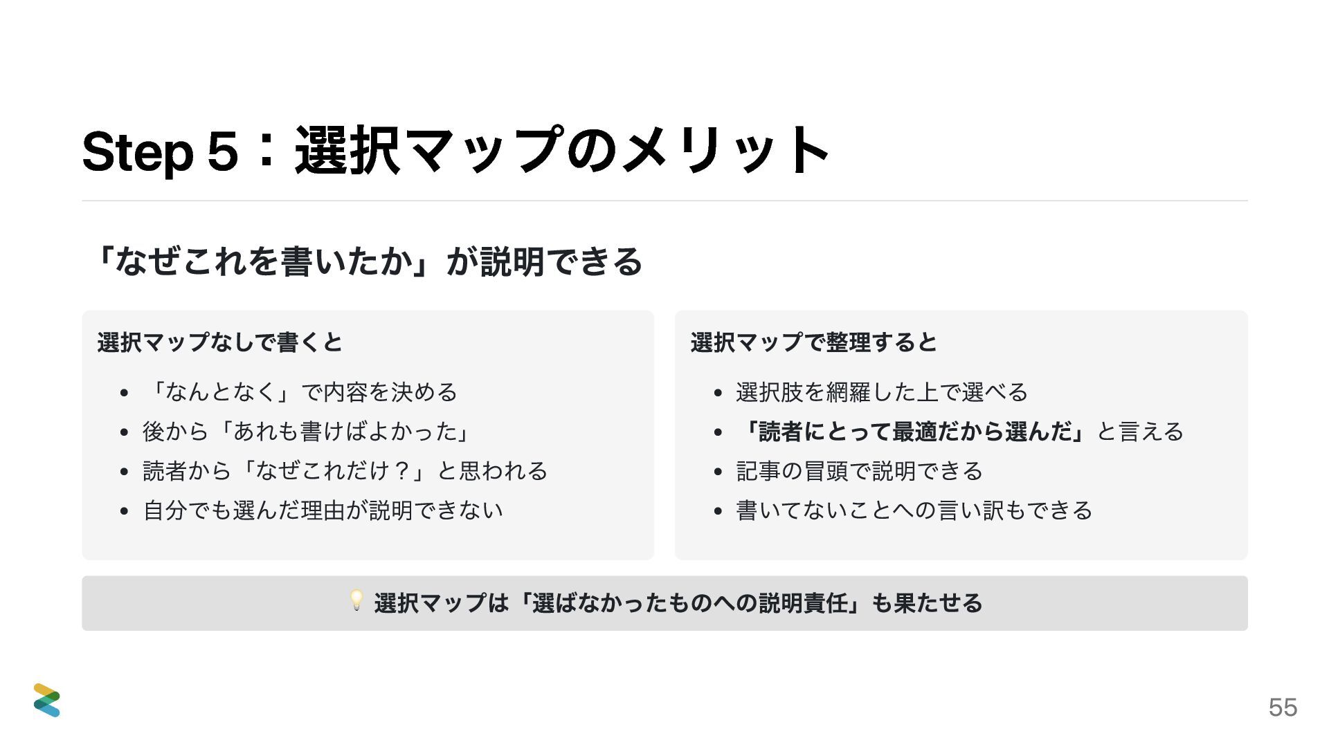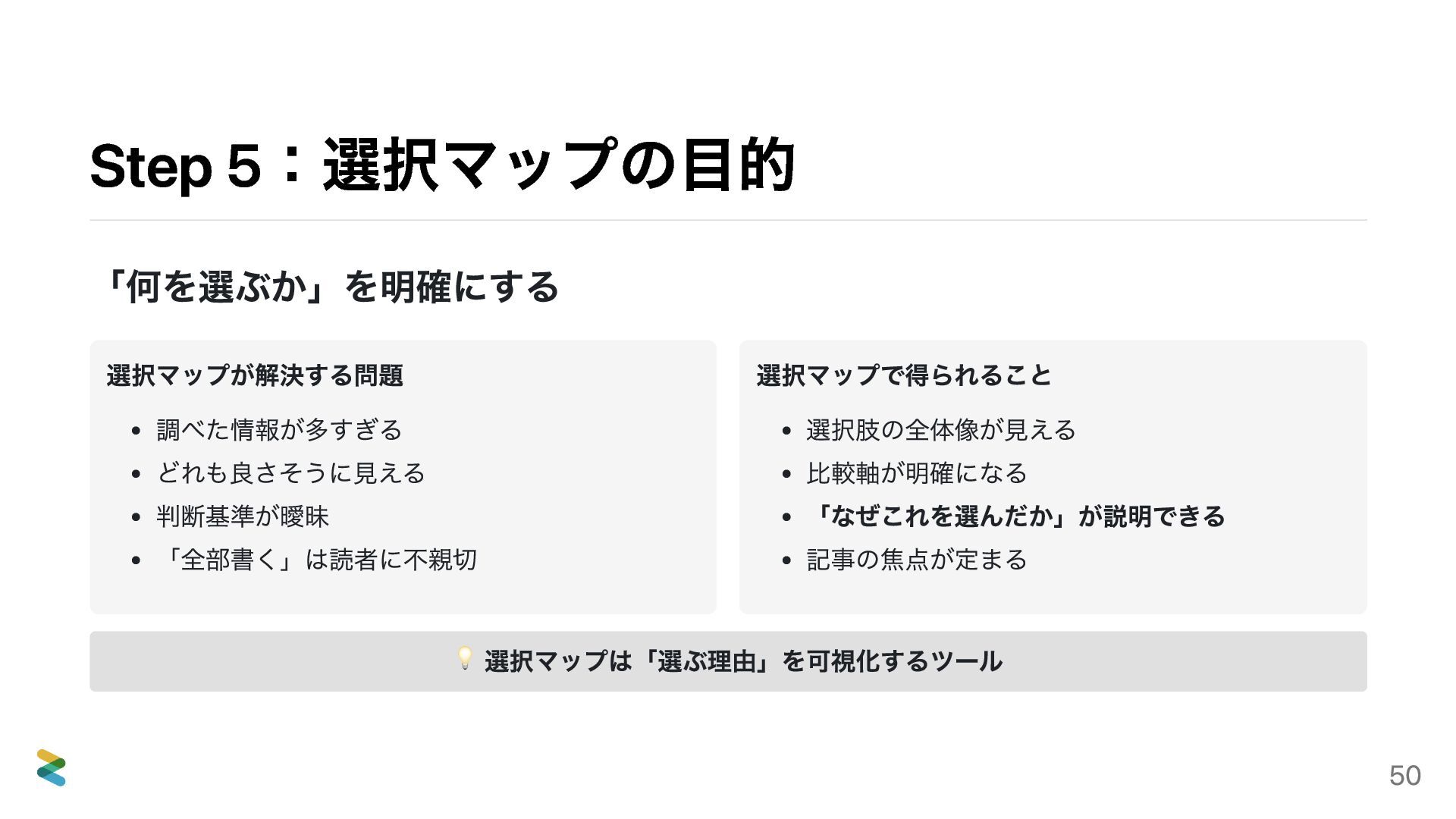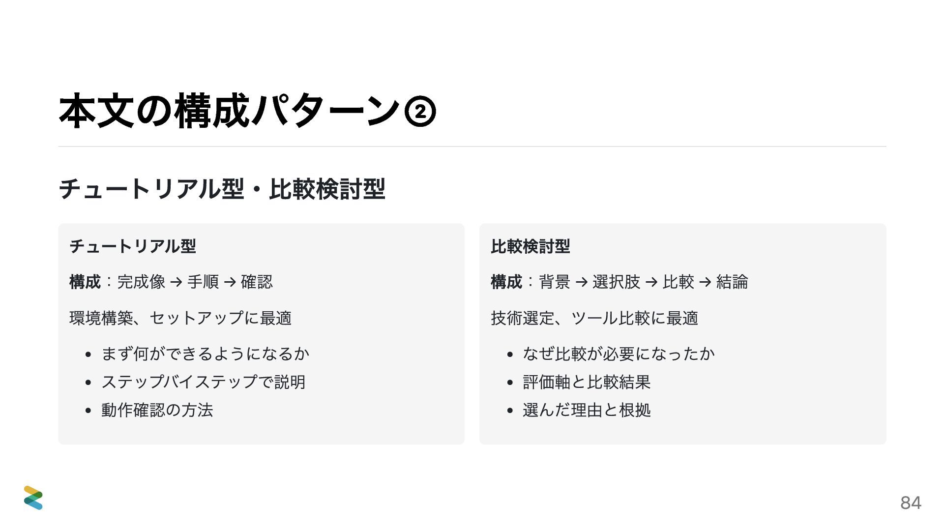 ステップバイステップで説明 動作確認の方法 比較検討型 構成:背景 → 選択肢 → 比較 → 結論 技術選定、ツール比較に最適 なぜ比較が必要になったか 評価軸と比較結果 選んだ理由と根拠 86