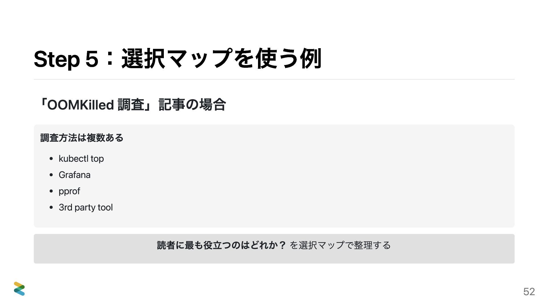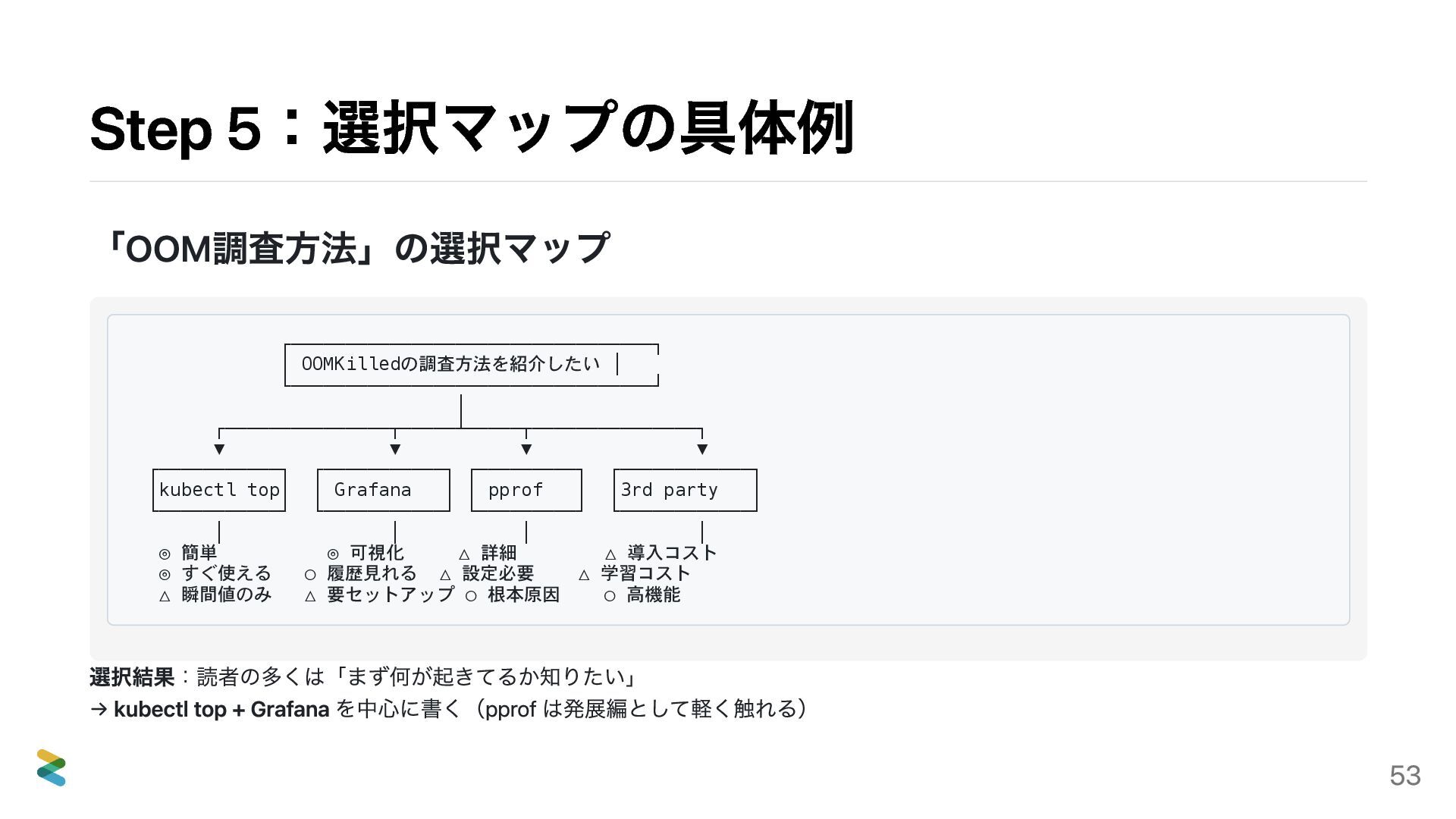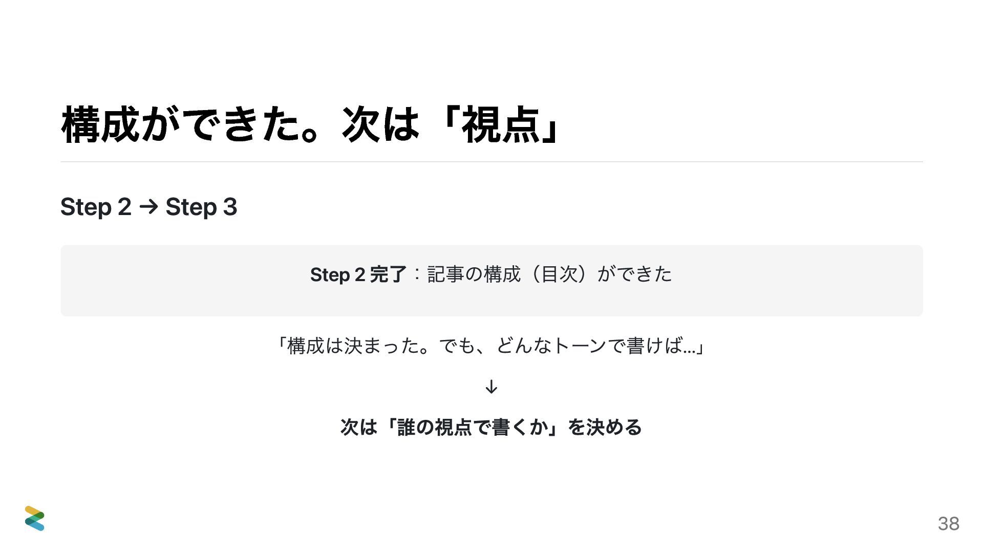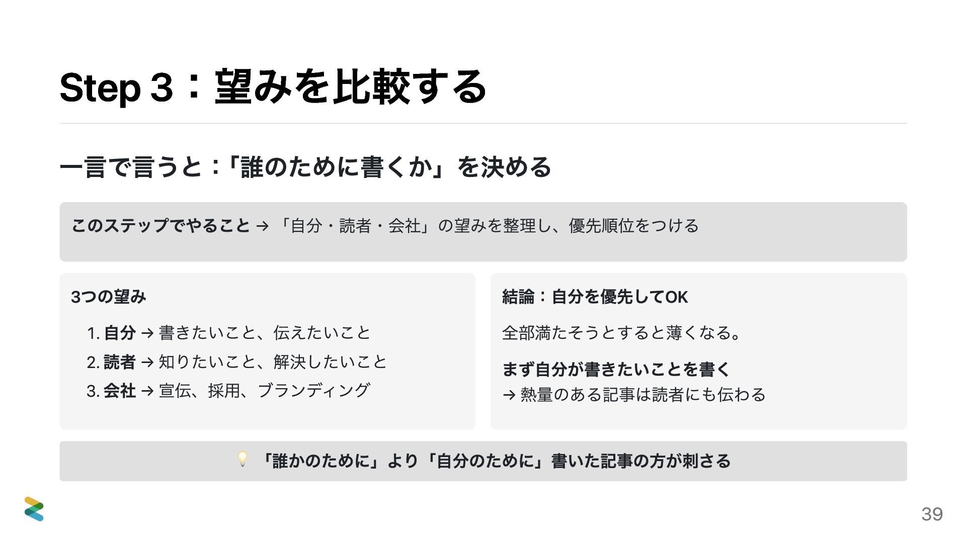 ステップバイステップで説明 動作確認の方法 比較検討型 構成:背景 → 選択肢 → 比較 → 結論 技術選定、ツール比較に最適 なぜ比較が必要になったか 評価軸と比較結果 選んだ理由と根拠 86