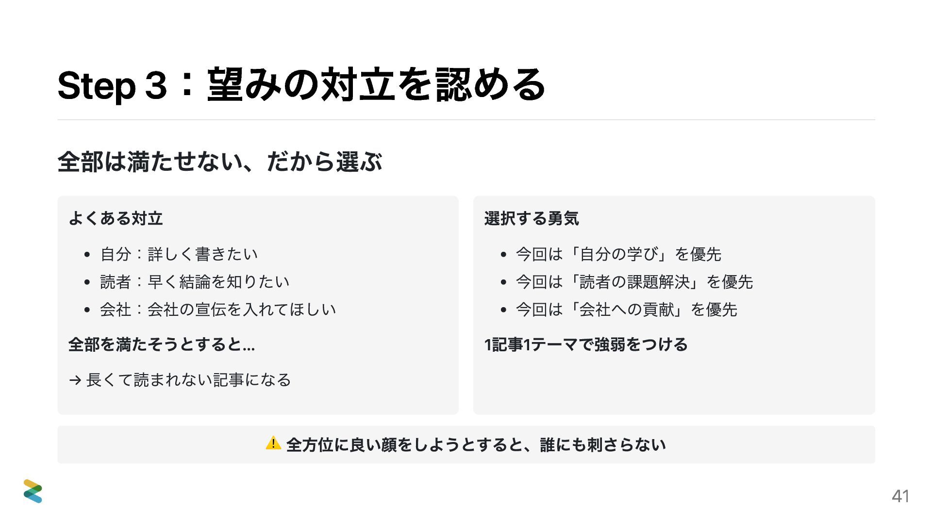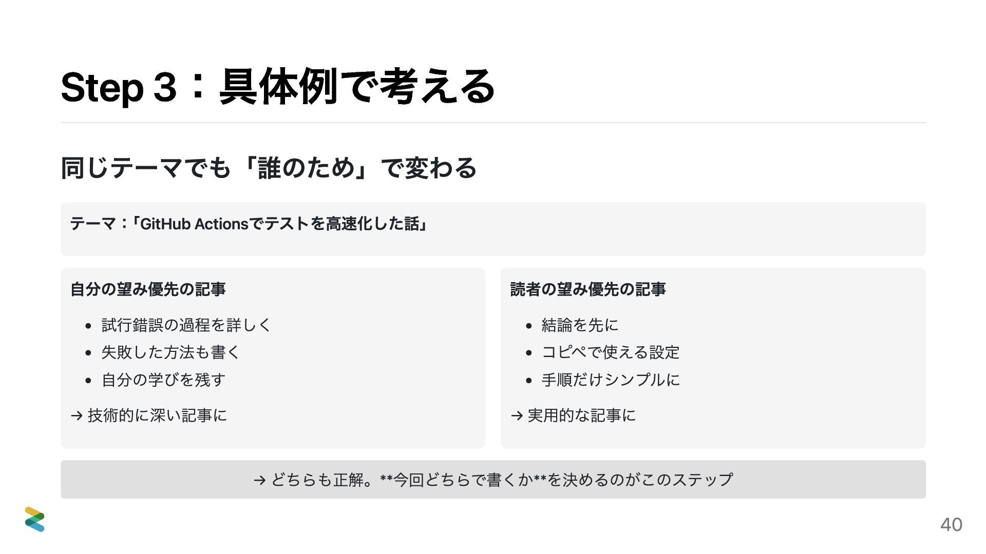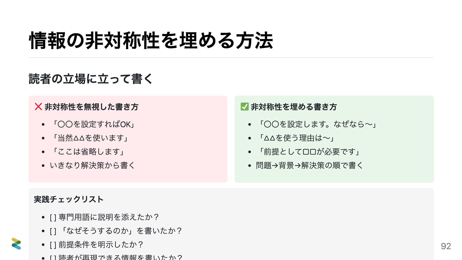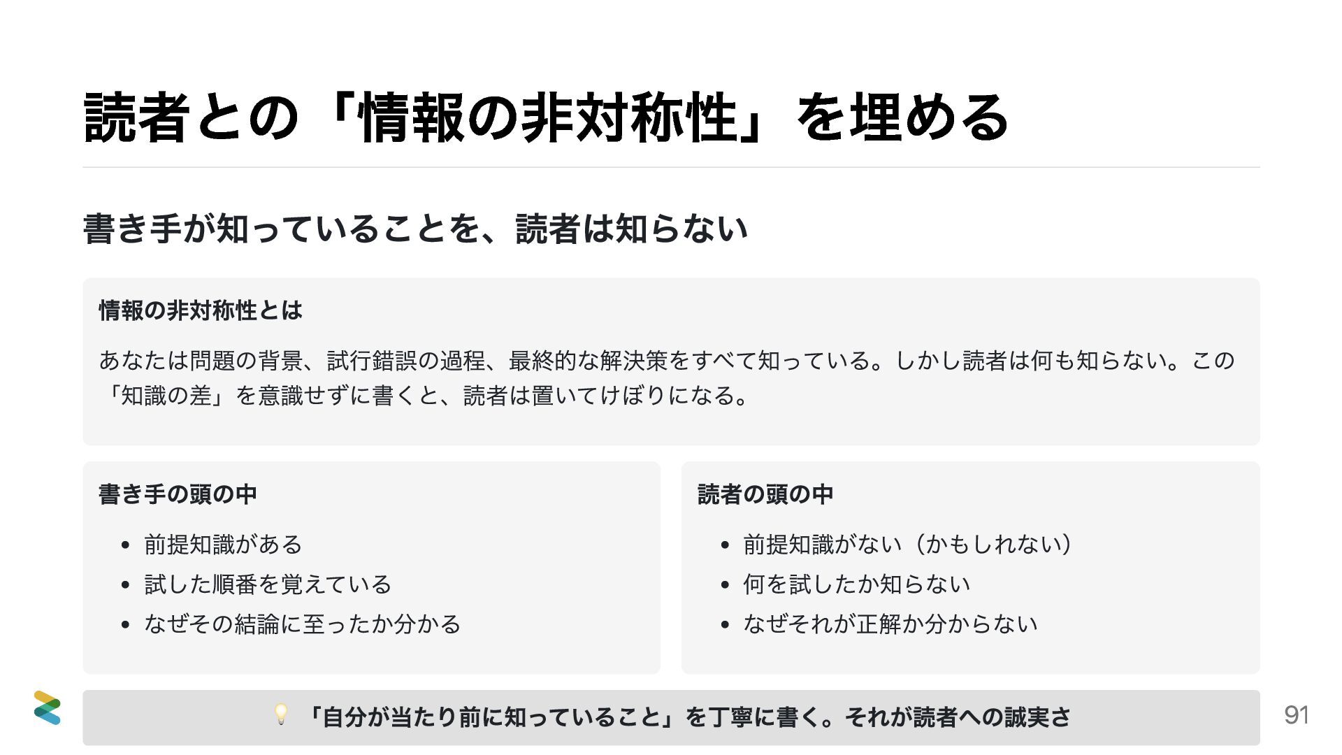 情報の非対称性を埋める方法 読者の立場に立って書く 非対称性を無視した書き方 「〇〇を設定すればOK」 「当然△△を使います」 「ここは省略します」 いきなり解決策から書く 非対称性を埋める書き方 「〇〇を設定します。なぜなら〜」 「△△を使う理由は〜」