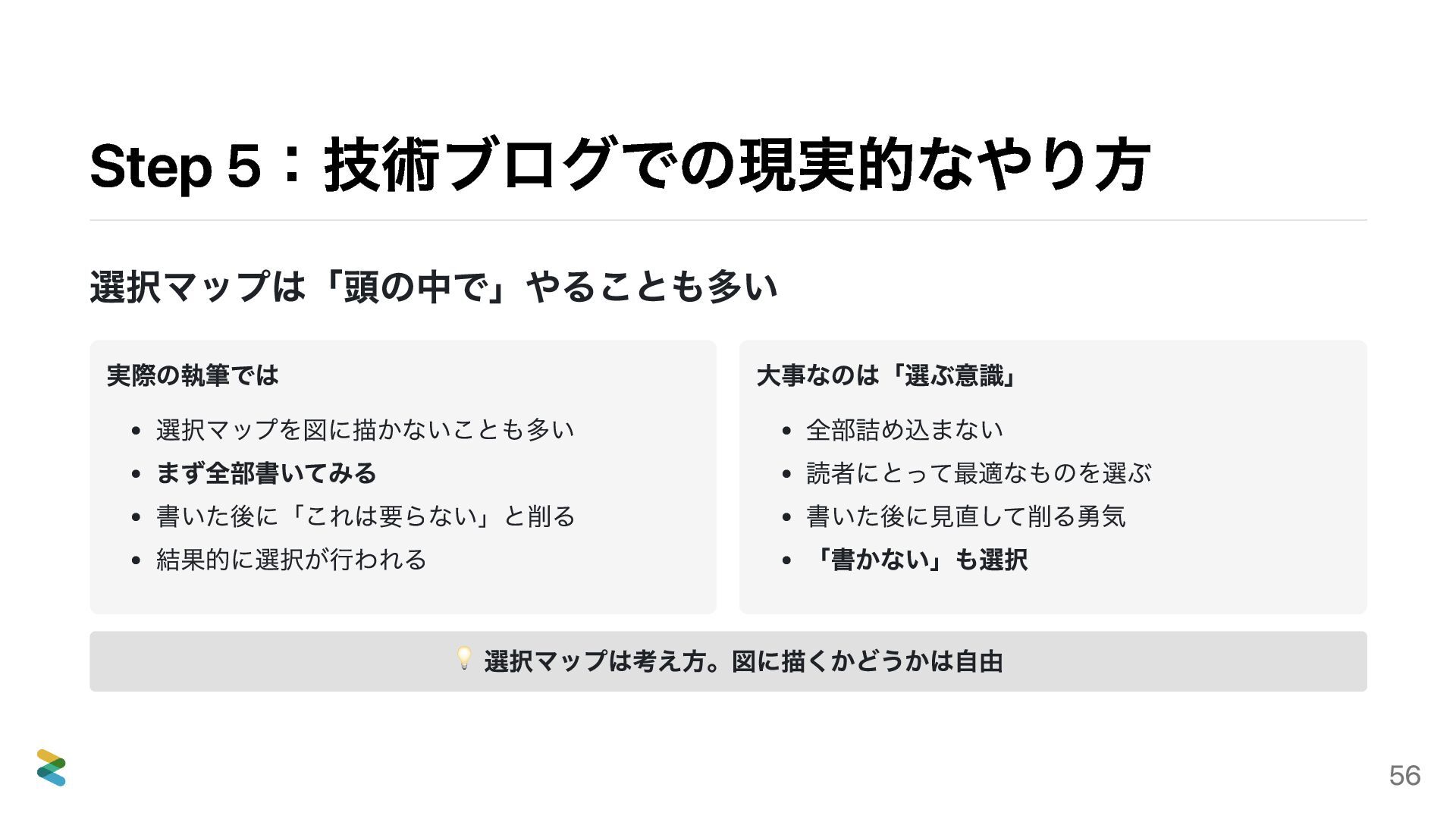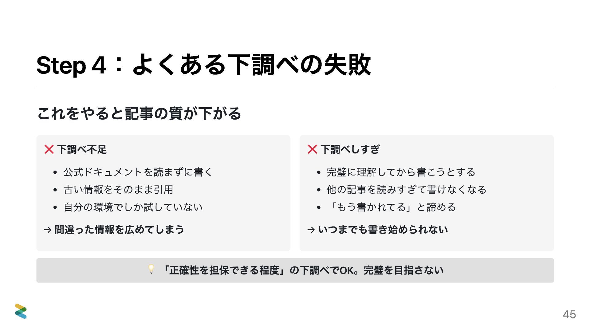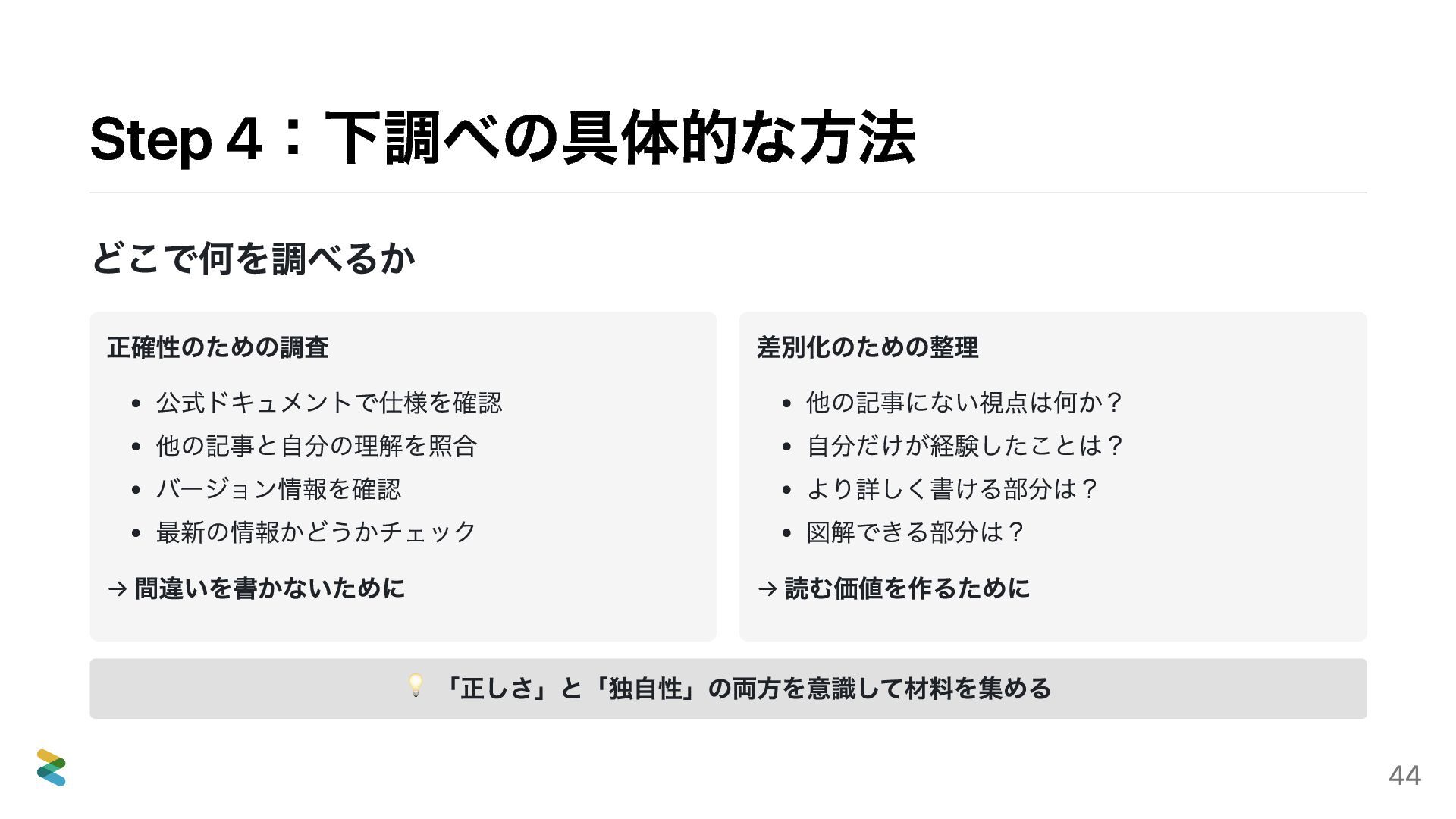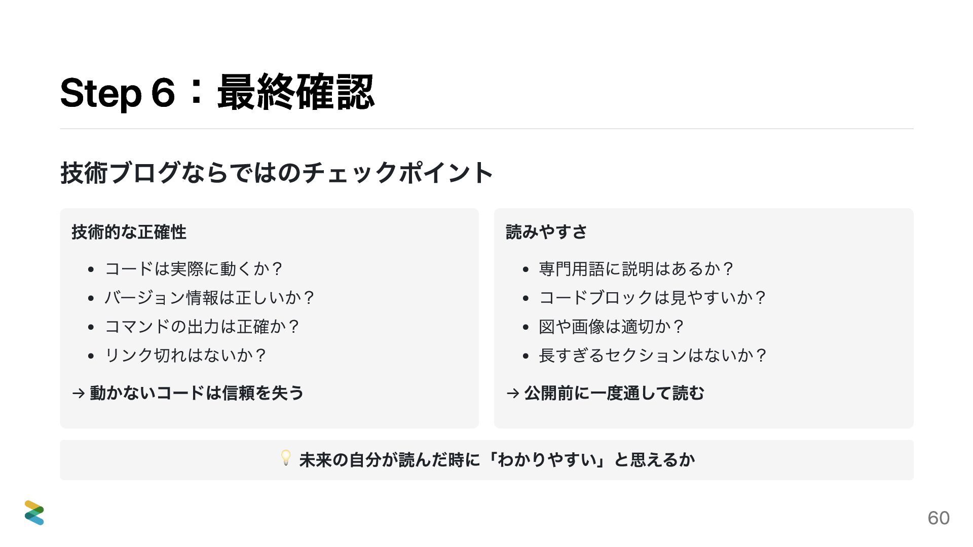 Step 6:最終確認 技術ブログならではのチェックポイント 技術的な正確性 コードは実際に動くか? バージョン情報は正しいか? コマンドの出力は正確か? リンク切れはないか? → 動かないコードは信頼を失う