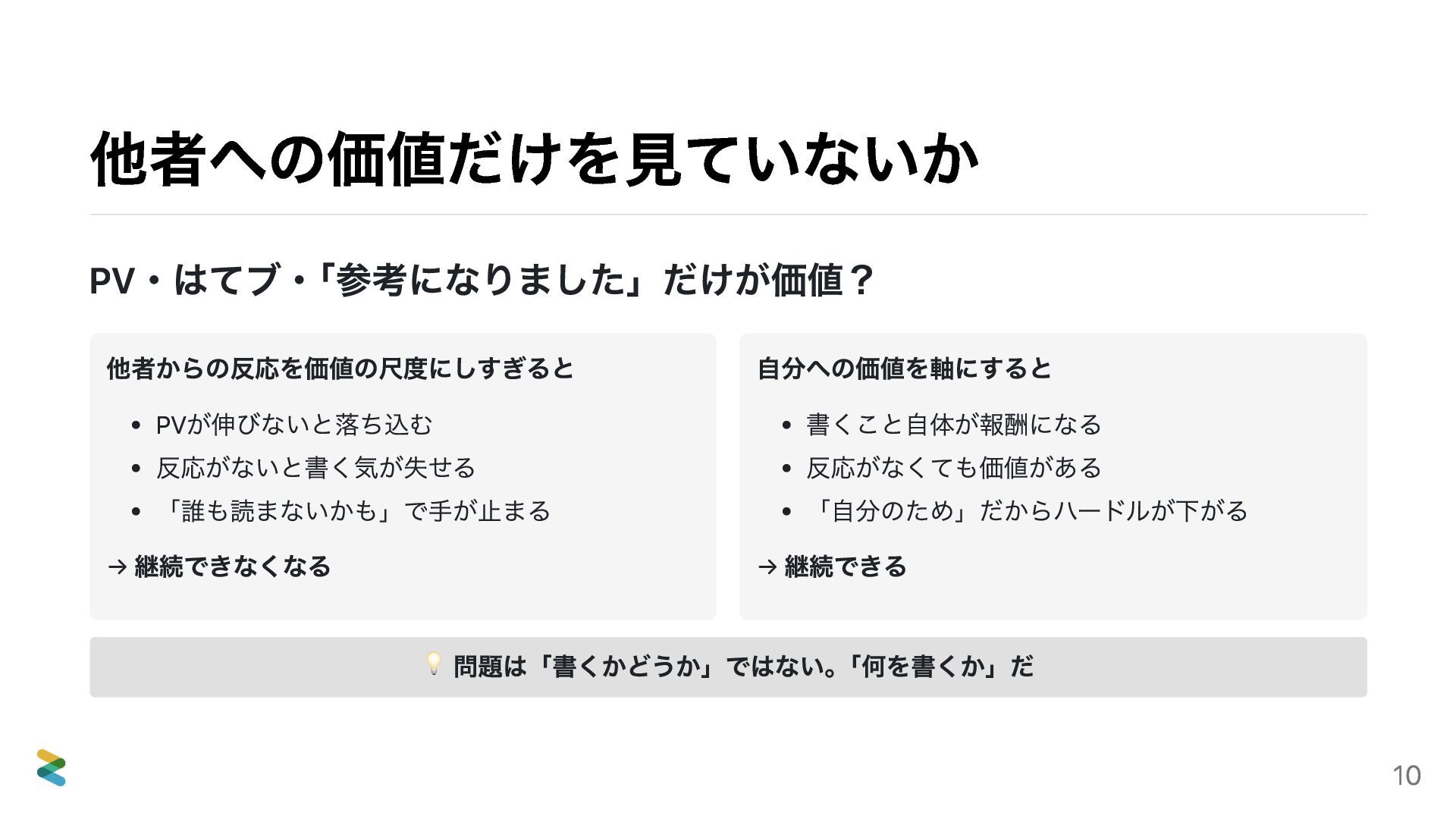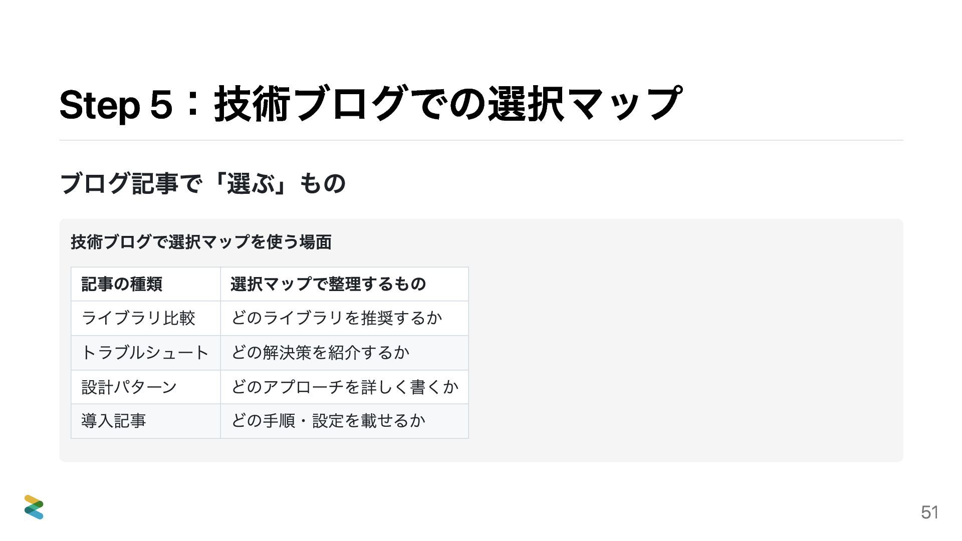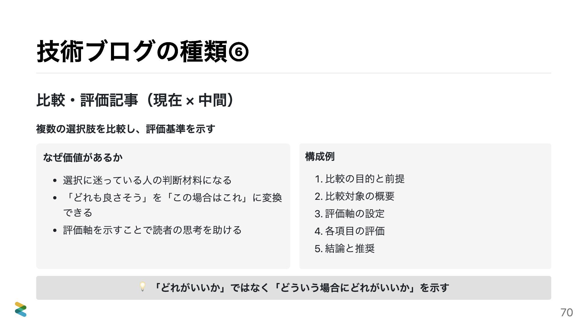 技術ブログの種類⑥ 比較・評価記事(現在 × 中間) 複数の選択肢を比較し、評価基準を示す なぜ価値があるか 選択に迷っている人の判断材料になる 「どれも良さそう」を「この場合はこれ」に変換 できる 評価軸を示すことで読者の思考を助ける