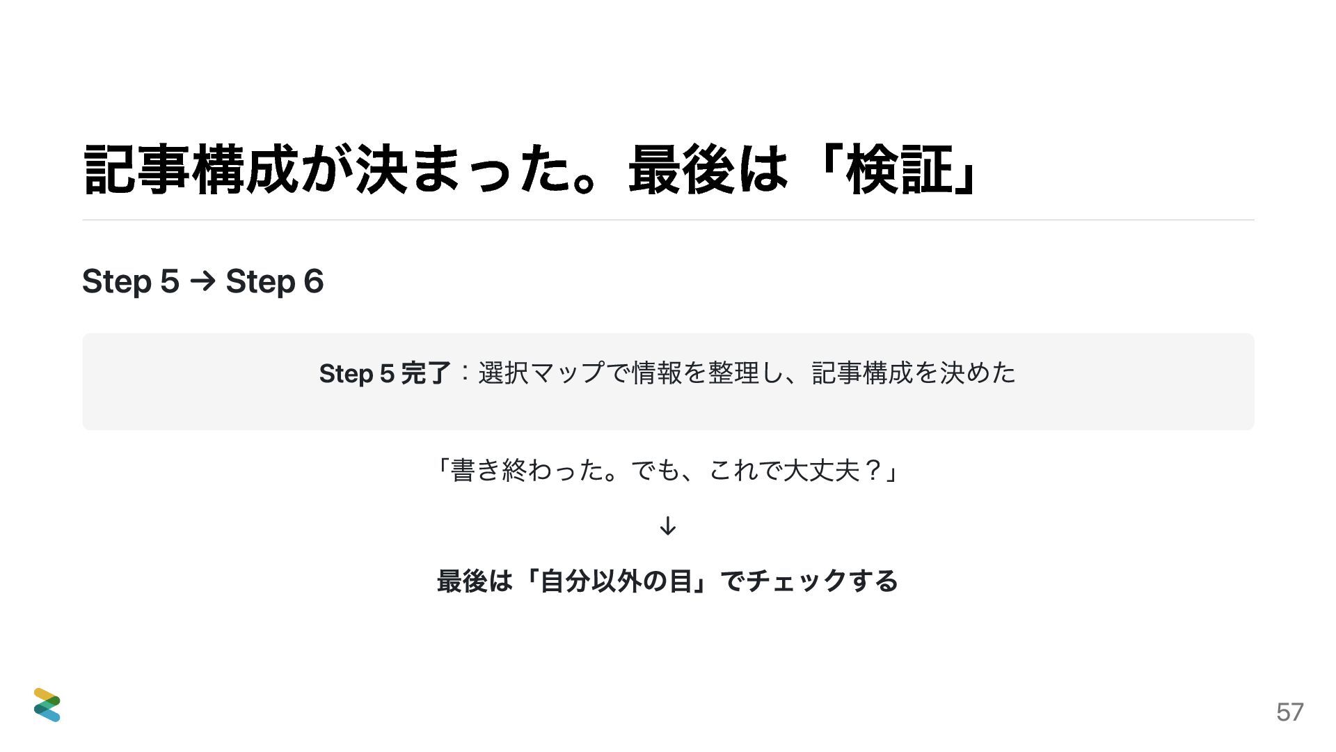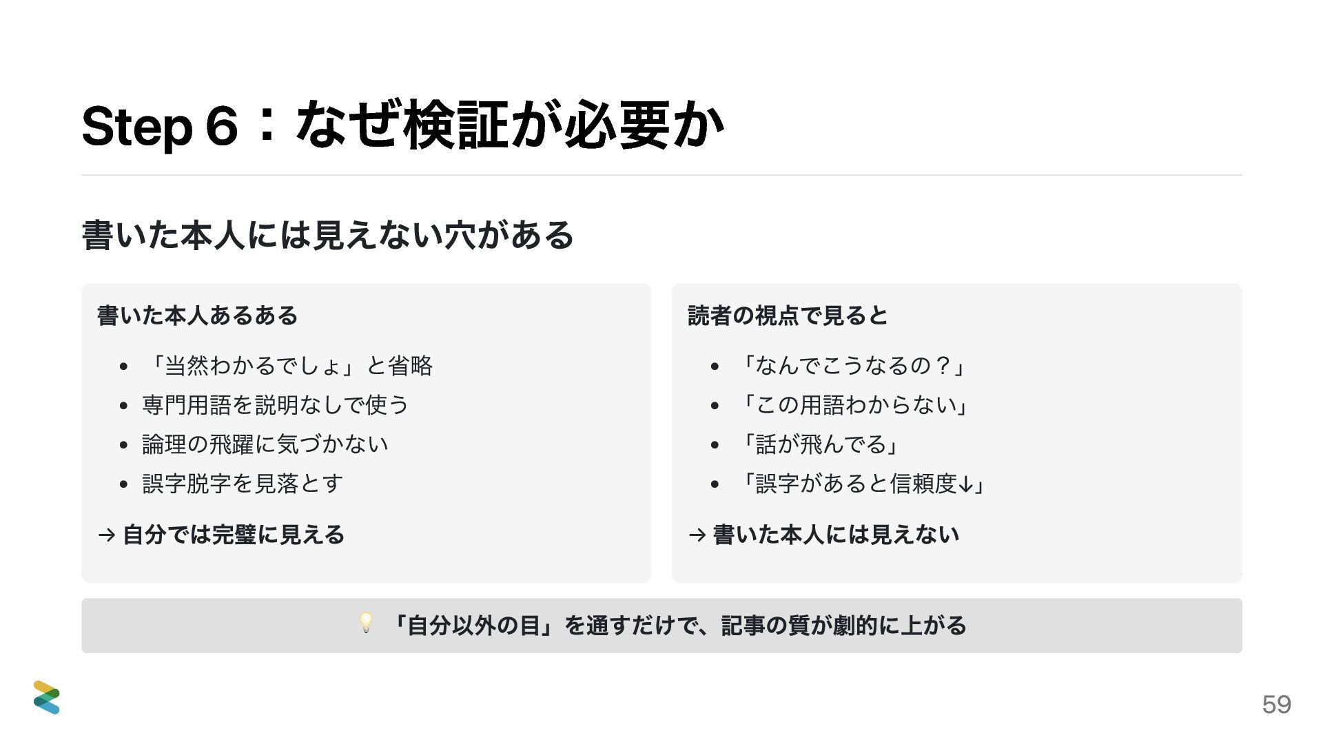 Step 6:なぜ検証が必要か 書いた本人には見えない穴がある 書いた本人あるある 「当然わかるでしょ」と省略 専門用語を説明なしで使う 論理の飛躍に気づかない 誤字脱字を見落とす → 自分では完璧に見える