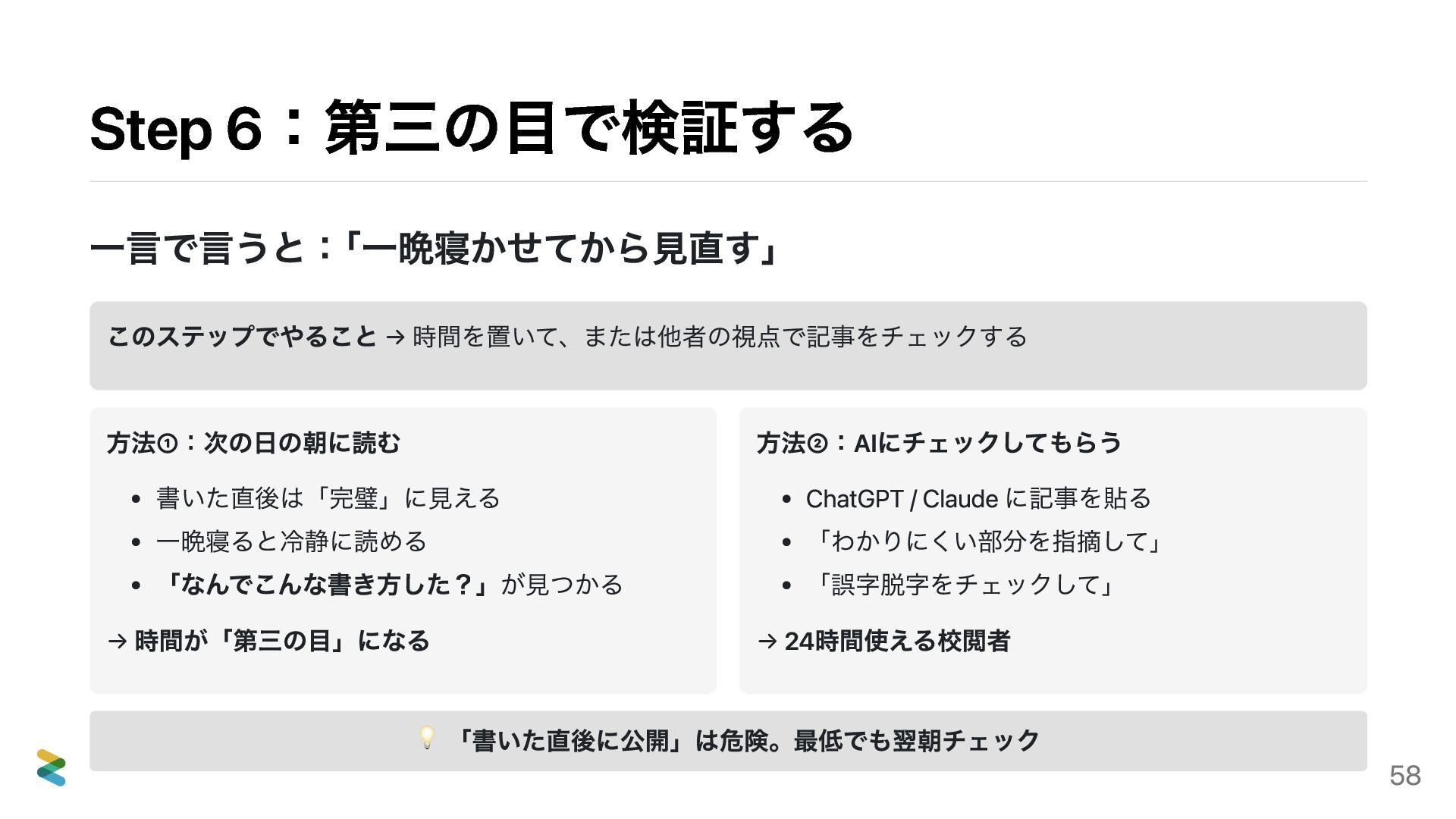 Step 6:第三の目で検証する 一言で言うと: 「一晩寝かせてから見直す」 このステップでやること → 時間を置いて、または他者の視点で記事をチェックする 方法①:次の日の朝に読む 書いた直後は「完璧」に見える 一晩寝ると冷静に読める