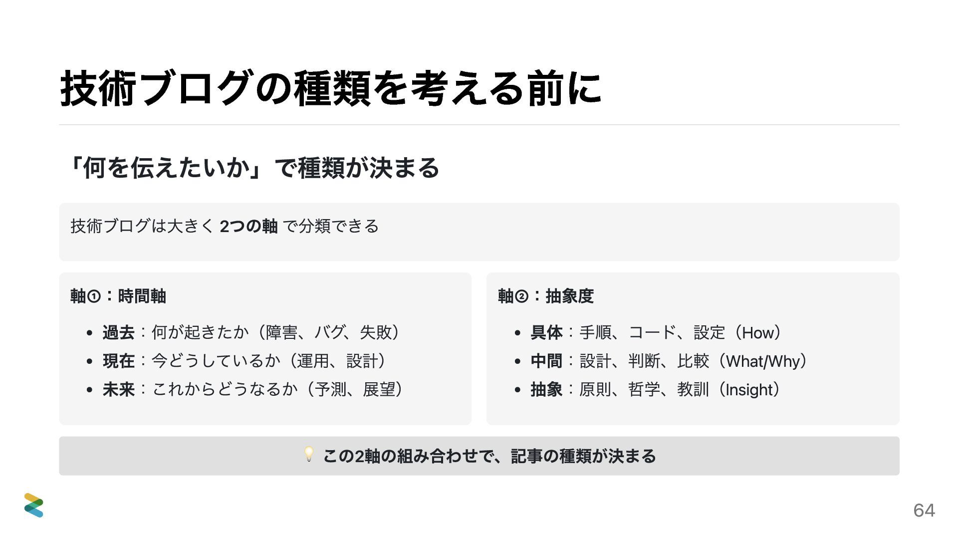 技術ブログの種類を考える前に 「何を伝えたいか」で種類が決まる 技術ブログは大きく 2つの軸 で分類できる 軸①:時間軸 過去:何が起きたか(障害、バグ、失敗) 現在:今どうしているか(運用、設計) 未来:これからどうなるか(予測、展望) 軸②:抽象度